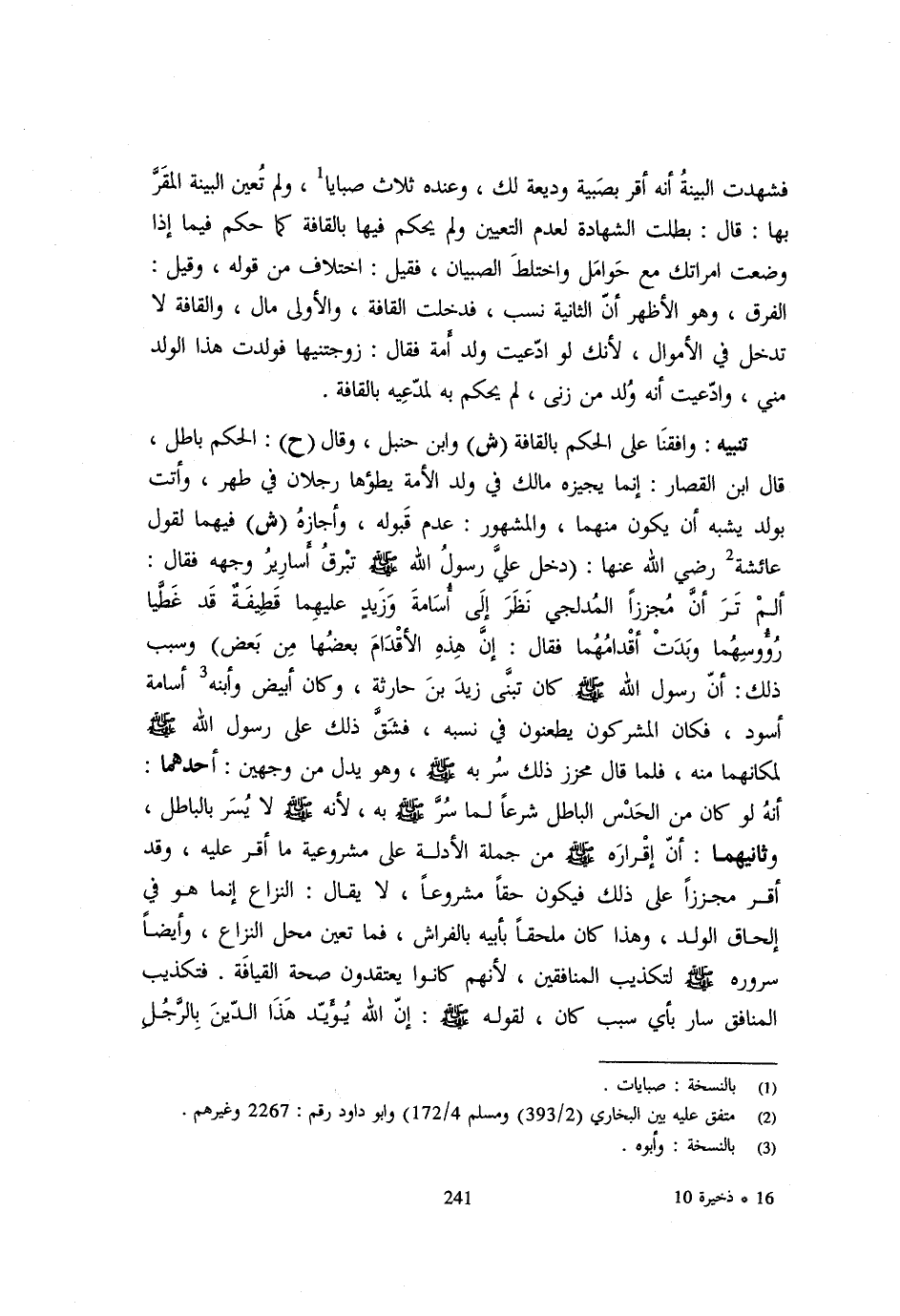 فَشَهِدَتِ الْبَيِّنَةُ أَنَّهُ أَقَرَّ بِصَبِيَّةٍ وَدِيعَةً لَكَ وَعِنْدَهُ ثَلَاثُ صَبَايَا وَلَمْ تُعَيِّنِ الْبَيِّنَةُ الْمُقَرَّ بِهَا قَالَ بَطَلَتِ الشَّهَادَةُ لِعَدَمِ التَّعْيِينِ وَلَمْ يُحْكَمْ فِيهَا بِالْقَافَةِ كَمَا حُكِمَ فِيمَا إِذَا وَضَعَتِ امْرَأَتُكَ مَعَ حَوَامِلَ وَاخْتَلَطَ الصِّبْيَانُ فَقِيلَ اخْتِلَافٌ مِنْ قَوْلِهِ وَقِيلَ الْفَرْقُ وَهُوَ الْأَظْهَرُ ان الثَّانِيَة نسب فَدخلت الْقَافة والاول مَالٌ وَالْقَافَةُ لَا تَدْخُلُ فِي الْأَمْوَالِ لِأَنَّكَ لَو ادعيت ولد أمة فَقَالَ زوجتنيها فَولدت هَذَا الْوَلَدَ مِنِّي وَادَّعَيْتَ أَنَّهُ وُلِدَ مِنْ زِنًى لَمْ يُحْكَمْ بِهِ لِمُدَّعِيهِ بِالْقَافَةِ تَنْبِيهٌ وَافَقْنَا عَلَى الْحُكْمِ بِالْقَافَةِ ش وَابْنَ حَنْبَلٍ وَقَالَ ح الْحُكْمُ بَاطِلٌ قَالَ ابْنُ الْقَصَّارِ إِنَّمَا يُجِيزُهُ مَالِكٌ فِي وَلَدِ الْأَمَةِ يَطَؤُهَا رَجُلَانِ فِي طُهْرٍ وَأَتَتْ بِوَلَدٍ يُشْبِهُ أَنْ يَكُونَ مِنْهُمَا وَالْمَشْهُورُ عَدَمُ قَبُولِهِ وَأَجَازَهُ ش فيهمَا لِقَوْلِ عَائِشَةُ رَضِيَ اللَّهُ عَنْهَا دَخَلَ عَلَى رَسُولِ اللَّهِ - صَلَّى اللَّهُ عَلَيْهِ وَسَلَّم َ - تبرق اسارير وَجهه فَقَالَ الم تَرَ أنَّ مُجَزَّزًا الْمُدْلِجِيَّ نَظَرَ إِلَى أُسَامَةَ وَزَيْدٍ عَلَيْهِمَا قطيفة قد غطيا رؤوسهما وَبَدَتْ أَقْدَامُهُمَا فَقَالَ إِنَّ هَذِهِ الْأَقْدَامَ بَعْضُهَا مِنْ بَعْضٍ وَسَبَبُ ذَلِكَ أَنَّ رَسُولَ اللَّهِ - صَلَّى اللَّهُ عَلَيْهِ وَسَلَّم َ - كَانَ تَبَنَّى زَيْدَ بْنَ حَارِثَةَ وَكَانَ أَبْيَضَ وَابْنُهُ أُسَامَةُ أَسْوَدَ فَكَانَ الْمُشْرِكُونَ يَطْعَنُونَ فِي نَسَبِهِ فَشَقَّ ذَلِكَ عَلَى رَسُولِ اللَّهِ - صَلَّى اللَّهُ عَلَيْهِ وَسَلَّم َ - لمكانهما مِنْهُ فَلَمَّا قَالَ محزز ذَلِكَ سُرَّ بِهِ - صَلَّى اللَّهُ عَلَيْهِ وَسَلَّم َ - وَهُوَ يَدُلُّ مِنْ وَجْهَيْنِ أَحَدُهُمَا أَنَّهُ لَوْ كَانَ مِنَ الْحَدْسِ الْبَاطِلِ شَرْعًا لَمَا سُرَّ - صَلَّى اللَّهُ عَلَيْهِ وَسَلَّم َ - بِهِ لِأَنَّهُ - صَلَّى اللَّهُ عَلَيْهِ وَسَلَّم َ - لَا يُسَرُّ بِالْبَاطِلِ وَثَانِيهُمَا أَنَّ إِقْرَارَهُ - صَلَّى اللَّهُ عَلَيْهِ وَسَلَّم َ - مِنْ جُمْلَةِ الْأَدِلَّةِ عَلَى مَشْرُوعِيَّةِ مَا أَقَرَّ عَلَيْهِ وَقَدْ أَقَرَّ مُجَزَّزًا عَلَى ذَلِكَ فَيَكُونُ حَقًّا مَشْرُوعًا لَا يُقَالُ النِّزَاعُ إِنَّمَا هُوَ فِي إِلْحَاقِ الْوَلَدِ وَهَذَا كَانَ مُلْحَقًا بِأَبِيهِ بِالْفِرَاشِ فَمَا تَعَيَّنَ مَحَلُّ النِّزَاعِ وَأَيْضًا سُرُورُهُ - صَلَّى اللَّهُ عَلَيْهِ وَسَلَّم َ - لِتَكْذِيبِ الْمُنَافِقِينَ لِأَنَّهُمْ كَانُوا يَعْتَقِدُونَ صِحَّةَ الْقِيَافَةِ فَتَكْذِيبُ الْمُنَافِقِ سَارٌّ بِأَيِّ سَبَبٍ كَانَ لِقَوْلِهِ - صَلَّى اللَّهُ عَلَيْهِ وَسَلَّم َ - إِنَّ اللَّهَ يُؤَيِّدُ هَذَا الدِّينَ بِالرَّجُلِ