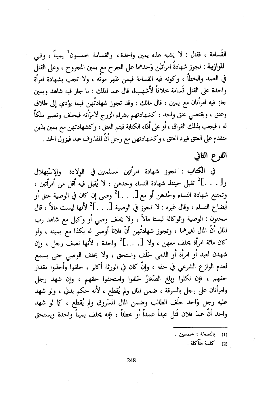الْقَسَامَةِ فَقَالَ لَا يُشْبِهُ هَذِهِ يَمِينٌ وَاحِدَةٌ وَالْقَسَامَةُ خَمْسُونَ يَمِينًا وُفِي الْمَوَّازِيَّةِ تَجُوزُ شَهَادَةُ امْرَأَتَيْنِ وَحْدَهَمَا عَلَى الْجَرْحِ مَعَ يَمِينِ الْمَجْرُوحِ وَعَلَى الْقَتْلِ فِي الْعَمْدِ وَالْخَطَأِ وَكَوْنِهِ فِيهِ الْقَسَامَةُ فِيمَنْ ظَهَرَ مَوْتُهُ وَلَا تَجِبُ بِشَهَادَةِ امْرَأَةٍ وَاحِدَةٍ عَلَى الْقَتْلِ قَسَامَةٌ خِلَافًا لِأَشْهَبَ قَالَ عَبْدُ الْمَلِكِ مَا جَازَ فِيهِ شَاهِدٌ وَيَمِينٌ جَازَ فِيهِ امْرَأَتَانِ مَعَ يَمِينٍ قَالَ مَالِكٌ وَقَدْ تَجُوزُ شَهَادَتُهُنَّ فِيمَا يُؤَدِّي إِلَى طَلَاق وَعتق وَيَقْتَضِي عتق وَاحِد كشهادتهم بِشِرَاءِ الزَّوْجِ لِامْرَأَتِهِ فَيَحْلِفُ وَتَصِيرُ مِلْكًا لَهُ فَيَجِبُ بِذَلِكَ الْفِرَاقُ أَوْ عَلَى أَدَاءِ الْكِتَابَةِ فَيتم الْعتْق وكشهاتهن مَعَ يَمِينٍ بِدَيْنٍ مُتَقَدِّمٍ عَلَى الْعِتْقِ فَيُرَدُّ الْعِتْقُ وَكَشَهَادَتِهِنَّ مَعَ رَجُلٍ أَنَّ الْمَقْذُوفَ عَبْدٌ فيزول الْحَد
