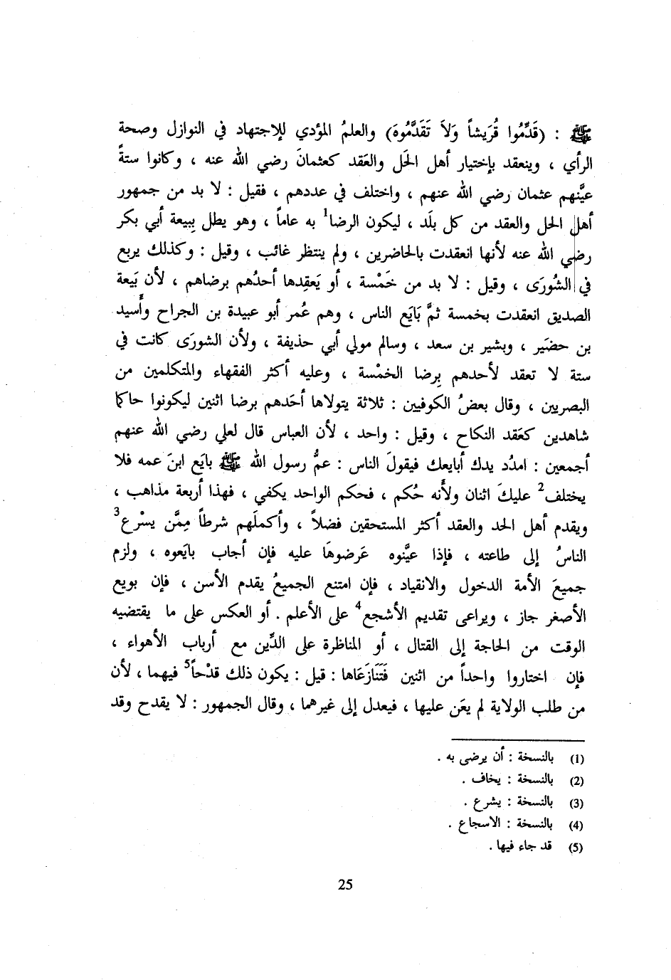 - صَلَّى اللَّهُ عَلَيْهِ وَسَلَّم َ - قدمُوا قُريْشًا وَلَا تقدموه وَالْعِلْمُ الْمُؤَدِّي لِلِاجْتِهَادِ فِي النَّوَازِلِ وَصِحَّةِ الرَّأْيِ وَيَنْعَقِدُ بِاخْتِيَارِ أَهْلِ الْحَلِّ وَالْعَقْدِ كَعُثْمَانَ رَضِيَ اللَّهُ عَنْهُ وَكَانُوا سِتَّةً عَيَّنَهُمْ عُثْمَانُ رَضِيَ اللَّهُ عَنْهُمْ وَاخْتُلِفَ فِي عَدَدِهِمْ فَقِيلَ لَا بُدَّ مِنْ جُمْهُورِ أَهْلِ الْحَلِّ وَالْعَقْدِ مِنْ كُلِّ بَلَدٍ لِيَكُونَ الرِّضَا بِهِ عَامًّا وَهُوَ يطلّ بِبَيْعَةِ أَبِي بَكْرٍ رَضِيَ اللَّهُ عَنْهُ لِأَنَّهَا انْعَقَدَتْ بِالْحَاضِرِينَ وَلَمْ يُنْتَظَرْ غَائِبٌ وَقِيلَ وَكَذَلِكَ يُرَبَّعُ فِي الشُورَى وَقِيلَ لَا بُدَّ مِنْ خَمْسَةٍ أَوْ يَعْقِدُهَا أَحَدُهُمْ بِرِضَاهُمْ لِأَنَّ بَيْعَةَ الصِّدِّيقِ انْعَقَدَتْ بِخَمْسَةٍ ثُمَّ بَايَعَ النَّاسُ وَهُمْ عمر ابو عُبَيْدَةَ بْنُ الْجَرَّاحِ وَأُسَيْدُ بْنُ حُضَيْرٍ وَبَشِيرُ بْنُ سَعْدٍ وَسَالِمٌ مَوْلَى أَبِي حُذَيْفَةَ وَلِأَنَّ الشُّورَى كَانَتْ فِي سِتَّةٍ لَا تُعْقَدُ لِأَحَدِهِمْ بِرِضَا الْخَمْسَةِ وَعَلَيْهِ أَكْثَرُ الْفُقَهَاءِ وَالْمُتَكَلِّمِينَ مِنَ الْبَصْرِيِّينَ وَقَالَ بَعْضُ الْكُوفِيِّينَ ثَلَاثَةٌ يَتَوَلَّاهَا أَحَدُهُمْ بِرِضَا اثْنَيْنِ لِيَكُونُوا حَاكَمَا شَاهِدَيْنِ كَعَقْدِ النِّكَاحِ وَقِيلَ وَاحِدٌ لِأَنَّ الْعَبَّاسَ قَالَ لِعَلِيٍّ رَضِيَ اللَّهُ عَنْهُمْ أَجْمَعِينَ امْدُدْ يَدَكَ أُبَايِعْكَ فَيَقُولُ النَّاسُ عَمُّ رَسُولِ اللَّهِ - صَلَّى اللَّهُ عَلَيْهِ وَسَلَّم َ - بَايَعَ ابْنَ عَمِّهِ فَلَا يَخْتَلِفُ عَلَيْكَ اثْنَانِ وَلِأَنَّهُ حُكْمٌ فَحُكْمُ الْوَاحِدِ يَكْفِي فَهَذَا أَرْبَعَةُ مَذَاهِب وَيقدم أهل الْحَد وَالْعَقْدِ أَكْثَرَ الْمُسْتَحِقِّينَ فَضْلًا وَأَكْمَلَهُمْ شَرْطًا مِمَّنْ يُسْرِعُ النَّاسُ إِلَى طَاعَتِهِ فَإِذَا عَيَّنُوهُ عَرَضُوهَا عَلَيْهِ فَإِنْ أَجَابَ بَايَعُوهُ وَلَزِمَ جَمِيعَ الْأُمَّةِ الدُّخُولُ وَالِانْقِيَادُ فَإِنِ امْتَنَعَ الْجَمِيعُ يُقَدَّمُ الْأَسَنُّ فَإِنْ بُويِعَ الْأَصْغَرُ جَازَ وَيُرَاعَى تَقْدِيمُ الْأَشْجَعِ عَلَى الْأَعْلَمِ أَوِ الْعَكْسُ عَلَى مَا يَقْتَضِيهِ الْوَقْت من الْحَاجة إِلَى الْقِتَال أَو المناضرة عَلَى الدِّينِ مَعَ أَرْبَابِ الْأَهْوَاءِ فَإِنِ اخْتَارُوا وَاحِدًا مِنَ اثْنَيْنِ فَتَنَازَعَاهَا قِيلَ يَكُونُ ذَلِكَ قَدْحًا فِيهِمَا لِأَنَّ مَنْ طَلَبَ الْوِلَايَةَ لَمْ يُعَنْ عَلَيْهَا فَيُعْدَلُ إِلَى غَيْرِهِمَا وَقَالَ الْجُمْهُورُ لَا يَقْدَحُ وَقَدْ