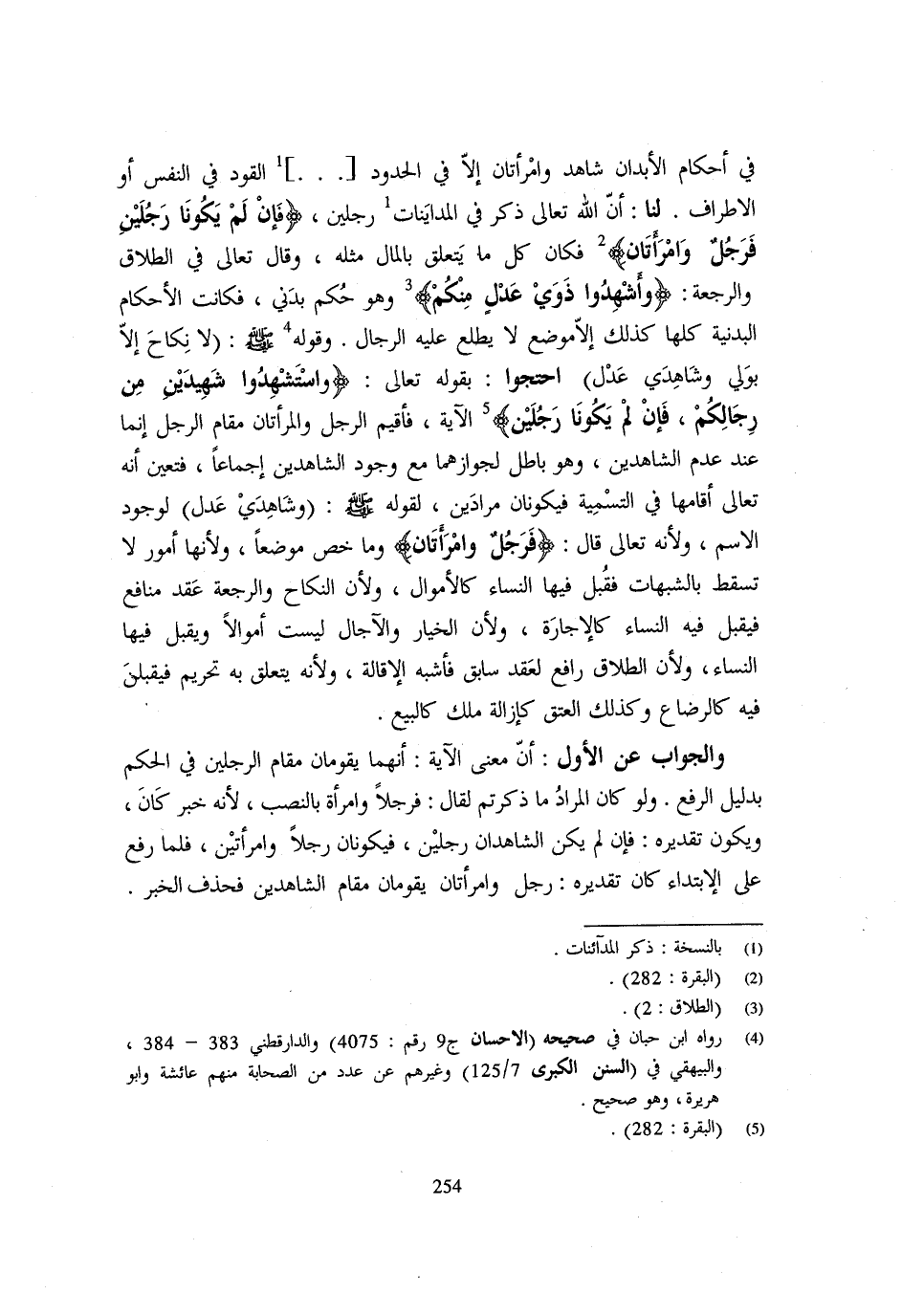 فِي أَحْكَامِ الْأَبْدَانِ شَاهِدٌ وَامْرَأَتَانِ إِلَّا فِي الْحُدُود الْقود فِي النَّفْسِ أَوِ الْأَطْرَافِ لَنَا أَنَّ اللَّهَ تَعَالَى ذَكَرَ فِي الْمُدَايَنَاتِ رَجُلَيْنِ {فَإِنْ لَمْ يَكُونَا رجلَيْنِ فَرجل وَامْرَأَتَانِ} فَكَانَ كُلُّ مَا يَتَعَلَّقُ بِالْمَالِ مِثْلَهُ وَقَالَ تَعَالَى فِي الطَّلَاقِ وَالرَّجْعَةِ {وَأَشْهِدُوا ذَوَيْ عَدْلٍ مِنْكُم} وَهُوَ حُكْمٌ بَدَنِيٌّ فَكَانَتِ الْأَحْكَامُ الْبَدَنِيَّةُ كُلُّهَا كَذَلِك الا مَوضِع لَا يَطَّلِعُ عَلَيْهِ الرِّجَالُ وَقَوْلُهُ - صَلَّى اللَّهُ عَلَيْهِ وَسَلَّم َ - لَا نِكَاحَ إِلَّا بِوَلِيٍّ وَشَاهِدَيْ عَدْلٍ احْتَجُّوا بِقَوْلِهِ تَعَالَى {وَاسْتَشْهِدُوا شَهِيدَيْنِ مِنْ رِجَالِكُمْ فَإِنْ لم يَكُونَا رجلَيْنِ} الاية فاقيم الرجل والمراتان مقَام الرجل انما عِنْدَ عَدَمِ الشَّاهِدِينَ وَهُوَ بَاطِلٌ لِجَوَازِهِمَا مَعَ وجود الشَّاهِدين اجماعا فَتعين أَنه تَعَالَى اقامها فِي التَّسْمِيَةِ فَيَكُونَانِ مُرَادَيْنِ لِقَوْلِهِ - صَلَّى اللَّهُ عَلَيْهِ وَسَلَّم َ - وَشَاهِدَيْ عَدْلٍ لِوُجُودِ الِاسْمِ وَلِأَنَّهُ تَعَالَى قَالَ {فَرجل وَامْرَأَتَانِ} وَمَا خَصَّ مَوْضِعًا وَلِأَنَّهَا أُمُورٌ لَا تَسْقُطُ بِالشُّبُهَاتِ فَقُبِلَ فِيهَا النِّسَاءُ كَالْأَمْوَالِ وَلِأَنَّ النِّكَاحَ وَالرَّجْعَةَ عَقْدُ مَنَافِعٍ فَيُقْبَلُ فِيهِ النِّسَاءُ كَالْإِجَارَةِ وَلِأَنَّ الْخِيَارَ وَالْآجَالَ لَيْسَتْ أَمْوَالًا وَيُقْبَلُ فِيهَا النِّسَاءُ وَلِأَنَّ الطَّلَاقَ رَافِعٌ لِعَقْدٍ سَابِقٍ فَأَشْبَهَ الْإِقَالَةَ وَلِأَنَّهُ يَتَعَلَّقُ بِهِ تَحْرِيمٌ فَيُقْبَلْنَ فِيهِ كالرضاع وَكَذَلِكَ الْعتْق كازالة مِلْكٍ كَالْبَيْعِ وَالْجَوَابُ عَنِ الْأَوَّلِ أَنَّ مَعْنَى الْآيَةِ أَنَّهُمَا يَقُومَانِ مَقَامَ الرَّجُلَيْنِ فِي الْحُكْمِ بِدَلِيلِ الرَّفْعِ وَلَوْ كَانَ الْمُرَادُ مَا ذَكَرْتُمْ لَقَالَ فَرَجُلًا وَامْرَأَةً بِالنَّصْبِ لِأَنَّهُ خَبَرُ كَانَ وَيَكُونُ تَقْدِيرُهُ فَإِنْ لَمْ يَكُنِ الشَّاهِدَانِ رَجُلَيْنِ فَيَكُونَانِ رَجُلًا وَامْرَأَتَيْنِ فَلَمَّا رُفِعَ عَلَى الِابْتِدَاءِ كَانَ تَقْدِيرُهُ رَجُلٌ وَامْرَأَتَانِ يَقُومَانِ مَقَامَ الشَّاهِدَيْنِ فَحذف الْخَبَر
