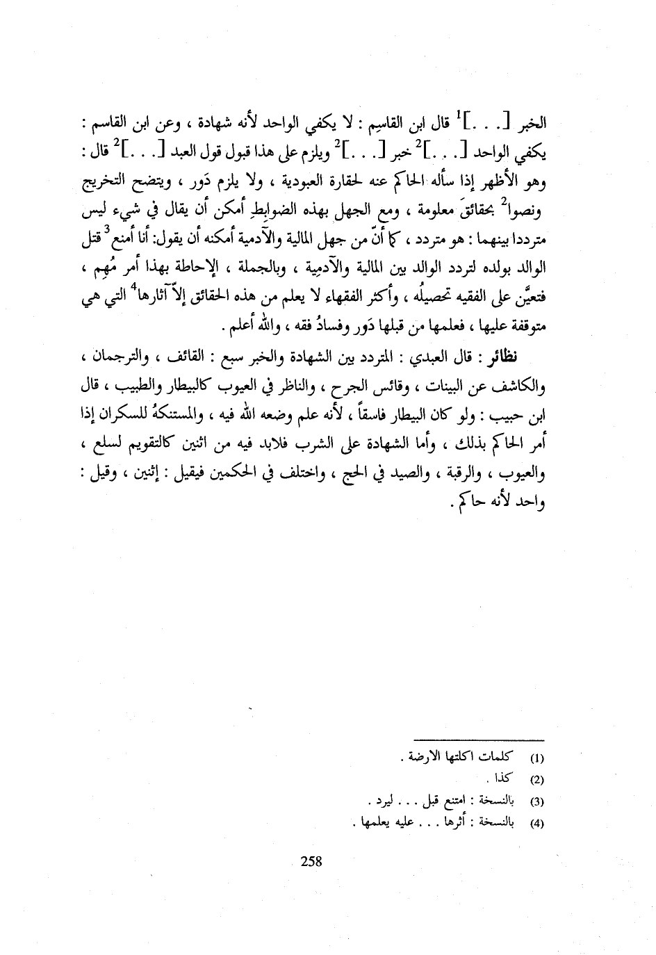 الْخَبَر قَالَ ابْنُ الْقَاسِمِ لَا يَكْفِي الْوَاحِدُ لِأَنَّهُ شَهَادَة وَعَن ابْن الْقَاسِم يَكْفِي الْوَاحِد خبر وَيلْزم على هَذَا قبُول قَول العَبْد قَالَ وَهُوَ الْأَظْهَرُ إِذَا سَأَلَهُ الْحَاكِمُ عَنْهُ لحقارة الْعُبُودِيَّة وَلَا يلْزم دور ويتضح التَّخْرِيج ونصو بِحَقَائِقَ مَعْلُومَةٍ وَمَعَ الْجَهْلِ بِهَذِهِ الضَّوَابِطِ أَمْكَنَ أَنْ يُقَالَ فِي شَيْءٍ لَيْسَ مُتَرَدِّدًا بَيْنَهُمَا هُوَ مُتَرَدِّدٌ كَمَا أَنَّ مَنْ جَهِلَ الْمَالِيَّةَ وَالْآدَمِيَّةَ أَمْكَنَهُ أَنْ يَقُولَ أَنَا أَمْنَعُ قَتْلَ الْوَالِدِ بِوَلَدِهِ لِتَرَدُّدِ الْوَالِدِ بَيْنَ الْمَالِيَّةِ وَالْآدَمِيَّةِ وَبِالْجُمْلَةِ الْإِحَاطَةُ بِهَذَا أَمْرٌ مُهِمٌّ فَتَعَيَّنَ عَلَى الْفَقِيهِ تَحْصِيلُهُ وَأَكْثَرُ الْفُقَهَاءِ لَا يَعْلَمُ مِنْ هَذِهِ الْحَقَائِقِ إِلَّا آثَارَهَا الَّتِي هِيَ مُتَوَقِّفَةٌ عَلَيْهَا فَعِلْمُهَا مِنْ قَبْلِهَا دَوْرٌ وَفَسَادُ فَقِهٍ وَاللَّهُ أَعْلَمُ نَظَائِرُ قَالَ الْعَبْدِيُّ الْمُتَرَدِّدُ بَيْنَ الشَّهَادَةِ وَالْخَبَرِ سبع الْقَائِفُ وَالتُّرْجُمَانُ وَالْكَاشِفُ عَنِ الْبَيِّنَاتِ وَقَائِسُ الْجُرْحِ وَالنَّاظِرُ فِي الْعُيُوبِ كَالْبَيْطَارِ وَالطَّبِيبِ قَالَ ابْنُ حَبِيبٍ وَلَوْ كَانَ الْبَيْطَارُ فَاسِقًا لِأَنَّهُ عِلْمٌ وَضَعَهُ اللَّهُ فِيهِ وَالْمُسْتَنْكِةُ لِلسَّكْرَانِ إِذَا أَمَرَ الْحَاكِمُ بِذَلِكَ وَأَمَّا الشَّهَادَةُ عَلَى الشُّرْبِ فَلَا بُد فِيهِ من اثْنَيْنِ كالتقويم لسلع وَالْعُيُوبِ وَالرَّقَبَةِ وَالصَّيْدِ فِي الْحَجِّ وَاخْتُلِفَ فِي الْحكمَيْنِ فيقيل اثْنَيْنِ وَقِيلَ وَاحِدٌ لِأَنَّهُ حَاكِمٌ