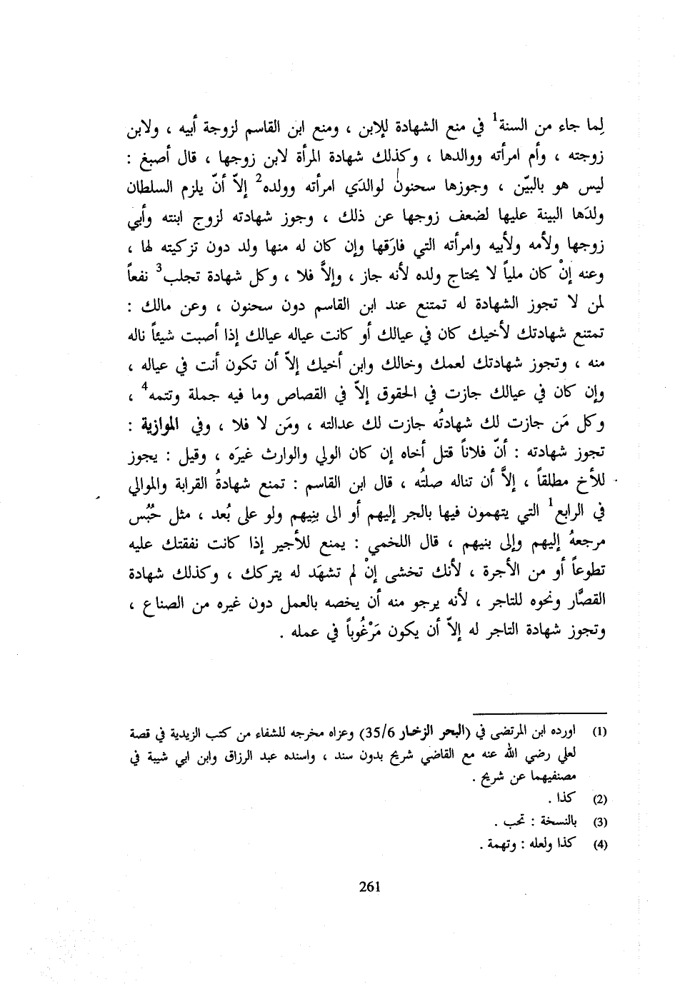 لِمَا جَاءَ مِنَ السُّنَةِ فِي مَنْعِ الشَّهَادَةِ لِلِابْنِ وَمَنْعِ ابْنِ الْقَاسِمِ لِزَوْجَةِ أَبِيهِ وَلِابْنِ زَوْجَتِهِ وَأُمِّ امْرَأَتِهِ وَوَالِدِهَا وَكَذَلِكَ شَهَادَةُ الْمَرْأَةِ لِابْنِ زَوْجِهَا قَالَ أَصْبَغُ لَيْسَ هُوَ بِالْبَيِّنِ وجوزها سَحْنُون لوالدي أمراته وَولده إِلَّا أَنْ يُلْزِمَ السُّلْطَانُ وَلَدَهَا الْبَيِّنَةَ عَلَيْهَا لِضَعْفِ زَوْجِهَا عَنْ ذَلِكَ وَجَوَّزَ شَهَادَتَهَ لِزَوْجِ ابْنَتِهِ وَأَبِي زَوْجِهَا وَلِأُمِّهِ وَلِأَبِيهِ وَامْرَأَتِهِ الَّتِي فَارَقَهَا وَإِنْ كَانَ لَهُ مِنْهَا وَلَدٌ دُونَ تَزْكِيَتِهِ لَهَا وَعَنْهُ إِنْ كَانَ مَلِيًّا لَا يحْتَاج وَلَده لِأَنَّهُ جَازَ وَإِلَّا فَلَا وَكُلُّ شَهَادَةٍ تَجْلِبُ نَفْعًا لِمَنْ لَا تَجُوزُ الشَّهَادَةُ لَهُ تَمْتَنِعُ عِنْدَ ابْنِ الْقَاسِمِ دُونَ سَحْنُونٍ وَعَنْ مَالِكٍ تَمْتَنِعُ شهادتك لاخيك كَانَ فِي عِيَالك اَوْ كَانَت عِيَالُهُ عِيَالَكَ إِذَا أَصَبْتَ شَيْئًا نَالَهُ مِنْهُ وَتَجُوزُ شَهَادَتُكَ لِعَمِّكَ وَخَالِكَ وَابْنِ أَخِيكَ إِلَّا أَنْ تَكُونَ أَنْتَ فِي عِيَالِهِ وَإِنْ كَانَ فِي عِيَالِكَ جَازَتْ فِي الْحُقُوقِ إِلَّا فِي الْقصاص وَمَا فِيهِ جملَة وتتمه وَكُلُّ مَنْ جَازَتْ لَكَ شَهَادَتُهُ جَازَتْ لَكَ عَدَالَتُهُ وَمَنْ لَا فَلَا وَفِي الْمَوَّازِيَّةِ تَجُوزُ شَهَادَتُهُ أَنَّ فُلَانًا قَتَلَ أَخَاهُ إِنْ كَانَ الْوَلِيّ وَالْوَارِث غَيره وَقيل يجوز لِلْأَخِ مُطْلَقًا إِلَّا أَنْ تَنَالَهُ صِلَتُهُ قَالَ ابْنُ الْقَاسِمِ تُمْنَعُ شَهَادَةُ الْقَرَابَةِ وَالْمَوَالِي فِي الرَّابِع الَّتِي يَتَّهِمُونَ فِيهَا بِالْجَرِّ إِلَيْهِمْ أَوْ إِلَى بَنِيهِمْ وَلَوْ عَلَى بُعْدٍ مِثْلَ حُبُسٍ مَرْجِعُهُ اليهم وَإِلَى بنيهم قَالَ اللَّخْمِيّ يمْنَع لِلْأَجِيرِ إِذَا كَانَتْ نَفَقَتُكَ عَلَيْهِ تَطَوُّعًا أَوْ مِنَ الْأُجْرَةِ لِأَنَّكَ تَخْشَى إِنْ لَمْ تَشْهَدْ لَهُ يتركك وَكَذَلِكَ شَهَادَة الْقصار وَنَحْوه للتاجر لِأَنَّهُ يَرْجُو مِنْهُ ان يخصمه بِالْعَمَلِ دُونَ غَيْرِهِ مِنَ الصُّنَّاعِ وَتَجُوزُ شَهَادَةُ التَّاجِر لَهُ إِلَّا أَنْ يَكُونَ مَرْغُوبًا فِي عَمَلِهِ