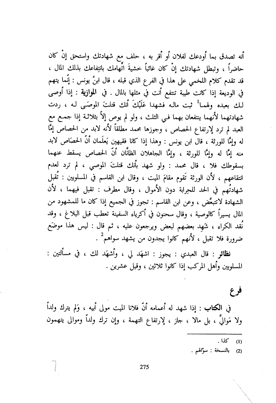 فِي الْكِتَابِ إِذَا شَهِدَ لَهُ أَعْمَامُهُ أَنَّ فُلَانًا الْمَيِّتَ مَوْلَى أَبِيهِ وَلَمْ يَتْرُكْ وَلَدًا وَلَا مَوَالِيَ بَلْ مَالًا جَازَ لِارْتِفَاعِ التُّهْمَةِ وَإِنْ تَرَكَ وَلَدًا وموالى يتهمون