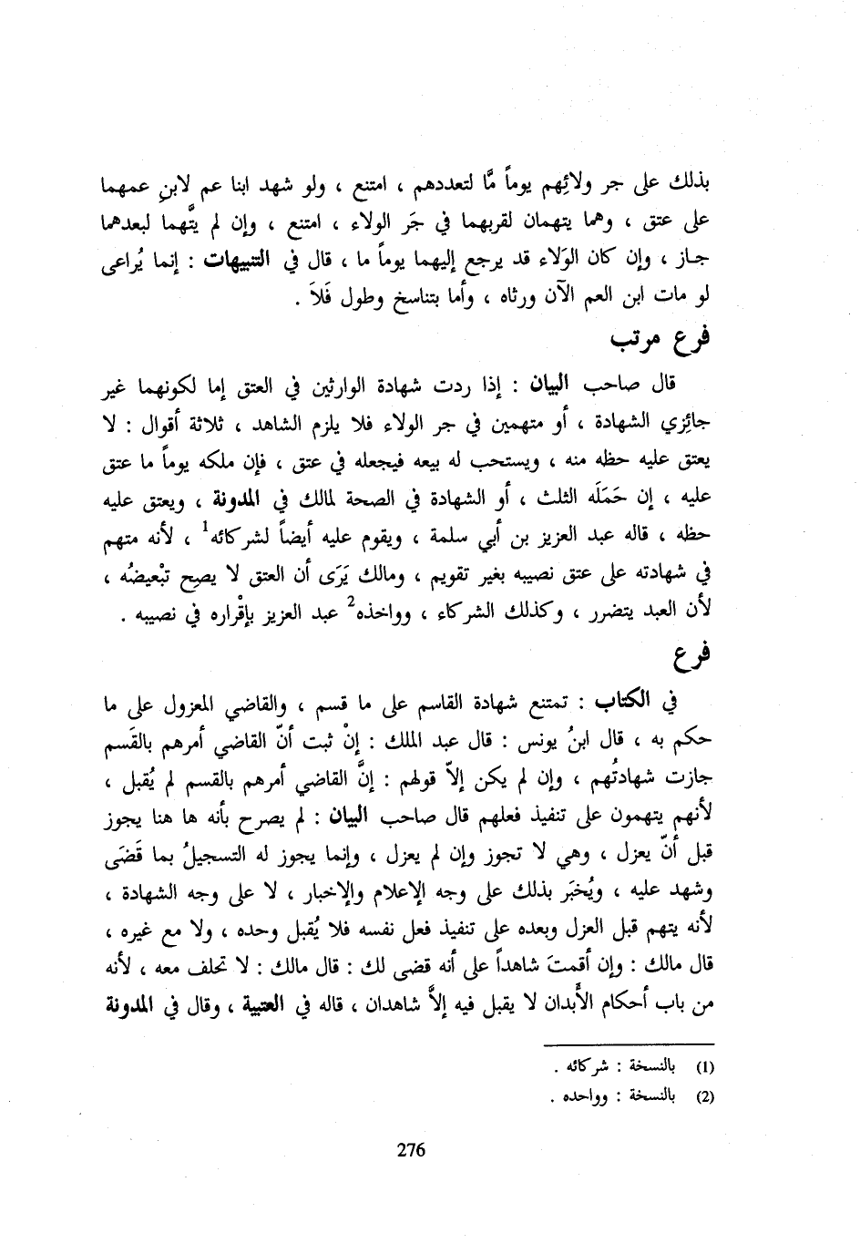 قَالَ صَاحِبُ الْبَيَانِ إِذَا رُدَّتْ شَهَادَةُ الْوَارِثَيْنِ فِي الْعِتْقِ إِمَّا لِكَوْنِهِمَا غَيْرَ جَائِزِيِ الشَّهَادَةِ أَوْ مُتَّهَمَيْنِ فِي جر الْوَلَاء فَلَا يَلْزَمُ الشَّاهِدَ ثَلَاثَةُ أَقْوَالٍ لَا يُعْتَقُ عَلَيْهِ حَظُّهُ مِنْهُ وَيُسْتَحَبُّ لَهُ بَيْعُهُ فَيَجْعَلُهُ فِي عِتْقٍ فَإِنْ مَلَكَهُ يَوْمًا مَا عُتِقَ عَلَيْهِ ان حمله الثُّلُث اَوْ الشَّهَادَة فِي الصِّحَّةِ لِمَالِكٍ فِي الْمُدَوَّنَةِ وَيُعْتَقُ عَلَيْهِ حَظُّهُ قَالَهُ عَبْدُ الْعَزِيزِ بْنُ أَبِي سَلَمَةَ وَيَقُومُ عَلَيْهِ أَيْضًا لِشُرَكَائِهِ لِأَنَّهُ مُتَّهَمٌ فِي شَهَادَتِهِ عَلَى عِتْقِ نَصِيبِهِ بِغَيْرِ تَقْوِيمٍ وَمَالِكٌ يَرَى أَنَّ الْعِتْقَ لَا يَصِحُّ تَبْعِيضُهُ لِأَنَّ الْعَبْدَ يَتَضَرَّرُ وَكَذَلِكَ الشُّرَكَاءُ وَوَاخَذَهُ عَبْدُ الْعَزِيزِ بِإِقْرَارِهِ فِي نَصِيبِهِ