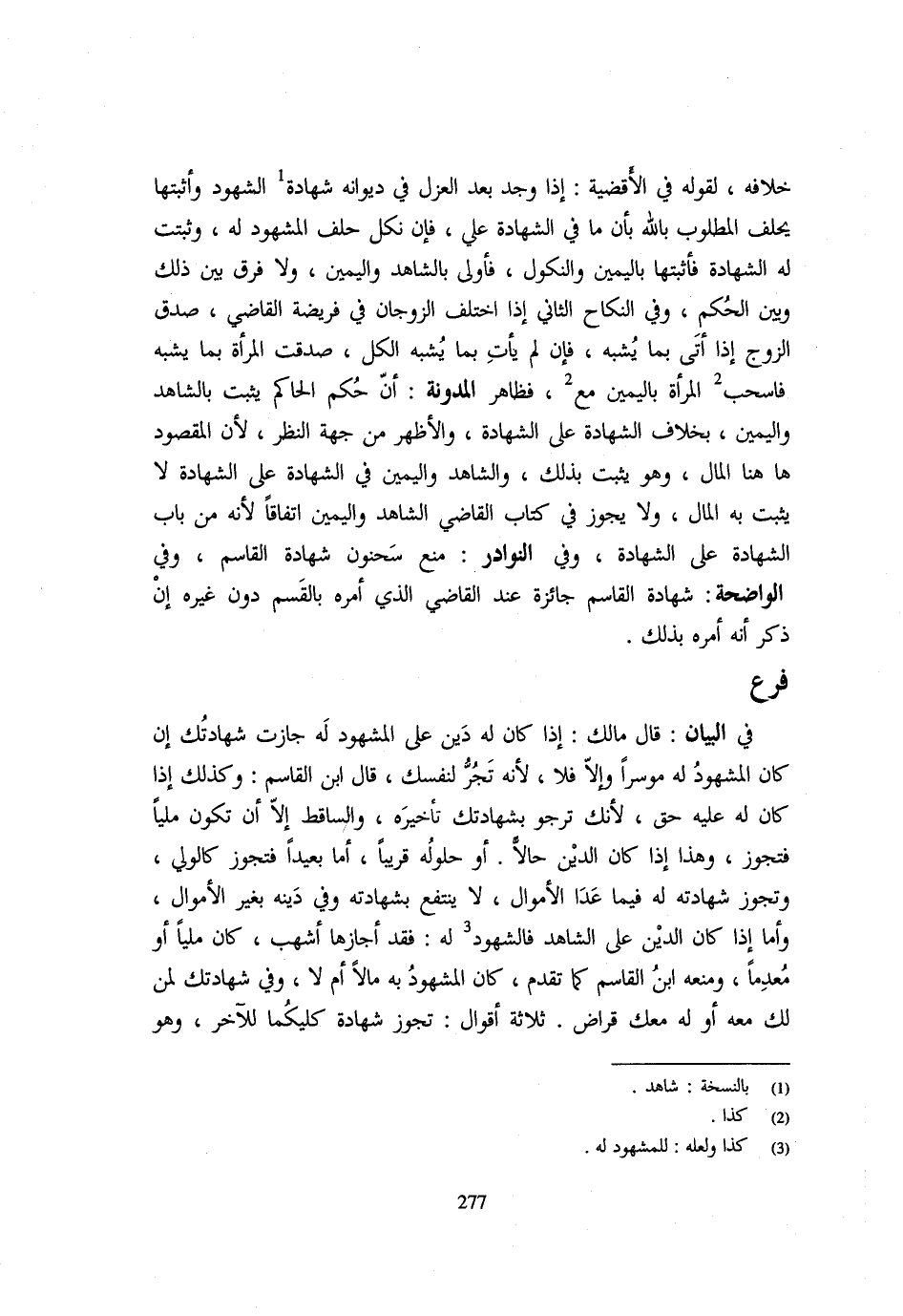 فِي الْبَيَانِ قَالَ مَالِكٌ إِذَا كَانَ لَهُ دَيْنٌ عَلَى الْمَشْهُودِ لَهُ جَازَت شهادتك إِنْ كَانَ الْمَشْهُودُ لَهُ مُوسِرًا وَإِلَّا فَلَا لِأَنَّهُ تَجُرُّ لِنَفْسِكَ قَالَ ابْنُ الْقَاسِمِ وَكَذَلِكَ إِذَا كَانَ لَهُ عَلَيْهِ حق لِأَنَّك ترجو بشهادتك تَأْخِيره والساقط إِلَّا أَنْ تَكُونَ مَلِيًّا فَتَجُوزُ وَهَذَا إِذَا كَانَ الدَّيْنُ حَالًا أَوْ حُلُولُهُ قَرِيبًا أَمَّا بَعِيدًا فَتَجُوزُ كَالْوَلِيِّ وَتَجُوزُ شَهَادَتُهُ لَهُ فِيمَا عدا الْأَمْوَال لَا يَنْتَفِعُ بِشَهَادَتِهِ وَفِي دَيْنِهِ بِغَيْرِ الْأَمْوَالِ واما إِذا كَانَ الدّين على الشَّاهِد فالشهود لَهُ فَقَدْ أَجَازَهَا أَشْهَبُ كَانَ مَلِيًّا أَوْ معدما وَمنعه ابْنُ الْقَاسِمِ كَمَا تَقَدَّمَ كَانَ الْمَشْهُودُ بِهِ مَالًا أَمْ لَا وَفِي شَهَادَتِكَ لِمَنْ لَكَ مَعَهُ أَوْ لَهُ مَعَكَ قِرَاضٌ ثَلَاثَةُ أَقْوَالٍ تَجُوزُ شَهَادَةُ كِلَيْكُمَا لِلْآخَرِ وَهُوَ