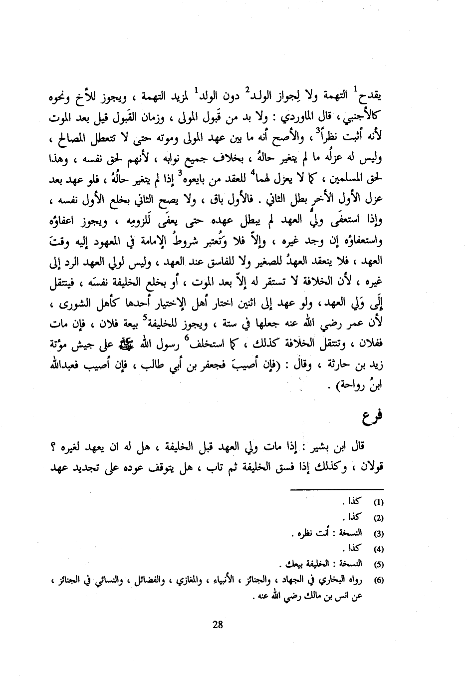 يقْدَح التهمه وَلَا لجَوَاز الْوَلَد دُونَ الْوَلَدِ لِمَزِيدِ التُّهْمَةِ وَيَجُوزُ لِلْأَخِ وَنَحْوِهُ كالاجنبي قَالَ المارودي وَلَا بُدَّ مِنْ قَبُولِ الْمُوَلَّى وَزَمَانُ الْقَبُولِ قِيلَ بَعْدَ الْمَوْتِ لِأَنَّهُ أَثْبَتُ نَظَرًا وَالْأَصَحُّ أَنَّهُ مَا بَيْنَ عَهْدِ الْمُوَلِّي وَمَوْتِهِ حَتَّى لَا تَتَعَطَّلَ الْمَصَالِحُ وَلَيْسَ لَهُ عَزْلُهُ مَا لَمْ يَتَغَيَّرْ حَالُهُ بِخِلَافِ جَمِيعِ نُوَّابِهِ لِأَنَّهُمْ لِحَقِّ نَفْسِهِ وَهَذَا لِحَقِّ الْمُسْلِمِينَ كَمَا لَا يُعْزَلُ لَهُمَا لِلْعَقْدِ مَنْ بَايَعُوهُ إِذَا لَمْ يَتَغَيَّرْ حَالُهُ فَلَوْ عَهِدَ بَعْدَ عَزْلِ الْأَوَّلِ وَالْآخر بَطُلَ الثَّانِي فَالْأَوَّلُ بَاقٍ وَلَا يَصِحُّ الثَّانِي بِخَلْعِ الْأَوَّلِ نَفْسَهُ وَإِذَا اسْتَعْفَى وَلِيُّ الْعَهْدِ لَمْ يَبْطُلْ عَهْدُهُ حَتَّى يُعْفَى لِلُزُومِهِ وَيَجُوزُ إِعْفَاؤُهُ وَاسْتِعْفَاؤُهُ إِنْ وُجِدَ غَيْرُهُ وَإِلَّا فَلَا وَتُعْتَبَرُ شُرُوطُ الْإِمَامَةِ فِي الْمَعْهُودِ إِلَيْهِ وَقْتَ الْعَهْدِ فَلَا يَنْعَقِدُ الْعَهْدُ لِلصَّغِيرِ وَلَا لِلْفَاسِقِ عِنْدَ الْعَهْدِ وَلَيْسَ لِوَلِيِّ الْعَهْدِ الرَّدُّ إِلَى غَيْرِهِ لِأَنَّ الْخِلَافَةَ لَا تَسْتَقِرُّ لَهُ إِلَّا بَعْدَ الْمَوْتِ أَوْ بِخَلْعِ الْخَلِيفَةِ نَفْسَهُ فَيَنْتَقِلُ إِلَى وَلِيِّ الْعَهْدِ وَلَوْ عَهِدَ إِلَى اثْنَيْنِ اخْتَارَ أَهْلُ الِاخْتِيَارِ أَحَدَهَا كَأَهْلِ الشُّورَى لِأَنَّ عُمَرَ رَضِيَ اللَّهُ عَنْهُ جَعَلَهَا فِي سِتَّةٍ وَيَجُوزُ لِلْخَلِيفَةِ بَيْعَةُ فُلَانٍ فَإِنْ مَاتَ فَفُلَانٌ وتنتقل الخلافه كَذَلِك كَمَا اسْتحْلف رَسُول الله - صَلَّى اللَّهُ عَلَيْهِ وَسَلَّم َ - عَلَى جَيْشِ مُؤْتَةَ زَيْدَ بْنَ حَارِثَةَ وَقَالَ فَإِنْ أُصِيبَ فَجَعْفَرُ بْنُ أَبِي طَالِبٍ فَإِنْ أُصِيبَ فَعَبْدُ اللَّهِ بْنُ رَوَاحَةَ