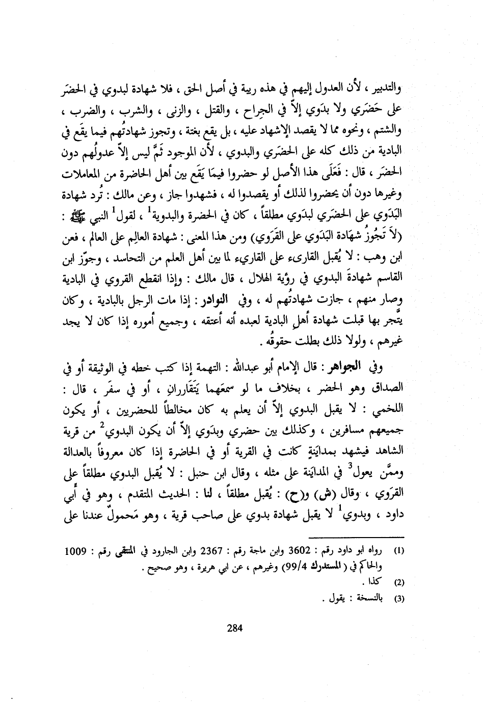 وَالتَّدْبِيرِ لِأَنَّ الْعُدُولَ إِلَيْهِمْ فِي هَذِهِ رِيبَةٌ فِي أَصْلِ الْحَقِّ فَلَا شَهَادَةَ لِبَدَوِيٍّ فِي الْحَضَرِ عَلَى حَضَرِيٍّ وَلَا بَدَوِيٍّ إِلَّا فِي الْجراح وَالْقَتْل والزنى وَالشُّرْبِ وَالضَّرْبِ وَالشَّتْمِ وَنَحْوِهِ مِمَّا لَا يُقْصَدُ الْإِشْهَادُ عَلَيْهِ بَلْ يَقَعُ بَغْتَةً وَتَجُوزُ شَهَادَتُهُمْ فِيمَا يَقَعُ فِي الْبَادِيَةِ مِنْ ذَلِكَ كُلِّهِ عَلَى الْحَضَرِيِّ وَالْبَدَوِيِّ لِأَنَّ الْمَوْجُودَ ثَمَّ لَيْسَ إِلَّا عُدُولُهُمْ دُونَ الْحَضَرِ قَالَ فَعَلَى هَذَا الْأَصْلِ لَوْ حَضَرُوا فِيمَا يَقَعُ بَيْنَ أَهْلِ الْحَاضِرَةِ مِنَ الْمُعَامَلَاتِ وَغَيْرِهَا دُونَ أَنْ يُحْضَرُوا لِذَلِكَ أَوْ يُقْصَدُوا لَهُ فَشَهِدُوا جَازَ وَعَنْ مَالِكٍ تُرَدُّ شَهَادَةُ الْبَدَوِيِّ عَلَى الْحَضَرِيِّ لِبَدَوِيٍّ مُطْلَقًا كَانَ فِي الْحَضْرَةِ وَالْبَدَوِيَّةِ لِقَوْلِ النَّبِيِّ - صَلَّى اللَّهُ عَلَيْهِ وَسَلَّم َ - لَا تَجُوزُ شَهَادَةُ الْبَدَوِيِّ عَلَى الْقَرَوِيِّ وَمِنْ هَذَا الْمَعْنَى شَهَادَةُ الْعَالِمِ عَلَى الْعَالِمِ فَعَنِ ابْن وهب لَا يقبل القاريء على القاريء لِمَا بَيْنَ أَهْلِ الْعِلْمِ مِنَ التَّحَاسُدِ وَجَوَّزَ ابْنُ الْقَاسِمِ شَهَادَةَ الْبَدَوِيِّ فِي رُؤْيَةِ الْهِلَالِ قَالَ مَالِكٌ وَإِذَا انْقَطَعَ الْقَرَوِيُّ فِي الْبَادِيَةِ وَصَارَ مِنْهُمْ جَازَتْ شَهَادَتُهُمْ لَهُ وَفِي النَّوَادِرِ إِذَا مَاتَ الرَّجُلُ بِالْبَادِيَةِ وَكَانَ يَتَّجِرُ بِهَا قُبِلَتْ شَهَادَةُ أَهْلِ الْبَادِيَةِ لِعَبْدِهِ أَنَّهُ أَعْتَقَهُ وَجَمِيعِ أُمُورِهِ إِذَا كَانَ لَا يَجِدُ غَيْرَهُمْ وَلَوْلَا ذَلِكَ بَطَلَتْ حُقُوقُهُ وَفِي الْجَوَاهِرِ قَالَ الْإِمَامُ أَبُو عَبْدِ اللَّهِ التُّهْمَةُ إِذَا كَتَبَ خَطَّهُ فِي الْوَثِيقَةِ أَوْ فِي الصَّدَاقِ وَهُوَ الْحَضَر بِخِلَاف مَا لَو سمعهما يتقارران أَوْ فِي سَفَرٍ قَالَ اللَّخْمِيُّ لَا يُقْبَلُ البدوي الا ان يعلم بِهِ كَانَ مُخَالِطًا لِلْحَضَرِيِّينَ أَوْ يَكُونَ جَمِيعُهُمْ مُسَافِرِينَ وَكَذَلِكَ بَيْنَ حَضَرِيٍّ وَبَدَوِيٍّ إِلَّا أَنْ يَكُونَ الْبَدَوِيُّ مِنْ قَرْيَةِ الشَّاهِدِ فَيَشْهَدُ بِمُدَايَنَةٍ كَانَتْ فِي الْقَرْيَةِ أَوْ فِي الْحَاضِرَةِ إِذَا كَانَ مَعْرُوفًا بِالْعَدَالَةِ وَمِمَّنْ يُعَوَّلُ فِي الْمُدَايَنَةِ عَلَى مِثْلِهِ وَقَالَ ابْنُ حَنْبَلٍ لَا يُقْبَلُ الْبَدَوِيُّ مُطلقًا على الْقَرَوِي وَقَالَ ش وح يُقْبَلُ مُطْلَقًا لَنَا الْحَدِيثُ الْمُتَقَدِّمُ وَهُوَ فِي ابي دَاوُد وبدوي لَا يقبل شَهَادَةُ بَدَوِيٍّ عَلَى صَاحِبِ قَرْيَةٍ وَهُوَ مَحْمُولٌ عندنَا على