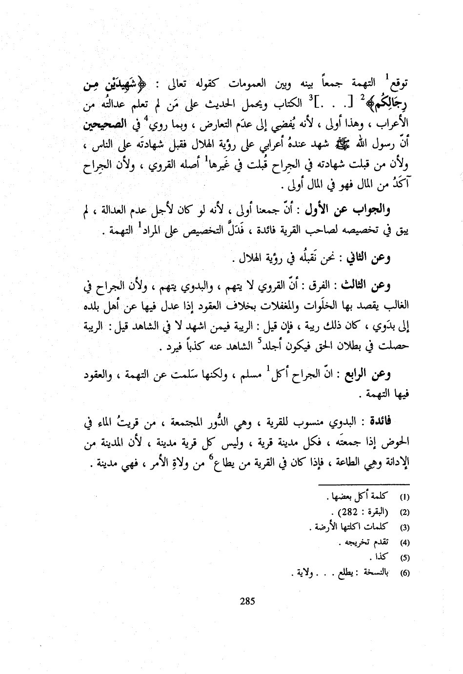 تَوَقُّعِ التُّهْمَةِ جَمْعًا بَيْنَهُ وَبَيْنَ الْعُمُومَاتِ كَقَوْلِهِ تعإلى {شهيدين من رجالكم} الْكِتَابِ وَيُحْمَلُ الْحَدِيثُ عَلَى مَنْ لَمْ تُعْلَمْ عَدَالَتُهُ مِنَ الْأَعْرَابِ وَهَذَا أَوْلَى لِأَنَّهُ يُفْضِي إِلَى عَدَمِ التَّعَارُضِ وَبِمَا رُوِيَ فِي الصَّحِيحَيْنِ أَنَّ رَسُولَ اللَّهِ - صَلَّى اللَّهُ عَلَيْهِ وَسَلَّم َ - شَهِدَ عِنْدَهُ أَعْرَابِيٌّ عَلَى رُؤْيَةِ الْهِلَالِ فَقَبِلَ شَهَادَتَهُ عَلَى النَّاسِ وَلِأَنَّ مَنْ قُبِلَتْ شَهَادَتُهُ فِي الْجِرَاحِ قُبِلَتْ فِي غَيْرِهَا أَصْلُهُ الْقَرَوِيُّ وَلِأَنَّ الْجِرَاحَ آكَدُ مِنَ الْمَالِ فَهُوَ فِي الْمَالِ أَوْلَى وَالْجَوَابُ عَنِ الْأَوَّلِ أَنَّ جَمْعَنَا أَوْلَى لِأَنَّهُ لَوْ كَانَ لِأَجْلِ عَدَمِ الْعَدَالَةِ لَمْ يَبْقَ فِي تَخْصِيصِهِ لِصَاحِبِ الْقَرْيَةِ فَائِدَةٌ فَدلَّ التَّخْصِيص على الْمُرَادَ التُّهْمَةُ وَعَنِ الثَّانِي نَحْنُ نَقْبَلُهُ فِي رُؤْيَةِ الْهِلَالِ وَعَنِ الثَّالِثِ الْفَرْقُ أَنَّ الْقَرَوِيَّ لَا يُتَّهَمُ وَالْبَدَوِيَّ يُتَّهَمُ وَلِأَنَّ الْجِرَاحَ فِي الْغَالِب بهَا الخلوات والمغفلات بِخِلَافِ الْعُقُودِ إِذَا عَدَلَ فِيهَا عَنْ أَهْلِ بَلَدِهِ إِلَى بَدَوِيٍّ كَانَ ذَلِكَ رِيبَةً فَإِنْ قِيلَ الرِّيبَةُ فِيمَنْ أُشْهِدَ لَا فِي الشَّاهِدِ قِيلَ الرِّيبَةُ حَصَلَتْ فِي بُطْلَانِ الْحَقِّ فَيَكُونُ اجلد الشَّاهِد عَنهُ كذبا فَيرد وَعَن الرَّابِع ان الْجراح اكل مُسلم وَلَكِنَّهَا سَلِمَتْ عَنِ التُّهْمَةِ وَالْعُقُودُ فِيهَا التُّهْمَةُ فَائِدَة البدوي مَنْسُوبٌ لِلْقَرْيَةِ وَهِيَ الدُّورُ الْمُجْتَمِعَةُ مِنْ قَرَيْتُ الْمَاءَ فِي الْحَوْضِ إِذَا جَمَعْتَهُ فَكُلُّ مَدِينَةٍ قَرْيَةٌ وَلَيْسَ كُلُّ قَرْيَةٍ مَدِينَةً لِأَنَّ الْمَدِينَةَ مِنَ الْإِدَانَةِ وَهِيَ الطَّاعَةُ فَإِذَا كَانَ فِي الْقَرْيَةِ مَنْ يُطَاعُ مِنْ وُلَاةِ الْأَمْرِ فَهِيَ مَدِينَة