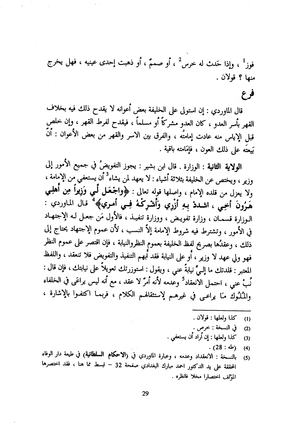 قَالَ المارودي إِنِ اسْتَوْلَى عَلَى الْخَلِيفَةِ بَعْضُ أَعْوَانِهِ لَا يَقْدَحُ ذَلِكَ فِيهِ بِخِلَافِ الْقَهْرِ بِأَسْرِ الْعَدُوِّ كَانَ الْعَدُوُّ مُشْرِكًا أَوْ مُسْلِمًا فَيَقْدَحُ لِفَرْطِ الْقَهْرِ وَإِنْ خُلِّصَ قَبْلَ الْإِيَاسِ مِنْهُ عَادَتْ إِمَامَتُهُ وَالْفَرْقُ بَيْنَ الْأَسْرِ وَالْقَهْرِ مِنْ بَعْضِ الْأَعْوَانِ أَنَّ بَيْعَتَهُ عَلَى ذَلِكَ الْعَوْنِ فَإِمَامَتُهُ بَاقِيَهٌ الْوِلَايَةُ الثَّانِيَةُ الْوِزَارَةُ قَالَ ابْنُ بَشِيرٍ يَجُوزُ التَّفْوِيضُ فِي جَمِيعِ الْأُمُورِ إِلَى وَزِيرٍ وَيَخْتَصُّ عَنِ الْخَلِيفَةِ بِثَلَاثَةِ أَشْيَاءَ لَا يَعْهَدُ لِمَنْ يَشَاءُ أَنْ يُسْتَعْفَى مِنَ الْإِمَامَةِ وَلَا يَعْزِلُ مَنْ قَلَّدَهُ الْإِمَامُ وَأَصْلُهَا قَوْله تَعَالَى {وَاجعَل لي وزيرا من أَهلِي هَارُون أخي اشْدُد بِهِ أزري وأشركه فِي أَمْرِي} قَالَ المارودي الْوِزَارَةُ قِسْمَانِ وِزَارَةُ تَفْوِيضٍ وَوِزَارَةُ تَنْفِيذٍ فَالْأَوَّلُ مَنْ جُعِلَ لَهُ الِاجْتِهَادُ فِي الْأُمُورِ وَتُشْتَرَطُ فِيهِ شُرُوطُ الْإِمَامَةِ إِلَّا النَّسَبَ لِأَنَّ عُمُومَ الِاجْتِهَادِ يَحْتَاجُ إِلَى ذَلِكَ وَعَقْدُهَا بِصَرِيحِ لَفْظِ الْخَلِيفَةِ بِعُمُومِ النَّظَرِ وَالنِّيَابَةِ فَإِنِ اقْتَصَرَ عَلَى عُمُوم النّظر فَهُوَ ولي عهد لَا وَزِيرٌ أَوْ عَلَى النِّيَابَةِ فَقَدْ أَبْهَمَ التَّنْفِيذَ وَالتَّفْوِيضَ فَلَا تَنْعَقِدُ وَاللَّفْظُ الْمُعْتَبَرُ قَلَّدْتُكَ مَا إِلَيَّ نِيَابَةً عَنِّي وَيَقُولُ اسْتَوْزَرْتُكَ تَعْوِيلًا عَلَى نِيَابَتِكَ فَإِنْ قَالَ نُبْ عَنِّي احْتُمِلَ الِانْعِقَادُ وَعَدَمُهُ لِأَنَّهُ أَمْرٌ لَا عَقْدٌ مَعَ أَنَّهُ لَيْسَ يُرَاعَى فِي الْخُلَفَاءِ وَالْمُلُوكِ مَا يُرَاعَى فِي غَيْرِهِمْ لِاسْتِثْقَالِهِمُ الْكَلَامَ فَرُبَّمَا اكْتَفَوْا بِالْإِشَارَةِ