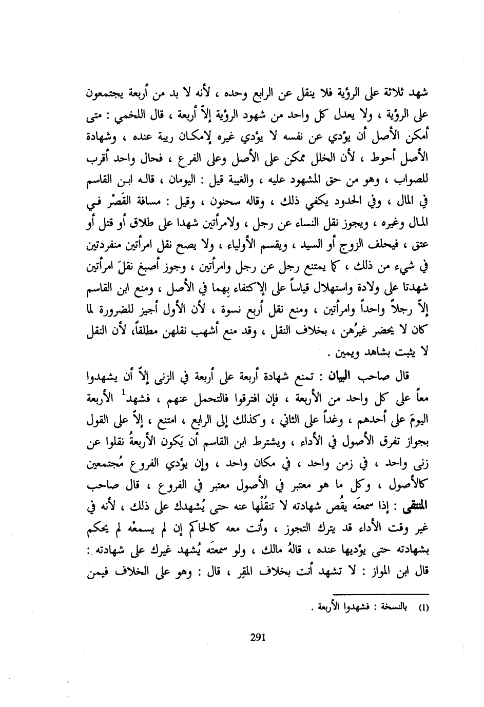 شَهِدَ ثَلَاثَةٌ عَلَى الرُّؤْيَةِ فَلَا يُنْقَلُ عَنِ الرَّابِعِ وَحْدَهُ لِأَنَّهُ لَا بُدَّ مِنْ أَرْبَعَةٍ يَجْتَمِعُونَ عَلَى الرُّؤْيَةِ وَلَا يَعَدِلُ كُلَّ وَاحِدٍ من شُهُود الرُّؤْيَا إِلَّا أَرْبَعَةٌ قَالَ اللَّخْمِيُّ مَتَى أَمْكَنَ الْأَصْلُ أَنْ يُؤَدِّيَ عَنْ نَفْسِهِ لَا يُؤَدِّي غَيْرُهُ لِإِمْكَانِ رِيبَةٍ عِنْدِهِ وَشَهَادَةُ الْأَصْلِ أَحْوَطُ لِأَنَّ الْخلَل مُمكن على الاصل وعَلى الْفَرْع فحال وَاحِدٌ أَقْرَبُ لِلصَّوَابِ وَهُوَ مِنْ حَقِّ الْمَشْهُودِ عَلَيْهِ وَالْغَيْبَةُ قِيلَ الْيَوْمَانِ قَالَهُ ابْنُ الْقَاسِمِ فِي الْمَالِ وَفِي الْحُدُودِ يَكْفِي ذَلِكَ وَقَالَهُ سَحْنُونٌ وَقِيلَ مَسَافَةُ الْقَصْرِ فِي الْمَالِ وَغَيْرِهِ وَيجوز نقل النِّسَاء عَن رجل ولامرأتين شَهدا عَلَى طَلَاقٍ أَوْ قَتْلٍ أَوْ عِتْقٍ فَيَحْلِفُ الزَّوْجُ أَوِ السَّيِّدُ وَيُقْسِمُ الْأَوْلِيَاءُ وَلَا يَصِحُّ نَقْلُ امْرَأَتَيْنِ مُنْفَرِدَتَيْنِ فِي شَيْءٍ مِنْ ذَلِكَ كَمَا يَمْتَنِعُ رَجُلٌ عَنْ رَجُلٍ وَامْرَأَتَيْنِ وَجَوَّزَ أَصْبَغُ نَقْلَ امْرَأَتَيْنِ شَهِدَتَا عَلَى وِلَادَةٍ وَاسْتِهْلَالٍ قِيَاسًا عَلَى الِاكْتِفَاءِ بِهِمَا فِي الْأَصْلِ وَمَنَعَ ابْنُ الْقَاسِمِ إِلَّا رَجُلًا وَاحِدًا وَامْرَأَتَيْنِ وَمَنَعَ نَقْلَ أَرْبَعِ نِسْوَةٍ لِأَنَّ الْأَوَّلَ أُجِيزَ لِلضَّرُورَةِ لَمَّا كَانَ لَا يَحْضُرُ غَيْرُهُنَّ بِخِلَافِ النَّقْلِ وَقَدْ مَنَعَ أَشْهَبُ نَقْلَهُنَّ مُطْلَقًا لِأَنَّ النَّقْلَ لَا يَثْبُتُ بِشَاهِدٍ وَيَمِينٍ قَالَ صَاحِبُ الْبَيَانِ تُمْنَعُ شَهَادَةُ أَرْبَعَةٍ عَلَى أَرْبَعَةٍ فِي الزِّنَى إِلَّا أَنْ يَشْهَدُوا مَعًا عَلَى كُلِّ وَاحِدٍ من الاربعة فَإِن افْتَرَقُوا فالتحمل عَنْهُمْ فَشَهِدَ الْأَرْبَعَةُ الْيَوْمَ عَلَى أَحَدِهِمْ وَغَدًا عَلَى الثَّانِي وَكَذَلِكَ إِلَى الرَّابِعِ امْتَنَعَ إِلَّا عَلَى الْقَوْلِ بِجَوَازِ تَفَرُّقِ الْأُصُولِ فِي الْأَدَاءِ وَيَشْتَرِطُ ابْنُ الْقَاسِمِ أَنْ يَكُونَ الْأَرْبَعَةُ نَقَلُوا عَنْ زِنًى وَاحِدٍ فِي زَمَنٍ وَاحِدٍ فِي مَكَانٍ وَاحِدٍ وَأَنْ يُؤَدِّيَ الْفُرُوعَ مُجْتَمِعِينَ كَالْأُصُولِ وَكُلُّ مَا هُوَ مُعْتَبَرٌ فِي الْأُصُولِ مُعْتَبَرٌ فِي الْفُرُوعِ قَالَ صَاحِبُ الْمُنْتَقَى إِذَا سَمِعْتَهُ يَقُصُّ شَهَادَتَهُ لَا تَنْقُلْهَا عَنْهُ حَتَّى يُشْهِدَكَ عَلَى ذَلِكَ لِأَنَّهُ فِي غَيْرِ وَقْتِ الْأَدَاءِ قَدْ يُتْرَكُ التَّجَوُّزُ وَأَنْتَ مَعَهُ كَالْحَاكِمِ إِنْ لَمْ يَسْمَعْهُ لَمْ يَحْكُمْ بِشَهَادَتِهِ حَتَّى يُؤَدِّيَهَا عِنْدَهُ قَالَهُ مَالِكٌ وَلَوْ سَمِعْتَهُ يُشْهِدُ غَيْرَكَ عَلَى شَهَادَتِهِ قَالَ ابْنُ الْمَوَّازِ لَا تَشْهَدْ أَنْتَ بِخِلَافِ الْمُقِرِّ قَالَ وَهُوَ عَلَى الْخِلَافِ فِيمَن