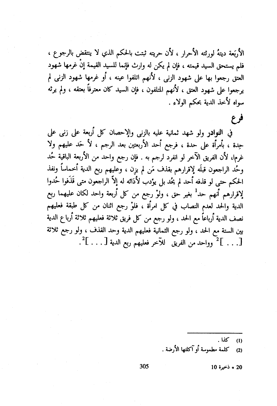 فِي النَّوَادِرِ وَلَوْ شَهِدَ ثَمَانِيَةٌ عَلَيْهِ بِالزِّنَى وَالْإِحْصَانِ كُلُّ أَرْبَعَةٍ عَلَى زِنًى عَلَى حِدَةٍ بِامْرَأَةٍ عَلَى حِدَةٍ فَرَجَعَ أَحَدُ الْأَرْبَعَتَيْنِ بَعْدَ الرَّجْمِ لَا حَدَّ عَلَيْهِم وَلَا غرم الان الْفَرِيقَ الْآخَرَ لَوِ انْفَرَدَ لَرُجِمَ بِهِ فَإِنْ رَجَعَ وَاحِدٌ مِنَ الْأَرْبَعَةِ الْبَاقِيَةِ حُدَّ وَحُدَّ الرَّاجِعُونَ قَبْلَهُ لِإِقْرَارِهِمْ بِقَذْفِ مَنْ لَمْ يَزْنِ وَعَلَيْهِمْ رُبُعُ الدِّيَةِ أَخْمَاسًا وَنَفَذَ الْحُكْمُ حَتَّى لَوْ قَذَفَهُ أَحَدٌ لَمْ يُحَدَّ بَلْ يُؤَدَّبُ لادائه لَهُ إِلَّا الرَّاجِعُونَ مَتَى قَذَفُوا حُدُّوا لِإِقْرَارِهِمْ أَنهم حُدَّ بِغَيْرِ حَقٍّ وَلَوْ رَجَعَ مِنْ كُلِّ أَرْبَعَةٍ وَاحِدٌ لَكَانَ عَلَيْهِمَا رُبُعُ الدِّيَةِ وَالْحَدُّ لِعَدَمِ النِّصَابِ فِي كُلِّ امْرَأَةٍ فَلَوْ رَجَعَ اثْنَان من كل طبقَة فَعَلَيْهِمْ نِصْفُ الدِّيَةِ أَرْبَاعًا مَعَ الْحَدِّ وَلَوْ رَجَعَ مَنْ كُلِّ فَرِيقٍ ثَلَاثَةٌ فَعَلَيْهِمْ ثَلَاثَةُ أَرْبَاعِ الدِّيَةِ بَيْنَ السِّتَّةِ مَعَ الْحَدِّ وَلَوْ رَجَعَ الثَّمَانِيَةُ فَعَلَيْهِمُ الدِّيَةُ وَحَدُّ الْقَذْفِ وَلَوْ رَجَعَ ثَلَاثَة وَوَاحِد من الْفَرِيق للاخر فَعَلَيْهِم ربع الدِّيَة