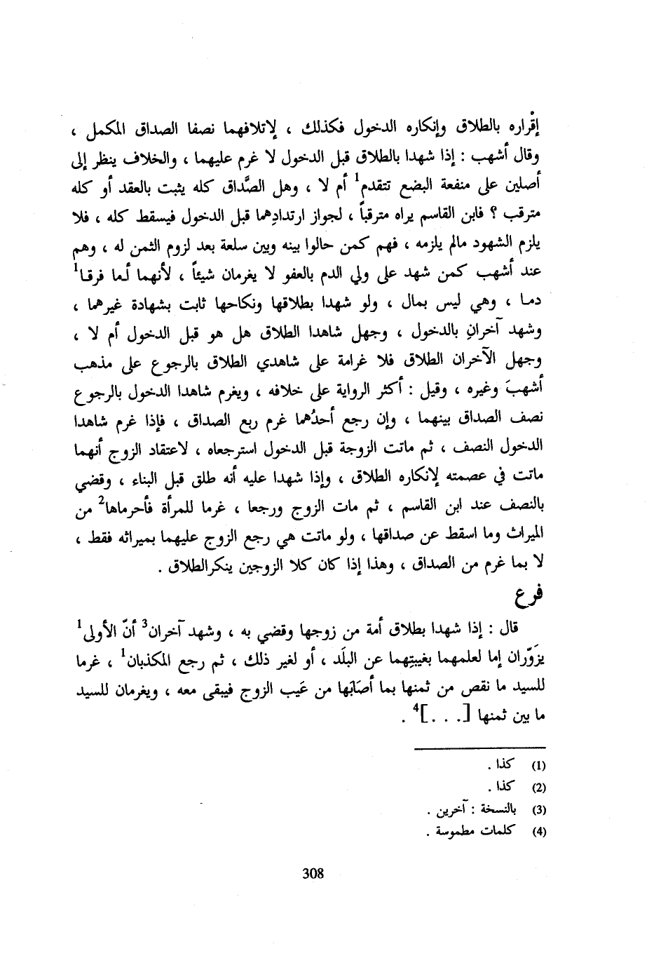 اقراره بِالطَّلَاق وانكاره الدُّخُول فَكَذَلِك لاتلافهما نصفا الصَدَاق المكمل وَقَالَ أَشْهَبُ إِذَا شَهِدَا بِالطَّلَاقِ قَبْلَ الدُّخُولِ لَا غُرْمَ عَلَيْهِمَا وَالْخِلَافُ يَنْظُرُ إِلَى أَصْلَيْنِ على مَنْفَعَةُ الْبِضْعِ تَتَقَدَّمُ أَمْ لَا وَهَلِ الصَّدَاقُ كُلُّهُ يَثْبُتُ بِالْعَقْدِ أَوْ كُلُّهُ مُتَرَقَّبٌ فَابْنُ الْقَاسِمِ يَرَاهُ مُتَرَقَّبًا لِجَوَازِ ارْتِدَادِهِمَا قَبْلَ الدُّخُولِ فَيسْقط كُله فَلَا يلْزم الشُّهُود مالم يَلْزَمْهُ فَهُمْ كَمَنَ حَالُوا بَيْنَهُ وَبَيْنَ سِلْعَةٍ بَعْدَ لُزُومِ الثَّمَنِ لَهُ وَهُمْ عِنْدَ أَشْهَبَ كَمَنْ شَهِدَ عَلَى وَلِيِّ الدَّمِ بِالْعَفْوِ لَا يغرمان شَيْئا لِأَنَّهُمَا أما فرقا دَمًا وَهِي لَيْسَ بِمَالٍ وَلَوْ شَهِدَا بِطَلَاقِهَا وَنِكَاحُهَا ثَابِتٌ بِشَهَادَةِ غَيْرِهِمَا وَشَهِدَ آخَرَانِ بِالدُّخُولِ وَجَهِلَ شَاهِدَا الطَّلَاقِ هَلْ هُوَ قَبْلَ الدُّخُولِ أَمْ لَا وَجَهِلَ الْآخَرَانِ الطَّلَاقَ فَلَا غَرَامَةَ عَلَى شَاهِدَيِ الطَّلَاقِ بِالرُّجُوعِ عَلَى مَذْهَبِ أَشْهَبَ وَغَيْرِهِ وَقِيلَ أَكْثَرُ الرِّوَايَةِ عَلَى خِلَافِهِ وَيَغْرَمُ شَاهِدَا الدُّخُولِ بِالرُّجُوعِ نِصْفَ الصَّدَاقِ بَيْنَهُمَا وَإِنْ رَجَعَ أَحَدُهُمَا غَرِمَ رُبُعَ الصَّدَاقِ فَإِذَا غَرِمَ شَاهِدَا الدُّخُولِ النِّصْفَ ثُمَّ مَاتَتِ الزَّوْجَةُ قَبْلَ الدُّخُولِ اسْتَرْجَعَاهُ لاعتقاد الزَّوْج أَنَّهُمَا مَاتَتْ فِي عِصْمَتِهِ لِإِنْكَارِهِ الطَّلَاقَ وَإِذَا شَهِدَا عَلَيْهِ أَنَّهُ طَلَّقَ قَبْلَ الْبِنَاءِ وَقُضِيَ بِالنِّصْفِ عِنْدَ ابْنِ الْقَاسِمِ ثُمَّ مَاتَ الزَّوْجُ وَرَجَعَا غرما للمراة فاحرماها من الْمِيرَاث وَمَا اسقط عَن صَدَاقِهَا وَلَوْ مَاتَتْ هِيَ رَجَعَ الزَّوْجُ عَلَيْهِمَا بِمِيرَاثِهِ فَقَطْ لَا بِمَا غَرِمَ مِنَ الصَّدَاقِ وَهَذَا إِذَا كَانَ كِلَا الزَّوْجَيْنِ يُنْكِرُ الطَّلَاقَ