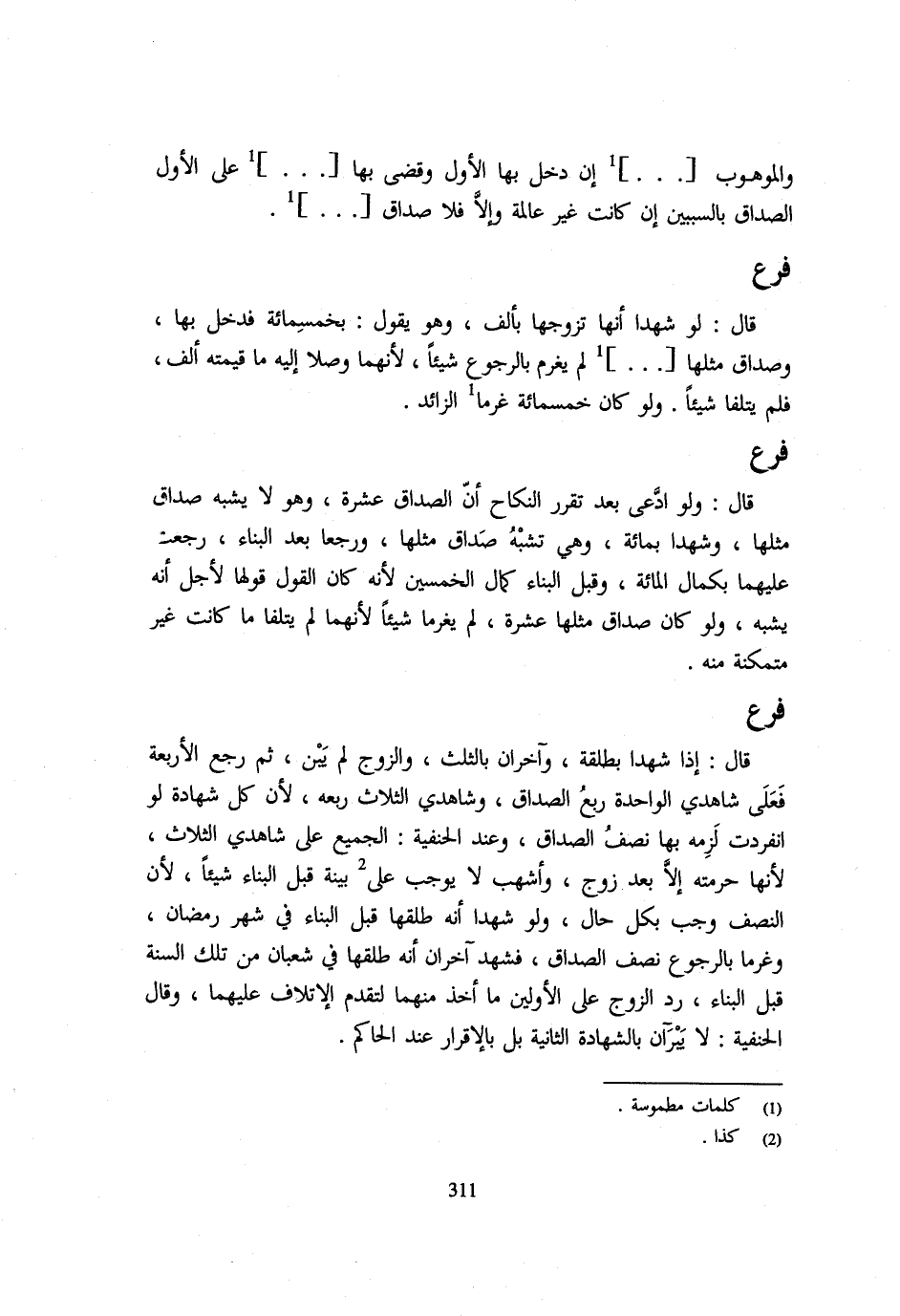 قَالَ إِذَا شَهِدَا بِطَلْقَةٍ وَآخَرَانِ بِالثُّلُثِ وَالزَّوْجُ لَمْ يَبْنِ ثُمَّ رَجَعَ الْأَرْبَعَةُ فَعَلَى شَاهِدَيِ الْوَاحِدَةِ رُبُعُ الصَّدَاقِ وَشَاهِدَيِ الثَّلَاثِ رُبُعُهُ لِأَنَّ كُلَّ شَهَادَةٍ لَوِ انْفَرَدَتْ لَزِمَهُ بِهَا نِصْفُ الصَّدَاقِ وَعِنْدَ الْحَنَفِيَّةِ الْجَمِيعُ على شَاهِدي الثَّلَاث لِأَنَّهَا حرمته إِلَّا بَعْدَ زَوْجٍ وَأَشْهَبُ لَا يُوجِبُ عَلَى بَيِّنَةٍ قَبْلَ الْبِنَاءِ شَيْئًا لِأَنَّ النِّصْفَ وَجَبَ بِكُلِّ حَالٍ وَلَوْ شَهِدَا أَنَّهُ طَلَّقَهَا قَبْلَ الْبِنَاءِ فِي شَهْرِ رَمَضَانَ وَغَرِمَا بِالرُّجُوعِ نِصْفَ الصَّدَاقِ فَشَهِدَ آخَرَانِ أَنَّهُ طَلَّقَهَا فِي شَعْبَانَ مِنْ تِلْكَ السَّنَةِ قَبْلَ الْبِنَاءِ رَدَّ الزَّوْجُ عَلَى الْأَوَّلَيْنِ مَا أَخَذَ مِنْهُمَا لِتَقَدُّمِ الْإِتْلَافِ عَلَيْهِمَا وَقَالَ الْحَنَفِيَّةُ لَا يَبْرَآنِ بِالشَّهَادَةِ الثَّانِيَةِ بَلْ بِالْإِقْرَارِ عِنْدَ الْحَاكِمِ