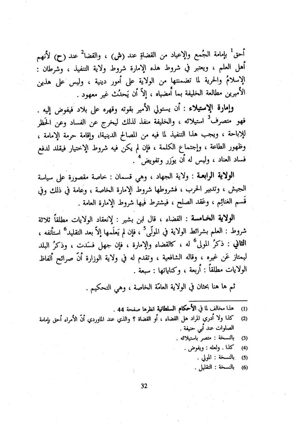 أَحَقُّ بِإِمَامَةِ الْجُمَعِ وَالْأَعْيَادِ مِنَ الْقُضَاةِ عِنْدَ ش والقضا عِنْدَ ح لِأَنَّهُمْ أَهْلُ الْعِلْمِ وَيُعْتَبَرُ فِي شُرُوطِ هَذِهِ الْإِمَارَةِ شُرُوطُ وِلَايَةِ التَّنْفِيذِ وَشَرْطَانِ الْإِسْلَامُ وَالْحُرِّيَّةُ لِمَا تَضَمَّنَتْهَا مِنَ الْوِلَايَةِ عَلَى أُمُورٍ دِينِيَّةٍ وَلَيْسَ عَلَى هَذَيْنِ الْأَمِيرَيْنِ مُطَالَعَةُ الْخَلِيفَةِ بِمَا أَمْضَيَاهُ إِلَّا أَنْ يَحْدُثَ غَيْرُ مَعْهُودٍ وَإِمَارَةُ الِاسْتِيلَاءِ أَنْ يَسْتَوْلِيَ الْأَمِيرُ بِقُوَّتِهِ وَقَهْرِهِ عَلَى بِلَادٍ فَيُفَوَّضَ إِلَيْهِ فَهُوَ مُتَصَرِّفٌ استيلائه وَالْخَلِيفَةُ مُنَفِّذٌ لِذَلِكَ لِيَخْرُجَ عَنِ الْفَسَادِ وَعَنِ الْحَظْرِ لِلْإِبَاحَةِ وَيَجِبُ هَذَا التَّنْفِيذُ لِمَا فِيهِ مِنَ الْمَصَالِحِ الدِّينِيَّةِ وَإِقَامَةِ حُرْمَةِ الْإِمَامَةِ وَظُهُورِ الطَّاعَةِ وَاجْتِمَاعِ الْكَلِمَةِ فَإِنْ لَمْ يَكُنْ فِيهِ شُرُوطُ الِاخْتِيَارِ فَيُقَلَّدُ لِدَفْعِ فَسَادِ الْعِنَادِ وَلَيْسَ لَهُ أَن يوزر وتفويض الْولَايَة الرَّابِعَة ولَايَة الْجِهَاد وَهِيَ قِسْمَانِ خَاصَّةٌ مَقْصُورَةٌ عَلَى سِيَاسَةِ الْجَيْشِ وَتَدْبِيرِ الْحَرْبِ فَشُرُوطُهَا شُرُوطُ الْإِمَارَةِ الْخَاصَّةِ وَعَامَّةٌ فِي ذَلِكَ وَفِي قَسْمِ الْغَنَائِمِ وَعَقْدِ الصُّلْحِ فَيُشْتَرَطُ فِيهَا شُرُوطُ الْإِمَارَةِ الْعَامَّةِ الْوِلَايَةُ الْخَامِسَةُ الْقَضَاء قَالَ ابْنُ بَشِيرٍ لِانْعِقَادِ الْوِلَايَاتِ مُطْلَقًا ثَلَاثَةُ شُرُوطٍ الْعِلْمُ بِشَرَائِطِ الْوِلَايَةِ فِي الْمُوَلَّى فَإِنْ لَمْ يَعْلَمْهَا إِلَّا بَعْدَ التَّقْلِيدِ اسْتَأْنَفَهُ الثَّانِي ذِكْرُ الْمُوَلِّي لَهُ كَالْقَضَاءِ وَالْإِمَارَةِ فَإِنْ جَهِلَ فَسَدَتْ وَذِكْرُ الْبَلَدِ لِيَمْتَازَ عَنْ غَيْرِهِ وَقَالَهُ الشَّافِعِيَّةُ وَتَقَدَّمَ لَهُ فِي وِلَايَةِ الْوِزَارَةِ أَنَّ صرائح أَلْفَاظ الولايات مُطلقًا أَرْبَعَة وكنايتها سَبْعَة ثمَّ هَاهُنَا بَحْثَانِ فِي الْوِلَايَةِ الْعَامَّةِ الْخَاصَّةِ وَهِيَ التَّحْكِيمُ