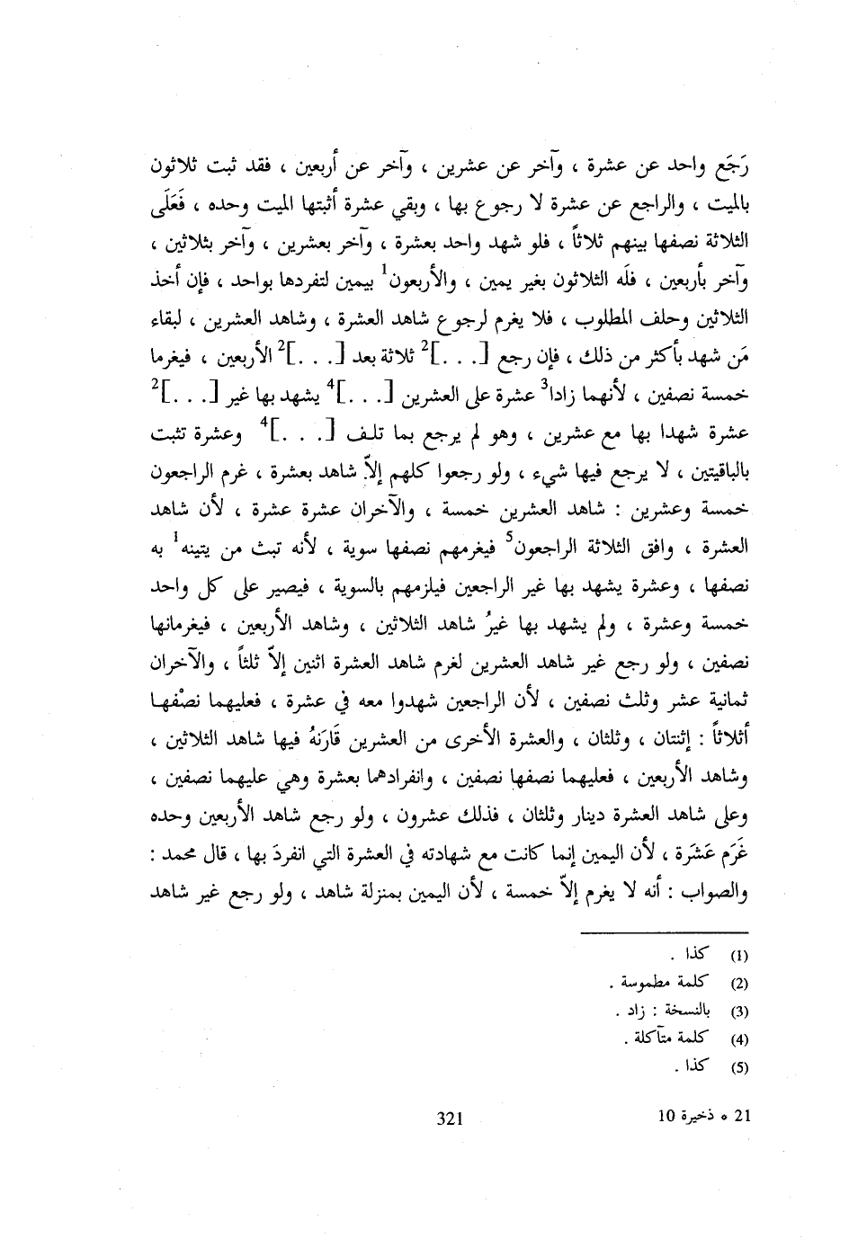 رَجَعَ وَاحِدٌ عَنْ عَشَرَةٍ وَآخَرُ عَنْ عِشْرِينَ وَآخَرُ عَنْ أَرْبَعِينَ فَقَدْ ثَبَتَ ثَلَاثُونَ بِالْمَيِّتِ وَالرَّاجِعُ عَنْ عَشَرَةٍ لَا رُجُوعَ بِهَا وَبَقِيَ عَشَرَةٌ أَثْبَتَهَا الْمَيِّتُ وَحْدَهُ فَعَلَى الثَّلَاثَةِ نِصْفُهَا بَينهم ثَلَاثًا فَلَوْ شَهِدَ وَاحِدٌ بِعَشَرَةٍ وَآخَرُ بِعِشْرِينَ وَآخَرُ بِثَلَاثِينَ وَآخَرُ بِأَرْبَعِينَ فَلَهُ الثَّلَاثُونَ بِغَيْرِ يَمِينٍ وَالْأَرْبَعِينَ بِيَمِينٍ لِتَفَرُّدِهَا بِوَاحِدٍ فَإِنْ أَخَذَ الثَّلَاثِينَ وَحَلَفَ الْمَطْلُوبُ فَلَا يَغْرَمُ لِرُجُوعِ شَاهِدِ الْعَشَرَةِ وَشَاهِدِ الْعِشْرِينَ لِبَقَاءِ مَنْ شَهِدَ بِأَكْثَرَ مِنْ ذَلِكَ فَإِنْ رَجَعَ ثَلَاثَةً بَعْدَ الْأَرْبَعِينَ فَيَغْرَمَا خَمْسَةً نِصْفَيْنِ لِأَنَّهُمَا زَادَا عَشَرَةً عَلَى الْعِشْرِينَ يَشْهَدُ بِهَا غَيْرُ عَشَرَةً شَهِدَا بِهَا مَعَ عِشْرِينَ وَهُوَ لَمْ يَرْجِعْ بِمَا تَلَفَ وَعَشَرَةٌ تَثْبُتُ بِالْبَاقِيَتَيْنِ لَا يَرْجِعُ فِيهَا شَيْءٌ وَلَوْ رَجَعُوا كلهم الا شَاهد بِعَشَرَةٍ غَرِمَ الرَّاجِعُونَ خَمْسَةً وَعِشْرِينَ شَاهِدُ الْعِشْرِينَ خَمْسَةً وَالْآخَرَانِ عَشَرَةً عَشَرَةً لِأَنَّ شَاهِدَ الْعَشَرَةِ وَافق الثَّلَاثَة الراجعون فيغرمهم نصفهَا سوية لِأَنَّهُ تبث من يتينه بِهِ نصفهَا وَعشرَة يشْهد بهَا غير الراجعين فيلزمهم بِالسَّوِيَّةِ فَيَصِيرُ عَلَى كُلِّ وَاحِدٍ خَمْسَةٌ وَعَشَرَةٌ وَلم يَشْهَدْ بِهَا غَيْرُ شَاهِدِ الثَّلَاثِينَ وَشَاهِدِ الْأَرْبَعِينَ فَيَغْرَمَانِهَا نِصْفَيْنِ وَلَوْ رَجَعَ غَيْرُ شَاهِدِ الْعِشْرِينَ لغرم شَاهد الْعشْرَة اثْنَيْنِ الا ثلثا وَالْآخرُونَ ثَمَانِيَة عشر وَثلث نِصْفَيْنِ لِأَنَّ الرَّاجِعِينَ شَهِدُوا مَعَهُ فِي عَشَرَةٍ فعلَيْهِمَا نصفهَا اثلاثا اثْنَتَانِ وَثُلُثَانِ وَالْعشرَة الآخرى من الْعشْرين قارنه فِيهَا شاهدى الثَّلَاثِينَ وَشَاهد الاربعين فعلهمَا نصفهَا نِصْفَيْنِ وانفرادهما بِعشْرَة وَهِي عَلَيْهِمَا نِصْفَيْنِ وَعَلَى شَاهِدِ الْعَشَرَةِ دِينَارٌ وَثُلُثَانِ فَذَلِكَ عِشْرُونَ وَلَوْ رَجَعَ شَاهِدُ الْأَرْبَعِينَ وَحْدَهُ غَرِمَ عَشَرَةً لِأَنَّ الْيَمِينَ إِنَّمَا كَانَتْ مَعَ شَهَادَتِهِ فِي الْعَشَرَةِ الَّتِي انْفَرَدَ بِهَا قَالَ مُحَمَّدٌ وَالصَّوَابُ أَنَّهُ لَا يَغْرَمُ إِلَّا خَمْسَةً لِأَنَّ الْيَمِينَ بِمَنْزِلَةِ شَاهِدٍ وَلَوْ رَجَعَ غَيْرُ شَاهد