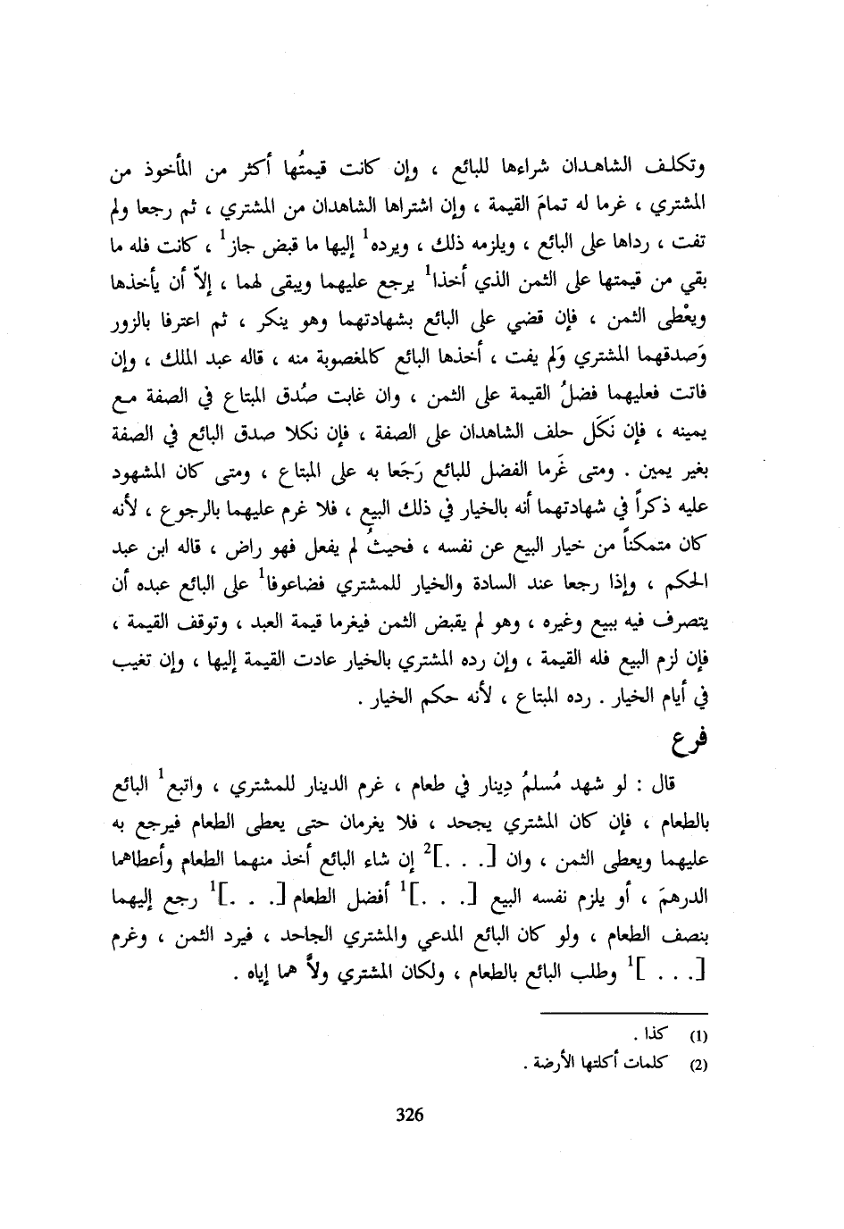 وَتَكَلَّفَ الشَّاهِدَانِ شِرَاءَهَا لِلْبَائِعِ وَإِنْ كَانَتْ قِيمَتُهُا أَكْثَرَ مِنَ الْمَأْخُوذِ مِنَ الْمُشْتَرِي غَرِمَا لَهُ تَمام الْقيمَة وَإِن لااشتراها الشَّاهِدَانِ مِنَ الْمُشْتَرِي ثُمَّ رَجَعَا وَلَمْ تَفُتْ رداها على البَائِع وَيلْزمهُ ذَلِك وَيَردهُ اليها مَا قبض جَازَ كَانَت فَلَهُ مَا بَقِيَ مِنْ قِيمَتِهَا عَلَى الثَّمَنِ الَّذِي أَخَذَا يَرْجِعُ عَلَيْهِمَا وَيَبْقَى لَهُمَا إِلَّا أَنْ يَأْخُذَهَا وَيُعْطَى الثَّمَنَ فَإِنْ قُضِيَ عَلَى الْبَائِعِ بِشَهَادَتِهِمَا وَهُوَ يُنْكِرُ ثُمَّ اعْتَرَفَا بِالزُّورِ وصدقهما المُشْتَرِي وَلم يفت اخذها البَائِع كالمغصوبة مِنْهُ قَالَهُ عَبْدُ الْمَلِكِ وَإِنْ فَاتَتْ فَعَلَيْهِمَا فَضْلُ الْقِيمَةِ عَلَى الثَّمَنِ وَإِنْ غَابَتْ صُدِّقَ الْمُبْتَاعُ فِي الصِّفَةِ مَعَ يَمِينِهِ فَإِنْ نَكَلَ حَلَفَ الشَّاهِدَانِ عَلَى الصِّفَةِ فَإِنْ نَكَلَا صَدَقَ الْبَائِعُ فِي الصِّفَةِ بِغَيْرِ يَمِينٍ وَمَتَى غَرِمَا الْفَضْلَ لِلْبَائِعِ رَجَعَا بِهِ عَلَى الْمُبْتَاعِ وَمَتَى كَانَ الْمَشْهُودُ عَلَيْهِ ذُكِّرَا فِي شَهَادَتِهِمَا أَنَّهُ بِالْخِيَارِ فِي ذَلِكَ الْبَيْعِ فَلَا غُرْمَ عَلَيْهِمَا بِالرُّجُوعِ لِأَنَّهُ كَانَ مُتَمَكِّنًا مِنْ خِيَارِ الْبَيْعِ عَنْ نَفْسِهِ فَحَيْثُ لَمْ يَفْعَلْ فَهُوَ رَاضٍ قَالَه ابْن عبد الحكم واذا رجعا عِنْد السَّادة وَالْخيَار للْمُشْتَرِي فضاعوفا عَلَى الْبَائِعِ عَبْدَهُ أَنْ يَتَصَرَّفَ فِيهِ بِبَيْعٍ وَغَيْرِهِ وَهُوَ لَمْ يَقْبِضِ الثَّمَنَ فَيَغْرَمَا قِيمَةَ الْعَبْدِ وَتُوقَفُ الْقِيمَةُ فَإِنْ لَزِمَ الْبَيْعُ فَلَهُ الْقِيمَةُ وَإِنْ رَدَّهُ الْمُشْتَرِي بِالْخِيَارِ عَادَتِ الْقِيمَةُ اليها وان تغيب فِي أَيَّامِ الْخِيَارِ رَدَّهُ الْمُبْتَاعُ لِأَنَّهُ حَكَمَ الْخِيَار