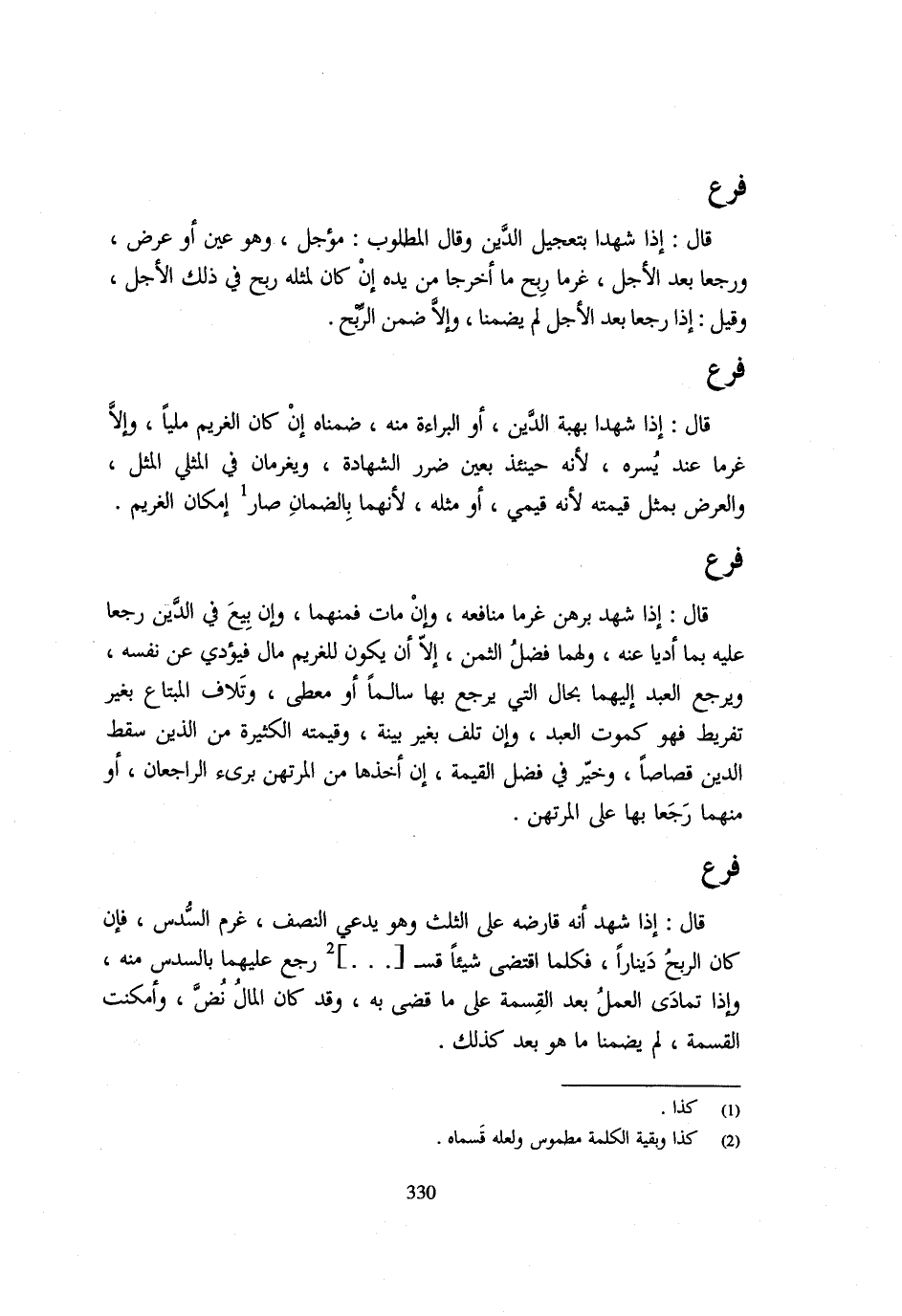قَالَ اذا شهد بِرَهْنٍ غَرِمَا مَنَافِعَهُ وَإِنْ مَاتَ فَمِنْهُمَا وَإِنْ بِيعَ فِي الدَّيْنِ رَجَعَا عَلَيْهِ بِمَا أَدَّيَا عَنْهُ وَلَهُمَا فَضْلُ الثَّمَنِ إِلَّا أَنْ يَكُونَ لِلْغَرِيمِ مَالٌ فَيُؤَدِّيَ عَنْ نَفْسِهِ وَيَرْجِعُ الْعَبْدُ إِلَيْهِمَا بِحَالِ الَّتِي يَرْجِعُ بِهَا سَالِمًا أَوْ مُعْطًى وَتَلَافُ الْمُبْتَاعِ بِغَيْرِ تَفْرِيطٍ فَهُوَ كَمَوْتِ الْعَبْدِ وَإِنْ تَلِفَ بِغَيْرِ بَيِّنَةٍ وَقِيمَتُهُ الْكَثِيرَةُ مِنَ الَّذِينَ سَقَطَ الدَّيْنُ قِصَاصًا وَخُيِّرَ فِي فضل الْقيمَة ان اخذها من الْمُرْتَهن برىء الرَّاجِعَانِ أَوْ مِنْهُمَا رَجَعَا بِهَا عَلَى الْمُرْتَهِنِ