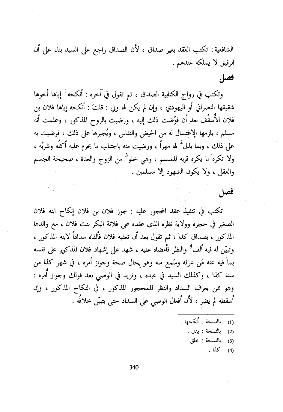 وَتَكْتُبُ فِي زَوَاجِ الْكِتَابِيَّةِ الصَّدَاقَ ثُمَّ تَقُولُ فِي آخِرِهِ أَنْكَحَهُ إِيَّاهَا أَخُوهَا شَقِيقُهَا النَّصْرَانِيُّ أَوِ الْيَهُودِيُّ وَإِنْ لَمْ يَكُنْ لَهَا وَلِيٌّ قُلْتَ أَنْكَحَهُ إِيَّاهَا فُلَانُ بْنُ فُلَانٍ الْأَسْقُفُ بَعْدَ أَنْ فَوَّضَتْ ذَلِكَ إِلَيْهِ وَرَضِيَتْ بِالزَّوْجِ الْمَذْكُورِ وَعَلِمَتْ أَنَّهُ مُسْلِمٌ يَلْزَمُهَا الِاغْتِسَالُ لَهُ مِنَ الْحَيْضِ وَالنِّفَاسِ وَيُجْبِرُهَا عَلَى ذَلِكَ فَرَضِيَتْ بِهِ عَلَى ذَلِكَ وَبِمَا بَذَلَ لَهَا مَهْرًا وَرَضِيَتْ مِنْهُ بِاجْتِنَابِ مَا يَحْرُمُ عَلَيْهِ أَكْلُهُ وَشُرْبُهُ وَلَا تَكْرَهُ مَا يَكْرَهُ قُرْبَهُ لِلْمُسْلِمِ وَهِيَ خُلُوٌّ مِنَ الزَّوْجِ وَالْعِدَّةِ صَحِيحَةُ الْجِسْمِ وَالْعَقْلِ وَلَا يَكُونُ الشُّهُودُ إِلَّا مُسْلِمِينَ