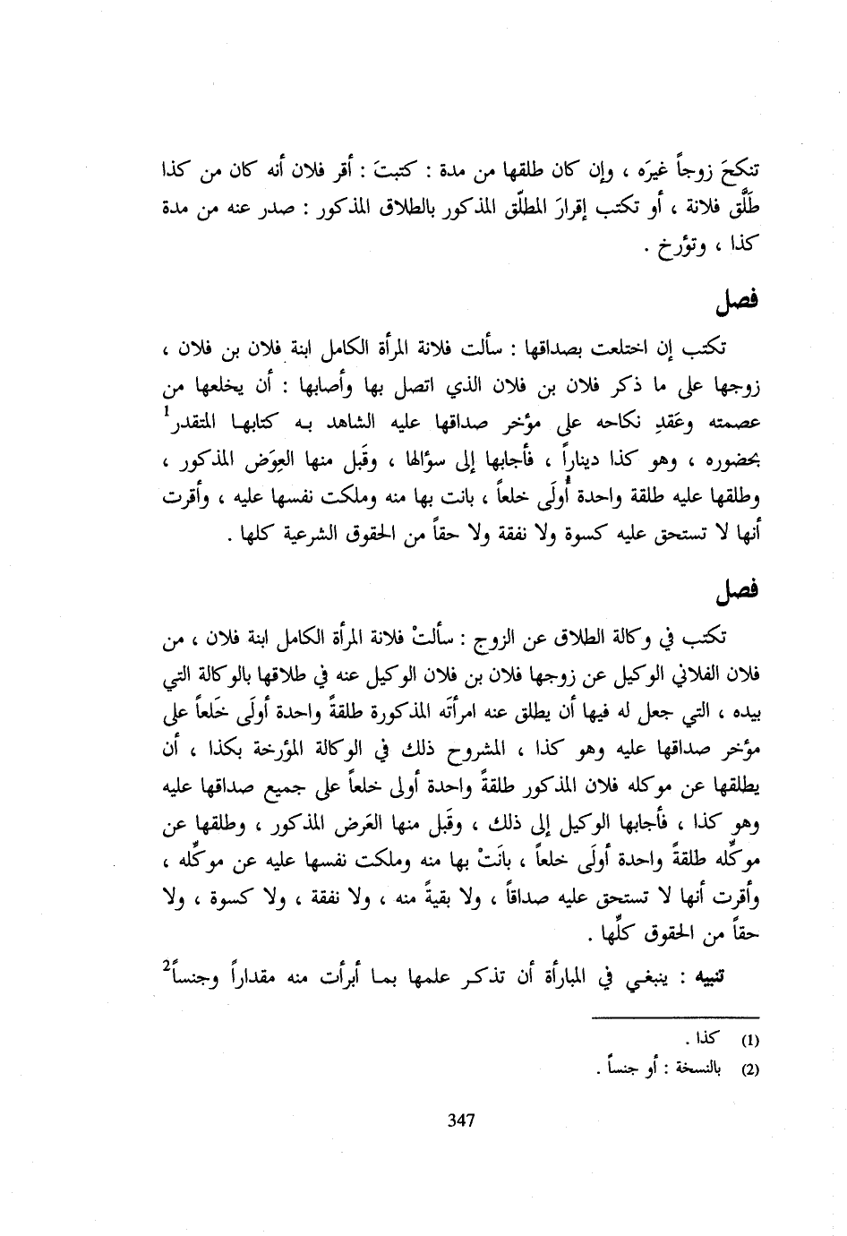 تَكْتُبُ فِي وِكَالَةِ الطَّلَاقِ عَنِ الزَّوْجِ سَأَلَتْ فُلَانَةُ الْمَرْأَةُ الْكَامِلُ ابْنَةُ فُلَانٍ مِنْ فُلَانٍ الْفُلَانِيِّ الْوَكِيلِ عَنْ زَوْجِهَا فُلَانِ بْنِ فُلَانٍ الْوَكِيلِ عَنْهُ فِي طَلَاقِهَا بِالْوِكَالَةِ الَّتِي بِيَدِهِ الَّتِي جَعَلَ لَهُ فِيهَا أَنْ يُطَلِّقَ عَنْهُ امْرَأَتَهُ الْمَذْكُورَةَ طَلْقَةً وَاحِدَةً أُولَى خُلْعًا عَلَى مُؤَخَّرِ صَدَاقِهَا عَلَيْهِ وَهُوَ كَذَا الْمَشْرُوحِ ذَلِكَ فِي الْوَكَالَةِ الْمُؤَرَّخَةِ بِكَذَا أَنْ يُطَلِّقَهَا عَنْ مُوَكِّلِهِ فُلَانٍ الْمَذْكُورِ طَلْقَةً وَاحِدَةً أُولَى خُلْعًا عَلَى جَمِيعِ صَدَاقِهَا عَلَيْهِ وَهُوَ كَذَا فَأَجَابَهَا الْوَكِيلُ إِلَى ذَلِكَ وَقبل مِنْهَا الْعرض الْمَذْكُورَ وَطَلَّقَهَا عَنْ مُوَكِّلِهِ طَلْقَةً وَاحِدَةً أُولَى خُلْعًا بَانَتْ بِهَا مِنْهُ وَمَلَكَتْ نَفْسَهَا عَلَيْهِ من مُوَكِّلِهِ وَأَقَرَّتْ أَنَّهَا لَا تَسْتَحِقُّ عَلَيْهِ صَدَاقًا وَلَا بَقِيَّةً مِنْهُ وَلَا نَفَقَةً وَلَا كِسْوَةً وَلَا حَقًّا مِنَ الْحُقُوقِ كُلِّهَا تَنْبِيهٌ يَنْبَغِي فِي الْمُبَارَأَةِ أَنْ تَذْكُرَ عِلْمَهَا بِمَا أَبْرَأَتْ مِنْهُ مِقْدَارًا وجنسا