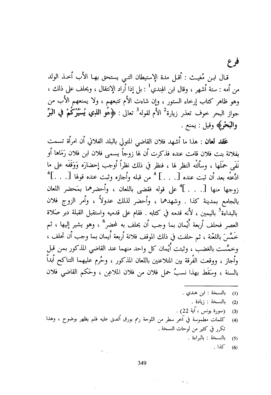 قَالَ ابْنُ مُغِيثٍ أَقَلُّ مُدَّةِ الِاسْتِيطَانِ الَّتِي يَسْتَحِقُّ بِهَا الْأَبُ أَخْذَ الْوَلَدِ مِنْ أُمِّهِ سِتَّةُ أَشْهُرٍ وَقَالَ ابْنُ الْهِنْدِيِّ بَلْ اذا اراد الِانْتِقَال وَيحلف عَلَى ذَلِكَ وَهُوَ ظَاهِرُ كِتَابِ إِرْخَاءِ السُّتُورِ وَإِنْ شَاءَتِ الْأُمُّ تَتْبَعُهُمْ وَلَا يَمْنَعُهُمُ الْأَبُ مِنْ جَوَازِ الْبَحْرِ خَوْفَ تَعَذُّرِ زِيَارَةِ الْأُمِّ لِقَوْلِهِ تَعَالَى {هُوَ الَّذِي يُسَيِّرُكُمْ فِي الْبَرِّ وَالْبَحْر} وَقِيلَ يَمْنَعُ عَقْدُ لِعَانٍ هَذَا مَا أَشْهَدَ فُلَانٌ الْقَاضِي الْمُتَوَلِّي بِالْبَلَدِ الْفُلَانِيِّ أَنَّ امْرَأَةً تَسَمَّتْ بِفُلَانَةَ بِنْتِ فُلَانٍ قَامَتْ عِنْدَهُ فَذَكَرَتْ ان لَهَا زوجا يُسمى فلَان ابْن فُلَانٍ رَمَاهَا أَوْ نَفَى حَمْلَهَا وَسَأَلَتْهُ النَّظَرَ لَهَا فَنَظَرَ فِي ذَلِكَ نَظَرًا أَوْجَبَ إِحْضَارَهُ وَوَقْفَهُ عَلَى مَا ادَّعَتْهُ بَعْدَ أَنْ ثَبَتَ عِنْدَهُ مِنْ قَبْلِهِ وَأَجَازَهُ وَثَبَتَ عِنْدَهُ قَوْلُهَا زَوْجُهَا مِنْهَا عَلَى قَوْلِهِ فَقَضَى بِاللِّعَانِ وَأَحْضَرَهُمَا بِمحضر اللّعان بالجامع بِمَدِينَة كَذَا وشهدهما واحضر لذَلِك عُدُولًا وَأمر الزَّوْج فلَان بِالْبَدَاءَةِ بِالْيَمِينِ لِأَنَّهُ قَدَّمَهُ فِي كِتَابِهِ فَقَامَ عَلَى قَدَمَيْهِ وَاسْتَقْبَلَ الْقِبْلَةَ دُبُرَ صَلَاةِ الْعَصْرِ فَحَلَفَ أَرْبَعَةَ أَيْمَانٍ بِمَا وَجَبَ أَنْ يَحْلِفَ بِهِ لِمَحْضَرٍ وَهُوَ يُشِيرُ إِلَيْهَا ثُمَّ خَمَّسَ بِاللَّعْنَةِ ثُمَّ حَلَفَتْ فِي ذَلِكَ الْمَوْقِفِ فُلَانَةُ أَرْبَعَةَ أَيْمَانٍ بِمَا وَجَبَ أَنْ تَحْلِفَ وَخَمَّسَتْ بِالْغَضَبِ وَثَبَتَتْ أَيْمَانُ كُلِّ وَاحِدٍ مِنْهُمَا عِنْدَ الْقَاضِي الْمَذْكُورِ بِمَنْ قَبِلَ وَأَجَازَ وَوَقَعَتِ الْفُرْقَةُ بَين التلاعنين بِاللِّعَانِ الْمَذْكُورِ وَحَرُمَ عَلَيْهِمَا التَّنَاكُحُ أَبَدًا بِالسُّنَّةِ وَسقط بِهَذَا نسب حمل فلَان مِنْ فُلَانٍ الْمُلَاعِنِ وَحَكَمَ الْقَاضِي فُلَانٌ