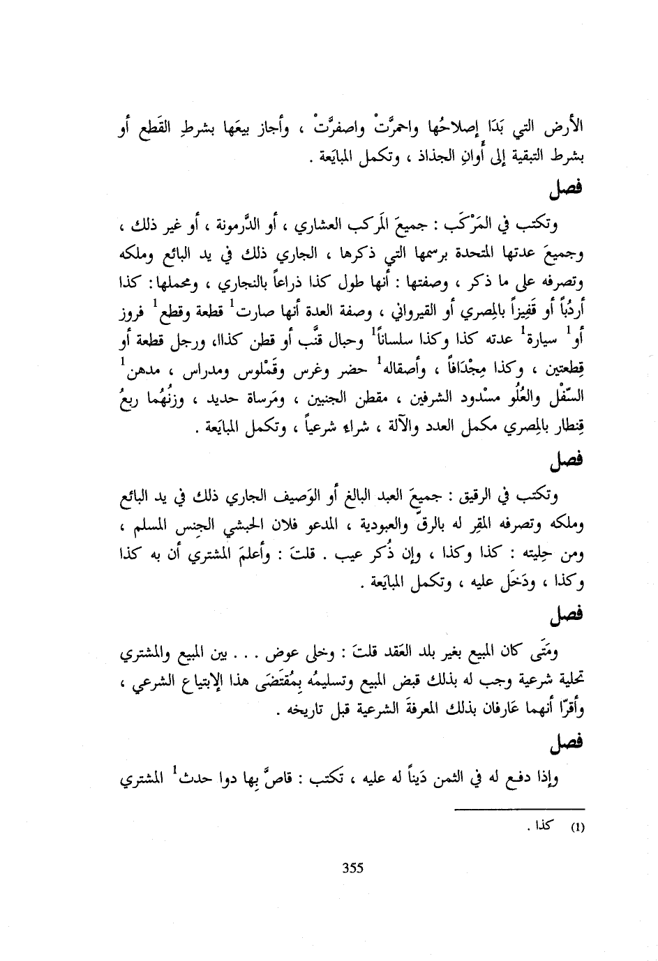 وَتَكْتُبُ فِي الْمَرْكَبِ جَمِيعَ الْمَرْكَبِ الْعُشَارِيِّ أَوِ الدَّرْمُونَةِ أَوْ غَيْرِ ذَلِكَ وَجَمِيعَ عِدَّتِهَا الْمُتَّحِدَةِ بِرَسْمِهَا الَّتِي ذَكَرَهَا الْجَارِي ذَلِكَ فِي يَدِ الْبَائِعِ وَمِلْكِهِ وَتَصَرُّفِهِ عَلَى مَا ذُكِرَ وَصِفَتُهَا أَنَّهَا طُولُ كَذَا ذِرَاعًا بِالنَّجَّارِيِّ وَمَحْمَلُهَا كَذَا إِرْدَبًّا أَوْ قَفِيزًا بِالْمِصْرِيِّ أَوِ الْقَيْرَوَانِيِّ وَصِفَةُ الْعِدَّةِ أَنَّهَا صَارَتْ قِطْعَةً وَقِطَعُ فَرُوزٍ أَوْ سَيَّارَةٍ عِدَّتُهُ كَذَا وَكَذَا سِلْسَانًا وَحِبَالُ قنب اَوْ قطن كذااورجل قِطْعَةٍ أَوْ قِطْعَتَيْنِ وَكَذَا مِجْدَافًا وَأَصْقَالُهُ حَضَرٌ وَغَرْسٌ وَقَمْلُوسُ وَمِدْرَاسٌ مُدْهَنُ السُّفْلِ وَالْعُلُوِّ مَسْدُودُ الشرفين مقطن الجنبين ومرساة حَدِيد وزنهما رُبُعُ قِنْطَارٍ بِالْمِصْرِيِّ مُكَمَلُ الْعَدَدِ وَالْآلَةِ شِرَاءً شَرْعِيًّا وَتُكْمِلُ الْمُبَايَعَةَ