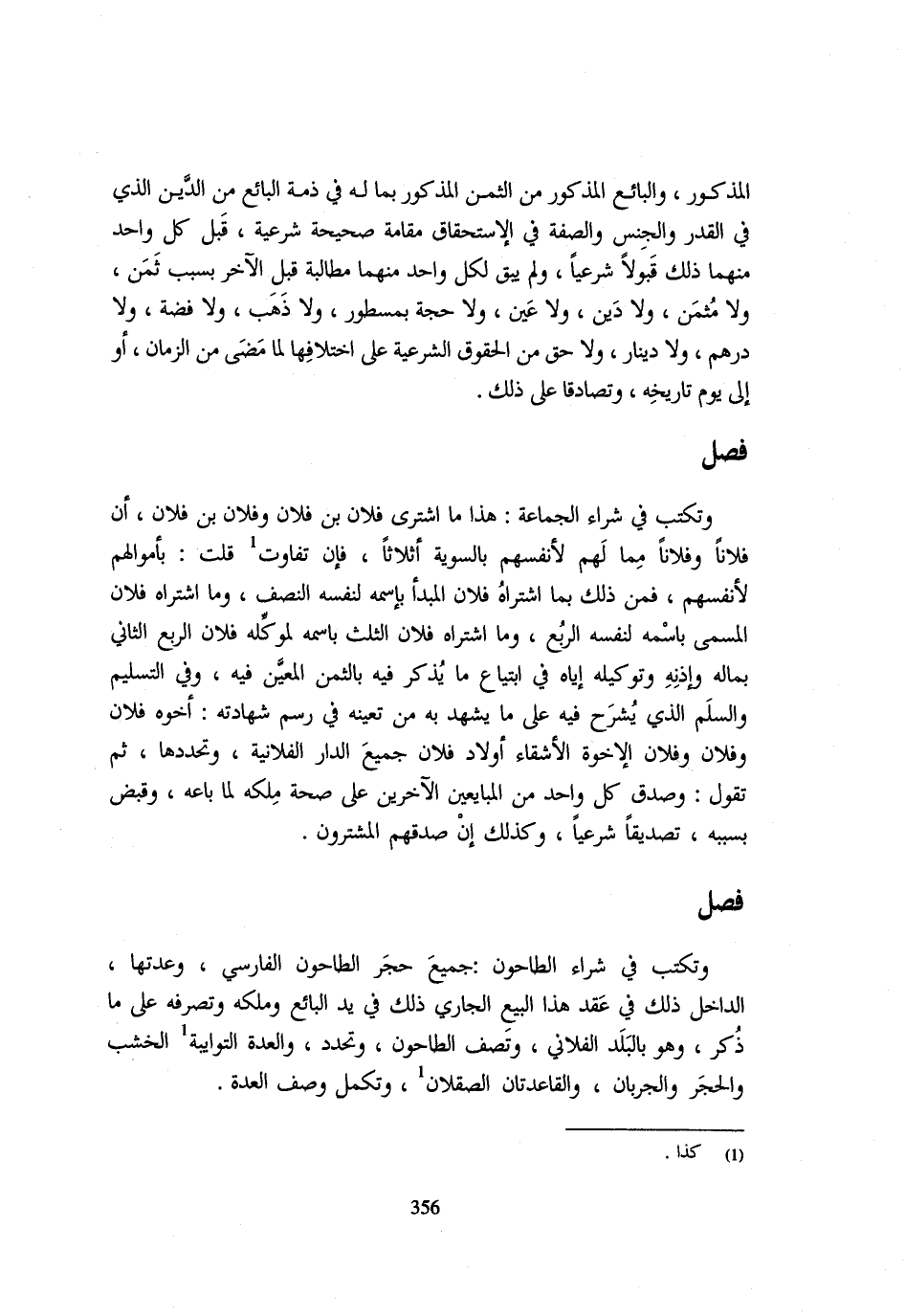 وَتَكْتُبُ فِي شِرَاءِ الطَّاحُونِ جَمِيعَ حَجَرِ الطَّاحُونِ الْفَارِسِيِّ وَعِدَّتَهَا الدَّاخِلَ ذَلِكَ فِي عَقْدِ هَذَا الْبَيْعِ الْجَارِي ذَلِكَ فِي يَدِ الْبَائِعِ وَمِلْكِهِ وَتَصَرُّفِهِ عَلَى مَا ذُكِرَ وَهُوَ بِالْبَلَدِ الْفُلَانِيِّ وَتَصِفُ الطَّاحُونَ وَتُحَدِّدُ وَالْعدة التَّوَايِبَةُ الْخَشَبُ وَالْحَجَرُ وَالْجَرْبَانُ وَالْقَاعِدَتَانِ الصِّقَلَانِ وَتُكْمِلُ وصف الْعدة