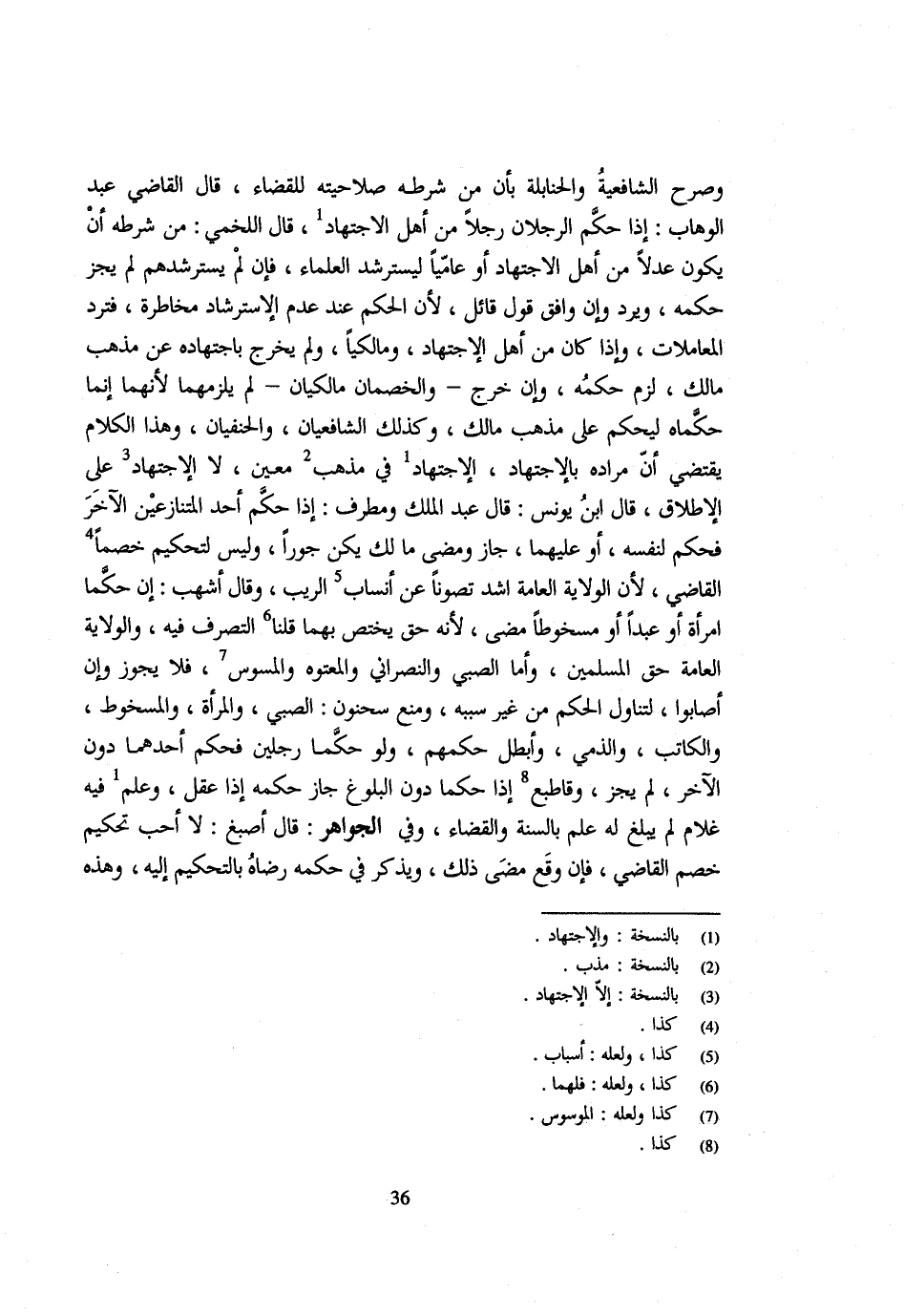 وَصَرَّحَ الشَّافِعِيَّةُ وَالْحَنَابِلَةُ بِأَنَّ مِنْ شَرْطِهِ صَلَاحِيَتُهُ لِلْقَضَاءِ قَالَ الْقَاضِي عَبْدُ الْوَهَّابِ إِذَا حَكَّمَ الرَّجُلَانِ رَجُلًا مِنْ أَهْلِ الِاجْتِهَادِ قَالَ اللَّخْمِيُّ مِنْ شَرْطِهِ أَنْ يَكُونَ عَدْلًا مِنْ أَهْلِ الِاجْتِهَادِ أَوْ عَامِّيًا لِيَسْتَرْشِدَ الْعُلَمَاءَ فَإِنْ لَمْ يسترشدهم لم يجر حُكْمُهُ وَيُرَدُّ وَإِنْ وَافَقَ قَوْلَ قَائِلٍ لِأَنَّ الْحُكْمَ عِنْدَ عَدَمِ الِاسْتِرْشَادِ مُخَاطَرَةٌ فَتُرَدُّ الْمُعَامَلَاتُ وَإِذَا كَانَ مِنْ أَهْلِ الِاجْتِهَادِ وَمَالِكِيَّا وَلَمْ يَخْرُجْ بِاجْتِهَادِهِ عَنْ مَذْهَبِ مَالِكٍ لَزِمَ حُكْمُهُ وَإِنْ خَرَجَ وَالْخَصْمَانِ مَالِكِيَّانِ لَمْ يَلْزَمْهُمَا لِأَنَّهُمَا إِثْمًا حَكَّمَاهُ لِيَحْكُمَ عَلَى مَذْهَبِ مَالِكٍ وَكَذَلِكَ الشَّافِعِيَّانِ وَالْحَنَفِيَّانِ وَهَذَا الْكَلَامُ يَقْتَضِي أَنَّ مُرَادَهُ بِالِاجْتِهَادِ الِاجْتِهَادُ فِي مَذْهَبٍ مُعَيَّنٍ لَا الِاجْتِهَادُ عَلَى الْإِطْلَاقِ قَالَ ابْنُ يُونُسَ قَالَ عَبْدُ الْمَلِكِ وَمُطَرِّفٌ إِذَا حَكَّمَ أَحَدُ الْمُتَنَازِعَيْنِ الْآخَرَ فَحَكَمَ لنَفسِهِ أَو عَلَيْهِمَا جَازَ وَمضى مَا لَك يكن جورا وَلَيْسَ لتحكيم خصما الْقَاضِي لِأَنَّ الْوِلَايَةَ الْعَامَّةَ أَشْدُّ تَصَوُّنًا عَنْ أَنْسَابِ الرَّيْبِ وَقَالَ أَشْهَبُ إِنْ حَكَّمَا امْرَأَةً أَوْ عَبْدًا أَوْ مَسْخُوطًا مَضَى لِأَنَّهُ حَقٌّ يخْتَص بهما قُلْنَا التَّصَرُّفُ فِيهِ وَالْوِلَايَةُ الْعَامَّةُ حَقُّ الْمُسْلِمِينَ وَأَمَّا الصَّبِي وَالنَّصْرَانِيّ وَالْمَعْتُوه والمسوس فَلَا يَجُوزُ وَإِنْ أَصَابُوا لِتَنَاوُلِ الْحُكْمِ مِنْ غَيْرِ سَبَبِهِ وَمَنَعَ سَحْنُونٌ الصَّبِيَّ وَالْمَرْأَةَ وَالْمَسْخُوطَ وَالْكَاتِبَ وَالذِّمِّيَّ وَأَبْطَلَ حُكْمَهُمْ وَلَوْ حَكَّمَا رَجُلَيْنِ فَحكم أَحدهمَا دون الآخر لم يجز وقاطبع إِذَا حَكَمَا دُونَ الْبُلُوغِ جَازَ حُكْمُهُ إِذَا عقل وَعلم فِيهِ غُلَامٍ لَمْ يَبْلُغْ لَهُ عِلْمٌ بِالسُّنَّةِ وَالْقَضَاءِ وَفِي الْجَوَاهِرِ قَالَ أَصْبَغُ لَا أُحِبُّ تَحْكِيمَ خَصْمِ الْقَاضِي فَإِنْ وَقَعَ مَضَى ذَلِكَ وَيُذْكَرُ فِي حُكْمِهِ رِضَاهُ بِالتَّحْكِيمِ إِلَيْهِ وَهَذِهِ