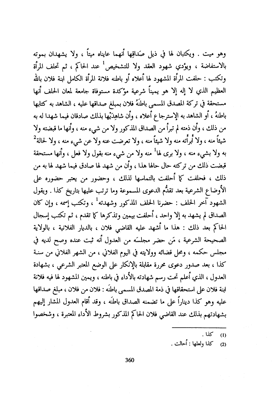 وَهُوَ مَيِّتٌ وَيَكْتُبَانِ لَهَا فِي ذَيْلِ صَدَاقِهَا أَنَّهُمَا عَايَنَاهُ مَيِّتًا وَلَا يَشْهَدَانِ بِمَوْتِهِ بِالِاسْتِفَاضَةِ وَيُؤَدِّي شُهُود العقد وَلَا للتشخيص عِنْدَ الْحَاكِمِ ثُمَّ تَحْلِفُ الْمَرْأَةُ وَتَكْتُبُ حَلَفَتِ الْمَرْأَةُ الْمَشْهُودُ لَهَا أَعْلَاهُ أَوْ بَاطِنَهُ فُلَانَةُ الْمَرْأَةُ الْكَامِلُ ابْنَةُ فُلَانٍ بِاللَّهِ الْعَظِيمِ الَّذِي لَا اله الاهو يَمِينًا شَرْعِيَّةً مُؤَكَّدَةً مُسْتَوْفَاةً جَامِعَةً لِمَعَانِ الْحَلِفِ أَنَّهَا مُسْتَحِقَّةٌ فِي تَرِكَةِ الْمُصْدِقِ الْمُسَمَّى بَاطِنَهُ فُلَانٍ بِمَبْلَغِ صَدَاقِهَا عَلَيْهِ الشَّاهِدِ بِهِ كِتَابُهَا بَاطِنَهُ أَوِ الشَّاهِدِ بِهِ الِاسْتِرْجَاعُ أَعْلَاهُ وَأَنَّ شاهديها بذلك صادقان فِيمَا شَهدا لَهُ بِهِ مِنْ ذَلِكَ وَأَنَّ ذِمَّتَهُ لَمْ تَبْرَأْ مِنَ الصَّدَاقِ الْمَذْكُورِ وَلَا مِنْ شَيْءٍ مِنْهُ وَأَنَّهَا مَا قَبَضَتْهُ وَلَا شَيْئًا مِنْهُ وَلَا أَبْرَأَتْهُ مِنْهُ وَلَا شَيْئًا مِنْهُ وَلَا تَعَرَّضَتْ عَنهُ وَلَا عَن شَيْء مِنْهُ وَلَا لحالة بِهِ وَلَا بِشَيْء مِنْهُ وَلَا بَرى لَهَا مِنْهُ وَلَا مِنْ شَيْءٍ مِنْهُ بِقَوْلٍ وَلَا فعل وَأَنَّهَا مُسْتَحقَّة قبضت ذَلِكَ مِنْ تَرِكَتِهِ حَالَ حَالِهَا هَذَا وَأَنَّ مَنْ شَهِدَ لَهَا صَادِقٌ فِيمَا شَهِدَ لَهَا بِهِ مِنْ ذَلِكَ فَحَلَفَتْ كَمَا أُحْلِفَتْ بِالْتِمَاسِهَا لِذَلِكَ وَحُضُورِ مَنْ يُعْتَبَرُ حُضُورُهُ عَلَى الْأَوْضَاعِ الشَّرْعِيَّةِ بَعْدَ تَقَدُّمَ الدَّعْوَى الْمَسْمُوعَةِ وَمَا تَرَتَّبَ عَلَيْهَا بِتَارِيخِ كَذَا وَيَقُولُ الشُّهُودُ آخِرَ الْحَلِفِ حَضَرنَا الْحلف الْمَذْكُور وشهدته وَتَكْتُبُ اسْمَهُ وَإِنْ كَانَ الصَّدَاقُ لَمْ يَشْهَدْ بِهِ إِلَّا وَاحِدٌ أَحْلَفْتَ بِيَمِينٍ وَتَذْكُرُهَا كَمَا تَقَدَّمَ ثُمَّ تَكْتُبُ إِسْجَالَ الْحَاكِمِ بَعْدَ ذَلِكَ هَذَا مَا أَشْهَدَ عَلَيْهِ الْقَاضِي فُلَانٌ بِالدِّيَارِ الْفُلَانِيَّةِ بِالْوِلَايَةِ الصَّحِيحَةِ الشَّرْعِيَّةِ مَنْ حَضَرَ مَجْلِسَهُ مِنَ الْعُدُولِ أَنَّهُ ثَبَتَ عِنْدَهُ وَصَحَّ لَدَيْهِ فِي مَجْلِسِ حُكْمِهِ وَمَحَلِّ قَضَائِهِ وَوِلَايَتِهِ فِي الْيَوْمِ الْفُلَانِيِّ مِنَ الشَّهْرِ الْفُلَانِيِّ مِنْ سَنَةِ كَذَا بَعْدَ صُدُورِ دَعْوَى مُحَرَّرَةٍ مُقَابَلَةٍ بِالْإِنْكَارِ عَلَى الْوَضْعِ الْمُعْتَبَرِ الشَّرْعِيِّ بِشَهَادَةِ الْعُدُولِ الَّذِي أَعْلَمَ تَحْتَ رَسْمِ شَهَادَتِهِ بِالْأَدَاءِ فِي بَاطِنِهِ وَيَمِين الْمَشْهُود لَهَا فِيهِ فُلَانَة ابْنة فُلَانٍ عَلَى اسْتِحْقَاقِهَا فِي ذِمَّةِ الْمُصْدِقِ الْمُسَمَّى بَاطِنه فلَان من فُلَانٍ مَبْلَغَ صَدَاقِهَا عَلَيْهِ وَهُوَ كَذَا دِينَارًا عَلَى مَا تَضَمَّنَهُ الصَّدَاقُ بَاطِنَهُ وَقَدْ أَقَامَ الْعُدُولُ الْمُشَارُ إِلَيْهِمْ بِشَهَادَتِهِمْ بِذَلِكَ عِنْدَ الْقَاضِي فُلَانٍ الْحَاكِمِ الْمَذْكُورِ بِشُرُوطِ الْأَدَاءِ الْمُعْتَبَرَةِ وَشَخَّصُوا