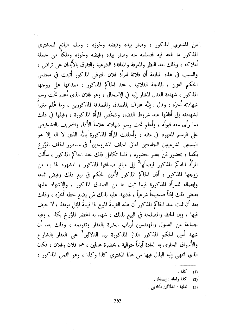 مِنَ الْمُشْتَرِي الْمَذْكُورِ وَصَارَ بِيَدِهِ وَقَبْضِهِ وَحَوْزِهِ وَسلم البَائِع للْمُشْتَرِي الْمَذْكُور مَا بَاعَهُ فِيهِ فَتَسَلَّمَهُ مِنْهُ وَصَارَ بِيَدِهِ وَقَبْضِهِ وَحَوْزِهِ وَمِلْكًا مِنْ جُمْلَةِ أَمْلَاكِهِ وَذَلِكَ بَعْدَ النَّظَرِ وَالْمَعْرِفَةِ وَالْمُعَاقَدَةِ الشَّرْعِيَّةِ وَالتَّفَرُّقِ بِالْأَبْدَانِ عَنْ تَرَاضٍ وَالسَّبَبُ فِي هَذِهِ الْمُبَايَعَةِ أَنَّ فُلَانَةَ امْرَأَةَ فُلَانٍ الْمُتَوَفَّى الْمَذْكُورِ أَثْبَتَتْ فِي مَجْلِسِ الْحُكْمِ الْعَزِيزِ بِالْمَدِينَةِ الْفُلَانِيَّةِ عِنْدَ الْحَاكِمِ الْمَذْكُور صَدَاقهَا على زَوجهَا الْمَذْكُور شَهَادَة الْعَدْلِ الْمُشَارِ إِلَيْهِ فِي الْإِسْجَالِ وَهُوَ فُلَانٌ الَّذِي أَعْلَمَ تَحْتَ رَسْمِ شَهَادَتِهِ آخِرَهُ وَقَالَ إِنَّهُ عَارِفٌ بِالْمُصْدِقِ وَالْمُصْدَقَةِ الْمَذْكُورَيْنِ وَمَا عُلِمَ مغيرا لشهادته إِلَى أَقَامَهَا عِنْدَ شُرُوطِ الْقَضَاءِ وَشَخَّصَ الْمَرْأَةَ الْمَذْكُورَةَ وَقَبِلَهَا فِي ذَلِكَ بِمَا رَأَى مَعَهُ قَبُولَهُ وَأَعْلَمَ تَحْتَ رَسْمِ شَهَادَتِهِ عَلَامَةَ الْأَدَاءِ وَالتَّعْرِيفَ بِالتَّشْخِيصِ عَلَى الرَّسْمِ الْمَعْهُودِ فِي مِثْلِهِ وَأُحْلِفَتِ الْمَرْأَةُ الْمَذْكُورَةُ بِاللَّهِ الَّذِي لَا إِلَهَ إِلَّا هُوَ الْيَمِينَيْنِ الشَّرْعِيَّتَيْنِ الْجَامِعَتَيْنِ لِمَعَانِي الْحَلِفِ الْمَشْرُوحَيْنِ فِي مَسْطُورِ الْحَلِفِ الْمُؤَرَّخِ بِكَذَا بِحُضُورِ مَنْ يُعْتَبَرُ حُضُورُهُ فَلَمَّا تَكَامَلَ ذَلِكَ عِنْدَ الْحَاكِمِ الْمَذْكُور سَالَتْ المراة الْحَاكِم الْمَذْكُور ليصالها إِلَى مَبْلَغِ صَدَاقِهَا الْمَذْكُورِ الْمَشْهُودِ لَهَا بِهِ من زَوجهَا الْمَذْكُور اذن الْحَاكِمُ الْمَذْكُورُ لِأَمِينِ الْحُكْمِ فِي بَيْعِ ذَلِكَ وَقَبْضِ ثَمَنِهِ وَإِيصَالِهِ لِلْمَرْأَةِ الْمَذْكُورَةِ فِيمَا ثَبَتَ لَهَا مِنَ الصَّدَاقِ الْمَذْكُورِ وَالْإِشْهَادِ عَلَيْهَا بِقَبْضِ ذَلِكَ إِذْنًا صَحِيحًا شَرْعِيًّا فَشَهِدَ عَلَيْهِ بِذَلِكَ مَنْ يَضَعُ خَطَّهُ آخِرَهُ وَذَلِكَ بَعْدَ أَنْ ثَبَتَ عِنْدَ الْحَاكِمِ الْمَذْكُورِ أَنَّ هَذِهِ الْقِيمَةَ الْمَبِيع لَهَا قِيمَةُ الْمِثْلِ يَوْمَئِذٍ لَا حَيْفَ فِيهَا وَأَنَّ الْحَظَّ وَالْمَصْلَحَةَ فِي الْبَيْعِ بِذَلِكَ شَهِدَ بِهِ الْمَحْضَرُ الْمُؤَرَّخُ بِكَذَا وَفِيهِ جَمَاعَةٌ مِنَ الْعُدُولِ وَالْمُهَنْدِسِينَ أَرْبَابِ الْخِبْرَةِ بِالْعَقَارِ وَتَقْوِيمِهِ وَذَلِكَ بَعْدَ ان شهد أَمِينُ الْحُكْمِ الْمَذْكُورُ الدَّارَ الْمَذْكُورَةَ بِيَدِ الدَّلَّالِينَ عَلَى الْعَقَارِ بِالشَّارِعِ وَالْأَسْوَاقِ الْجَارِي بِهِ الْعَادَةُ أَيَّامًا مُتَوَالِيَةً بِحَضْرَةِ عَدْلَيْنِ هُمَا فُلَانٌ وَفُلَانٌ فَكَانَ الَّذِي انْتَهَى إِلَيْهِ الْبَذْلُ فِيهَا مِنْ هَذَا الْمُشْتَرِي كَذَا وَكَذَا وَهُوَ الثَّمَنُ الْمَذْكُورُ
