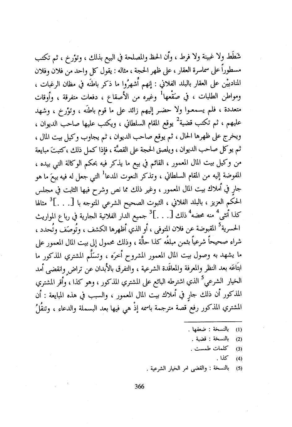 شطط وَلَا غبينة وَلَا فرط وَأَن الْحَظ وَالْمَصْلَحَةَ فِي الْبَيْعِ بِذَلِكَ وَتُؤَرِّخُ ثُمَّ تَكْتُبُ مَسْطُورًا عَلَى سَمَاسِرَةِ الْعَقَارِ عَلَى ظَهْرِ الْحُجَّةِ مِثَالُهُ يَقُولُ كُلُّ وَاحِدٍ مِنْ فُلَانٍ وَفُلَانٍ الْمُنَادِيَيْنِ عَلَى الْعَقَارِ بِالْبَلَدِ الْفُلَانِيِّ إِنَّهُمْ أَشْهَرُوا مَا ذُكِرَ بَاطِنَهُ فِي مَظَانِّ الرَّغَبَاتِ وَمَوَاطِنِ الطَّلَبَاتِ فِي صَقْعِهَا وَغَيْرِهِ مِنَ الْأَصْقَاعِ دُفُعَاتٍ مُتَفَرِّقَةً وَأَوْقَاتٍ مُتَعَدِّدَةً فَلَمْ يَسْمَعُوا وَلَا حَضَرَ إِلَيْهِمْ زَائِدٌ عَلَى مَا قُوِّمَ بَاطِنَهُ وَتُؤَرِّخُ وَشهد عَلَيْهِم ثمَّ تكْتب قَضِيَّة يُوقع الْمَقَامُ السُّلْطَانِيُّ وَيَكْتُبُ عَلَيْهَا صَاحِبُ الدِّيوَانِ وَيَخْرُجُ عَلَى ظَهْرِهَا الْحَالُ ثُمَّ يُوَقِّعُ صَاحِبُ الدِّيوَانِ ثُمَّ يُجَاوِبُ وَكِيلُ بَيْتِ الْمَالِ ثُمَّ يُوَكِّلُ صَاحِبُ الدِّيوَانِ وَيُلْصِقُ الْحُجَّةَ عَلَى الْقِصَّةِ فَإِذَا كَمُلَ ذَلِكَ كَتَبْتَ مُبَايَعَةً مِنْ وَكِيلِ بَيْتِ الْمَالِ الْمَعْمُورِ الْقَائِمِ فِي بَيْعِ مَا يُذْكَرُ فِيهِ بِحكم الْوكَالَة الَّتِي بِيَدِهِ المفوضة إِلَيْهِ من الْمقَام السلطاني وتذكر النعوت المدعا الَّتِي جَعَلَ لَهُ فِيهِ بَيْعَ مَا هُوَ جَارٍ فِي أَمْلَاكِ بَيْتِ الْمَالِ الْمَعْمُورِ وَغَيْرَ ذَلِكَ مِمَّا نَصَّ وَشَرَحَ فِيهَا الثَّابِتَ فِي مَجْلِسِ الْحُكْمِ الْعَزِيزِ 0 بِالْبَلَدِ الْفُلَانِيِّ الثُّبُوتَ الصَّحِيحَ الشَّرْعِيَّ الْمُتَوَجَّهَ بِا مِثَالُهَا كَذَا أَنْثَى مِنْهُ مَحْضَةُ ذَلِكَ جَمِيعَ الدَّارِ الْفُلَانِيَّةِ الْجَارِيَةِ فِي رباع الْمَوَارِيث الحسرية الْمَقْبُوضَةِ عَنْ فُلَانٍ الْمُتَوَفَّى أَوِ الَّذِي أَظْهَرَهَا الْكَشْفُ وَتُوصَفُ وَتُحَدَّدُ شِرَاءً صَحِيحًا شَرْعِيًّا بِثَمَنٍ مَبْلَغُهُ كَذَا حَالَّةً وَذَلِكَ مَحْمُولٌ إِلَى بَيْتِ الْمَالِ الْمَعْمُورِ عَلَى مَا يَشْهَدُ بِهِ وُصُولُ بَيْتِ الْمَالِ الْمَعْمُورِ الْمَشْرُوحِ آخِرَهُ وَتَسَلَّمَ الْمُشْتَرِي الْمَذْكُورُ مَا ابْتَاعَهُ بَعْدَ النَّظَرِ وَالْمَعْرِفَةِ وَالْمُعَاقَدَةِ الشَّرْعِيَّةِ وَالتَّفَرُّقِ بِالْأَبْدَانِ عَنْ تَرَاضٍ وَانْقَضَى أَمَدُ الْخِيَارِ الشَّرْعِيِّ الَّذِي اشْتَرَطَهُ الْبَائِعُ عَلَى الْمُشْتَرِي الْمَذْكُورِ وَهُوَ كَذَا وَأَقَرَّ الْمُشْتَرِي الْمَذْكُورُ أَنَّ ذَلِكَ جَارٍ فِي أَمْلَاكِ بَيْتِ الْمَالِ الْمَعْمُورِ وَالسَّبَبُ فِي هَذِهِ الْمُبَايَعَةِ أَنَّ الْمُشْتَرِيَ الْمَذْكُورَ رَفَعَ قِصَّةً مُتَرْجَمَةً بِاسْمِهِ إِذْ هِيَ فِيهَا بَعْدَ الْبَسْمَلَةِ وَالدُّعَاءِ وَتَنْقُلُ