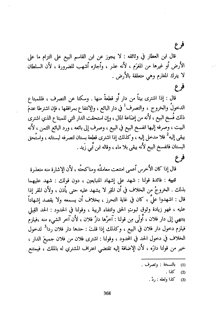 قَالَ ابْنُ الْعَطَّارِ فِي وَثَائِقِهِ لَا يَجُوزُ عَنِ ابْنِ الْقَاسِمِ الْبَيْعُ عَلَى الْتِزَامِ مَا عَلَى الْأَرْضِ أَوْ غَيْرِهَا مِنَ الْمَغْرَمِ لِأَنَّهُ عذر وَأَجَازَهُ أَشْهَبُ لِلضَّرُورَةِ لِأَنَّ السُّلْطَانَ لَا يَتْرُكُ الْمَغَارِمَ وَهِيَ مُتَعَلِّقَةٌ بِالْأَرْضِ