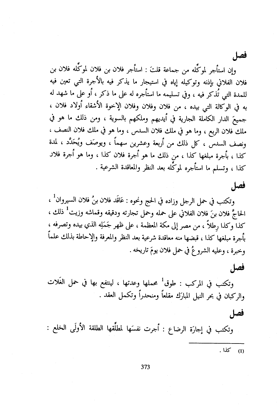 وَتَكْتُبُ فِي حَمْلِ الرَّجُلِ وَزَادِهِ فِي الْحَجِّ وَنَحْوِهِ عَاقَدَ فلَان بن فلَان السيروان الْحَاج فُلَانَ بْنَ فُلَانٍ الْفُلَانِيَّ عَلَى حَمْلِهِ وَحَمْلِ تِجَارَته ودقيقه وقماشه وزيت ذَلِكَ كَذَا وَكَذَا رِطْلًا مِنْ مِصْرَ إِلَى مَكَّةَ الْمُعَظَّمَةِ عَلَى ظَهْرِ جَمَلِهِ الَّذِي بِيَدِهِ وَتَصَرُّفِهِ بِأُجْرَةٍ مَبْلَغُهَا كَذَا قَبَضَهَا مِنْهُ مُعَاقَدَةً شَرْعِيَّةً بَعْدَ النَّظَرِ وَالْمَعْرِفَةِ وَالْإِحَاطَةِ بِذَلِكَ عِلْمًا وَخِبْرَةً وَعَلَيْهِ الشُّرُوعُ فِي حَمْلِ فُلَانٍ يَوْمَ تَارِيخِهِ