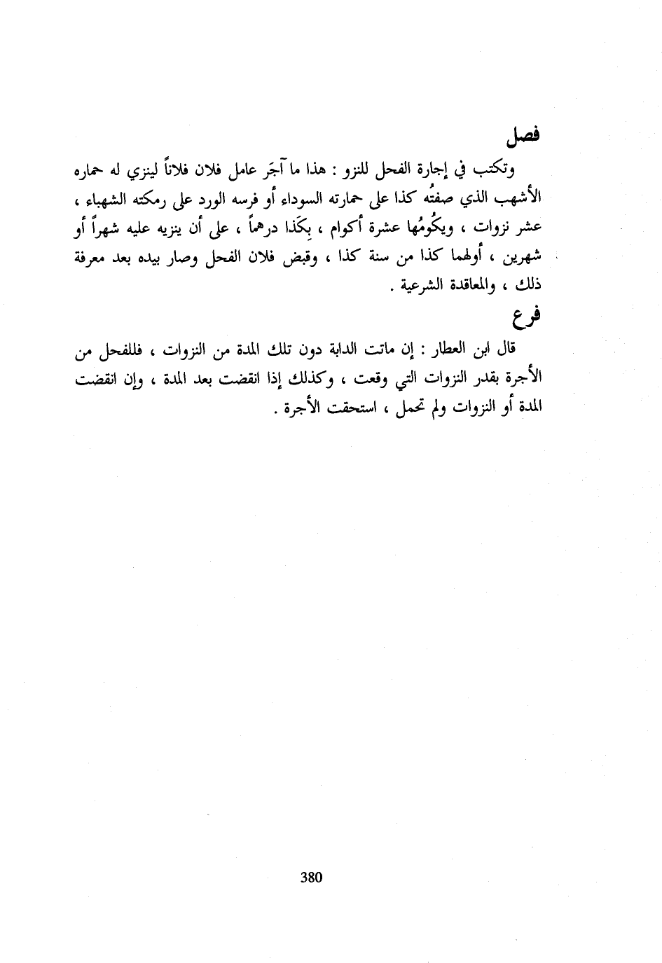 وَتَكْتُبُ فِي إِجَارَةِ الْفَحْلِ لِلنَّزْوِ هَذَا مَا آجَرَ عَامِلُ فُلَانٍ فُلَانًا لِيَنْزِيَ لَهُ حِمَارُهُ الْأَشْهَبُ الَّذِي صِفَتُهُ كَذَا عَلَى حِمَارَتِهِ السَّوْدَاءِ أَوْ فَرَسُهُ الْوَرْدُ عَلَى رَمْكَتِهِ الشَّهْبَاءِ عَشْرَ نَزَوَاتٍ وَيُكَوِّمُهَا عَشَرَةَ أَكْوَامٍ بِكَذَا دِرْهَمًا عَلَى أَنْ يُنْزِيَهُ عَلَيْهِ شَهْرًا أَوْ شَهْرَيْنِ أَوَّلُهُمَا كَذَا مِنْ سَنَةِ كَذَا وَقَبَضَ فُلَانٌ الْفَحْلَ وَصَارَ بِيَدِهِ بَعْدَ مَعْرِفَةِ ذَلِكَ وَالْمُعَاقَدَةِ الشَّرْعِيَّةِ