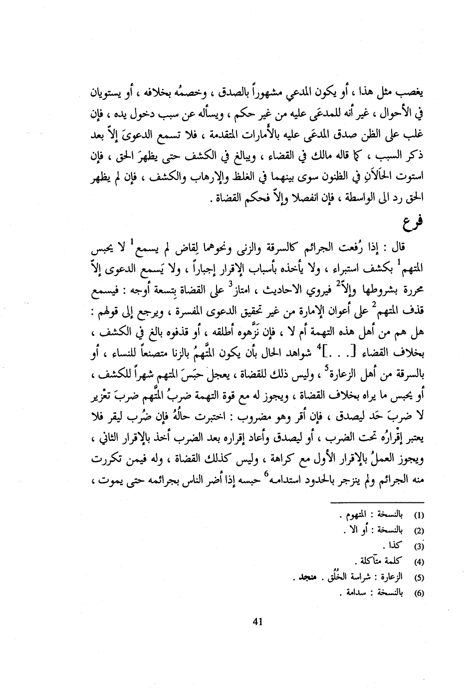قَالَ إِذَا رُفِعَتِ الْجَرَائِمُ كَالسَّرِقَةِ وَالزِّنَى وَنَحْوِهِمَا لِقَاضٍ لَمْ يَسْمَعْ لَا يُحْبَسُ الْمُتَّهَمُ بِكَشْفِ اسْتِبْرَاءٍ وَلَا يَأْخُذُهُ بِأَسْبَابِ الْإِقْرَارِ إِجْبَارًا وَلَا يَسْمَعُ الدَّعْوَى إِلَّا مُحَرَّرَةً بِشُرُوطِهَا وَإِلَّا فَيَرْوِي الْأَحَادِيثَ امْتَازَ عَلَى الْقُضَاةِ بِتِسْعَةِ أَوْجُهٍ فَيَسْمَعُ قَذْفَ الْمُتَّهَمِ عَلَى أَعْوَانِ الْإِمَارَةِ مِنْ غَيْرِ تَحْقِيقِ الدَّعْوَى الْمُفَسَّرَةِ وَيَرْجِعُ إِلَى قَوْلِهِمْ هَلْ هُمْ مِنْ أَهْلِ هَذِهِ التُّهْمَةِ أَمْ لَا فَإِنْ نَزَّهُوهُ أَطْلَقَهُ أَوْ قَذَفُوهُ بَالِغَ فِي الْكَشْف بِخِلَاف الْقُضَاة شَوَاهِدَ الْحَالِ بِأَنْ يَكُونَ الْمُتَّهَمُ بِالزِّنَا مُتَصَنِّعًا للنِّسَاء أَو بِالسَّرقَةِ من أهل الزعارة وَلَيْسَ ذَلِك للقضاة يعجل حَبْسَ الْمُتَّهَمِ شَهْرًا لِلْكَشْفِ أَوْ يَحْبِسُ مَا يَرَاهُ بِخِلَافِ الْقُضَاةِ وَيَجُوزُ لَهُ مَعَ قُوَّةِ التُّهْمَةِ ضَرْبُ الْمُتَّهَمِ ضَرْبَ تَعْزِيرٍ لَا ضَرْبَ حَدٍّ لِيَصْدُقَ فَإِنْ أَقَرَّ وَهُوَ مَضْرُوبٌ اخْتُبِرَتْ حَالُهُ فَإِنْ ضُرِبَ لِيُقِرَّ فَلَا يُعْتَبَرُ إِقْرَارُهُ تَحْتَ الضَّرْبِ أَوْ لِيُصَدَّقَ وَأَعَادَ إِقْرَارَهُ بَعْدَ الضَّرْبِ أَخَذَ بِالْإِقْرَارِ الثَّانِي وَيَجُوزُ الْعَمَلُ بِالْإِقْرَارِ الْأَوَّلِ مَعَ كَرَاهَةٍ وَلَيْسَ كَذَلِكَ الْقُضَاةُ وَلَهُ فِيمَنْ تَكَرَّرَتْ مِنْهُ الْجَرَائِمُ وَلَمْ يَنْزَجِرْ بِالْحُدُودِ اسْتِدَامَةُ حَبْسِهِ إِذَا أَضَرَّ النَّاسَ بِجَرَائِمِهِ حَتَّى يَمُوت