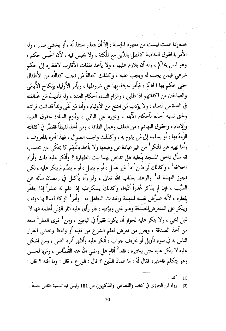 هَذِهِ إِذَا عَمَّتْ لَيْسَتْ مِنْ مَعْهُودِ الْحِسْبَةِ إِلَّا أَنْ يَتَعَذَّرَ اسْتِئْذَانُهُ أَوْ يُخْشَى ضَرَرٌ وَلَهُ الْأَمْرُ بِالْحُقُوقِ الْخَاصَّةِ كَالْمَطْلِ بِالدَّيْنِ مَعَ الْمُكْنَةِ وَلَا يَحْبِسُ فِيهِ لِأَنَّ الْحَبْسَ حُكْمٌ وَهُوَ لَيْسَ بِحَاكِمٍ وَلَهُ أَنْ يُلَازِمَ عَلَيْهَا وَلَا يَأْخُذَ نَفَقَاتِ الْأَقَارِبِ لِافْتِقَارِهِ إِلَى حُكْمٍ شَرْعِيٍّ فِيمَنْ يَجِبُ لَهُ وَيَجِبُ عَلَيْهِ وَكَذَلِكَ كَفَالَةُ مَنْ تَجِبُ كَفَالَتُهُ مِنَ الْأَطْفَالِ حَتَّى يَحْكُمَ بِهَا الْحَاكِمُ فَيَأْمُرُ حِينَئِذٍ بِهَا عَلَى شُرُوطِهَا وَيَأْمُرُ الْأَوْلِيَاءَ بِإِنْكَاحِ الْأَيَامَى وَالصَّالِحِينَ مِنْ أَكْفَائِهِمْ إِذَا طَلَبْنَ وَإِلْزَامِ النِّسَاءِ أَحْكَامَ الْعِدَدِ وَلَهُ تَأْدِيبُ مَنْ خَالَفَتْهُ فِي الْعِدَّةِ مِنَ النِّسَاءِ وَلَا يُؤَدِّبُ مَنِ امْتَنَعَ مِنَ الْأَوْلِيَاءِ وَأَمَّا مَنْ نَفَى وَلَدًا قَدْ ثَبَتَ فِرَاشُهُ وَلُحِقَ نَسَبُهُ أَخَذَهُ بِأَحْكَامِ الْآبَاءِ وَعَزَّرَهُ عَلَى الْبَاقِي وَيُلْزِمُ السَّادَةَ حُقُوقَ الْعَبِيدِ وَالْإِمَاءِ وَحُقُوقَ الْبَهَائِمِ مِنَ الْعَلَفِ وَعَمَلِ الطَّاقَةِ وَمَنْ أَخَذَ لقيطا فقصر فِي كفَالَته الزمه بهَا أَوْ يُسَلِّمُهُ إِلَى مَنْ يَقُومُ بِهِ وَكَذَلِكَ وَاجِبُ الضَّوَالِّ فَهَذَا أَمْرُهُ بِالْمَعْرُوفِ وَأَمَّا نَهْيُهُ عَنِ الْمُنْكَرِ مِنْ غَيْرِ عِبَادَةٍ عَنْ وَضْعِهَا وَلَا يَأْخُذُ بِالتُّهَمِ كَمَا يُحْكَى عَنْ مُحْتَسِبٍ أَنَّهُ سَأَلَ دَاخِلَ الْمَسْجِدِ بِنَعْلَيْهِ هَلْ تَدْخُلُ بِهِمَا بَيْتَ الطَّهَارَةِ وَأَنْكَرَ عَلَيْهِ ذَلِكَ وَأَرَادَ إِخْلَافَهُ وَكَذَلِكَ لَوْ ظَنَّ أَنَّهُ غَيْرُ غُسْلٍ أَوْ لَمْ يُصَلِّ أَوْ لَمْ يَصُمْ لَمْ يُنْكِرْ عَلَيْهِ لَكِنْ تَجُوزُ التُّهْمَةُ لَهُ وَالْوَعْظُ بِعَذَابِ اللَّهِ تَعَالَى وَلَوْ رَآهُ يَأْكُلُ فِي رَمَضَان سَأَلَهُ عَن السَّبَب فَإِن لَمْ يَذْكُرْ عُذْرًا أَدَّبَهُ وَكَذَلِكَ يُنْكِرُ عَلَيْهِ إِذَا عَلِمَ لَهُ عُذْرًا إِذَا جَاهَرَ بِفِطْرِهِ لِأَنَّهُ عرض نَفسه للتُّهمَةِ واقتداث الْجَاهِلِ بِهِ وَأَمْرُ الزَّكَاةِ لِعُمَّالِهَا دُونَهُ وَيُنْكِرُ عَلَى الْمُتَعَرِّضِ لِلصَّدَقَةِ وَهُوَ غَنِيٌّ وَيُؤَدِّبُهُ فَلَوْ رَأَى عَلَيْهِ آثَارَ الْغِنَى أَعْلَمَهُ أَنَّهَا لَا تَحِلُّ لِغَنِيٍّ وَلَا يُنْكِرُ عَلَيْهِ لِجَوَازِ أَنْ يكون فَقِيرا فِي الْبَاطِن وَمن فوى العتار مَنَعَهُ مَنْ أَخْذِ الصَّدَقَةِ وَيُعَزِّرُ مَنْ تَعَرَّضَ لِعِلْمِ الشَّرْعِ مِنْ فَقِيهٍ أَوْ وَاعِظٍ وَخَشِيَ اغْتِرَارَ النَّاسِ بِهِ فِي سُوءِ تَأْوِيلٍ أَوْ تَحْرِيف جَوَاب أنكر عَلَيْهِ وَأظْهر أمره النَّاس وَمَنْ أُشْكِلَ عَلَيْهِ لَا يُنْكِرُ عَلَيْهِ حَتَّى يَخْتَبِرَهُ فَقَدْ أَقَامَ عَلِيٌّ رَضِيَ اللَّهُ عَنْهُ الْقصاص ومربا لحسن وَهُوَ يَتَكَلَّمُ فَاخْتَبَرَهُ فَقَالَ لَهُ مَا عِمَادُ الدِّينِ قَالَ الْوَرَعُ قَالَ وَمَا آفَتُهُ قَالَ