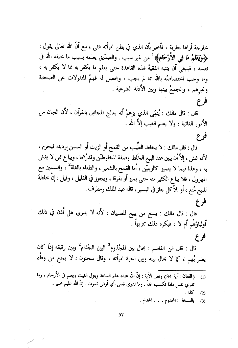 خَارِجَةَ أَرَاهَا جَارِيَةً فَأَخْبَرَ بِأَنَّ الَّذِي فِي بَطْنِ امْرَأَتِهِ أُنْثَى مَعَ أَنَّ اللَّهَ تَعَالَى يَقُول {وَيعلم مَا فِي الْأَرْحَام} مِنْ غَيْرِ سَبَبٍ وَالصِّدِّيقُ يَعْلَمُهُ بِسَبَبِ مَا خَلَقَهُ اللَّهُ فِي نَفْسِهِ فَيَنْبَغِي أَنْ يَتَنَبَّهَ الْفَقِيهُ لِهَذِهِ الْقَاعِدَةِ حَتَّى يَعْلَمَ مَا يُكَفِّرُ بِهِ مِمَّا لَا يُكَفِّرُ بِهِ وَمَا وَجَبَ اخْتِصَاصُهُ بِاللَّهِ مِمَّا لَمْ يَجِبْ وَيَحْصُلُ لَهُ فَهْمُ الْمَنْقُولَاتِ عَنِ الصَّحَابَةِ وَغَيْرِهِمْ وَالْجَمْعُ بَيْنَهَا وَبَيْنَ الْأَدِلَّةِ الشَّرْعِيَّةِ