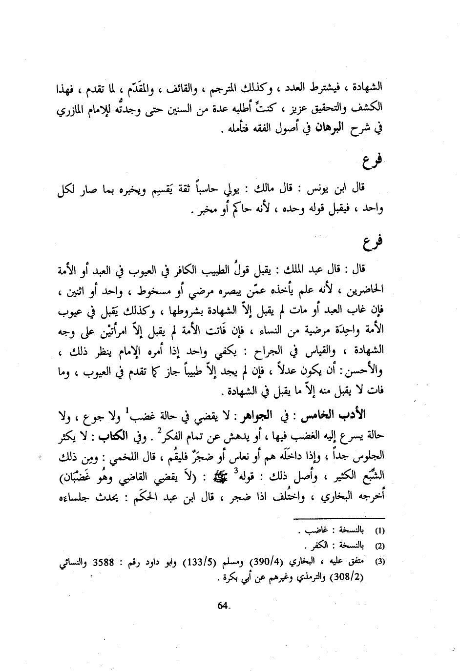 قَالَ قَالَ عَبْدُ الْمَلِكِ يُقْبَلُ قَوْلُ الطَّبِيبِ الْكَافِرِ فِي الْعُيُوبِ فِي الْعَبْدِ أَوِ الْأَمَةِ الْحَاضِرَيْنِ لِأَنَّهُ عِلْمٌ يَأْخُذُهُ عَمَّنْ يُبْصِرُهُ مَرْضِيٌّ أَوْ مسخوط وَاحِد أَو اثْنَيْنِ فَإِنْ غَابَ الْعَبْدُ أَوْ مَاتَ لَمْ يَقْبَلْ إِلَّا الشَّهَادَةَ بِشُرُوطِهَا وَكَذَلِكَ يَقْبَلُ فِي عُيُوبِ الْأَمَةِ وَاحِدَةً مَرَضِيَّةً مِنَ النِّسَاءِ فَإِنْ فَاتَتِ الْأَمَةُ لَمْ يَقْبَلْ إِلَّا امْرَأَتَيْنِ عَلَى وَجْهِ الشَّهَادَةِ وَالْقِيَاسُ فِي الْجِرَاحِ يَكْفِي وَاحِدٌ إِذَا أَمَرَهُ الْإِمَامُ يَنْظُرُ ذَلِكَ وَالْأَحْسَنُ أَنْ يَكُونَ عَدْلًا فَإِنْ لَمْ يَجِدْ إِلَّا طَبِيبًا جَازَ كَمَا تَقَدَّمَ فِي الْعُيُوبِ وَمَا فَاتَ لَا يُقْبَلُ مِنْهُ إِلَّا مَا يُقْبَلُ فِي الشَّهَادَةِ الْأَدَبُ الْخَامِسُ فِي الْجَوَاهِرِ لَا يَقْضِي فِي حَالَةِ غَضَبٍ وَلَا جُوعٍ وَلَا حَالَةٍ يُسْرِعُ إِلَيْهِ الْغَضَبُ فِيهَا أَوْ يُدْهَشُ عَنْ تَمَامِ الْفِكْرِ وَفِي الْكِتَابِ لَا يُكْثِرُ الْجُلُوسَ جِدًّا وَإِذَا دَاخَلَهُ هَمٌّ أَوْ نُعَاسٌ أَوْ ضَجَرٌ فَلْيَقُمْ قَالَ اللَّخْمِيُّ وَمِنْ ذَلِكَ الشَّبَعُ الْكَثِيرُ وَأَصْلُ ذَلِكَ قَوْلُهُ - صَلَّى اللَّهُ عَلَيْهِ وَسَلَّم َ - لَا يقْضِي الْقَاضِي وَهُوَ غَضْبَانُ أَخْرَجَهُ الْبُخَارِيُّ وَاخْتُلِفَ إِذَا ضَجِرَ قَالَ ابْنُ عَبْدِ الْحَكَمِ يُحَدِّثُ جُلَسَاءَهُ
