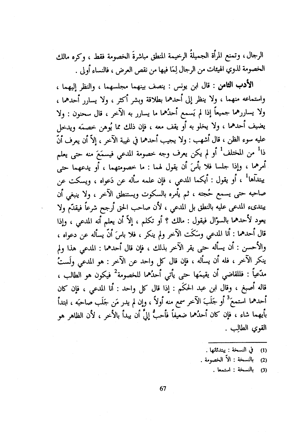 الرِّجَالِ وَتُمْنَعُ الْمَرْأَةُ الْجَمِيلَةُ الرَّخِيمَةُ الْمَنْطِقِ مُبَاشَرَةَ الْخُصُومَةِ فَقَطْ وَكَرِهَ مَالِكٌ الْخُصُومَةَ لِذَوِي الْهَيْئَاتِ مِنَ الرِّجَالِ لِمَا فِيهَا مِنْ نَقْصِ الْعِرْضِ فالنساء أولى الْأَدَبُ الثَّامِنُ قَالَ ابْنُ يُونُسَ يُنْصِفُ بَيْنَهُمَا مَجْلِسَهُمَا وَالنَّظَرَ إِلَيْهِمَا وَاسْتِمَاعَهُ مِنْهُمَا وَلَا يَنْظُرُ إِلَى أَحَدِهِمَا بِطَلَاقَةٍ وَبِشْرٍ أَكْثَرَ وَلَا يُسَارِرُ أَحَدَهُمَا وَلَا يُسَارِرُهُمَا جَمِيعًا إِذَا لَمْ يَسْمَعْ أَحَدُهُمَا مَا يُسَارِرُ بِهِ الْآخَرَ قَالَ سَحْنُونٌ وَلَا يُضَيِّفُ أَحَدَهُمَا وَلَا يَخْلُو بِهِ أَوْ يَقِفُ مَعَهُ فَإِنَّ ذَلِكَ مِمَّا يُوهِنُ خَصْمَهُ وَيُدْخِلُ عَلَيْهِ سُوءَ الظَّنِّ قَالَ أَشْهَبُ وَلَا يُجِيبُ أَحَدَهُمَا فِي غَيْبَةِ الْآخَرِ إِلَّا أَنْ يَعْرِفَ أَنَّ ذَا مِنَ الْمُخْتَلِفِ أَوْ لَمْ يَكُنْ يَعْرِفُ وَجْهَ خُصُومَةِ الْمُدَّعِي فَيَسْمَعَ مِنْهُ حَتَّى يَعْلَمَ أَمْرَهُمَا وَإِذَا جَلَسَا فَلَا بَأْسَ أَنْ يَقُولَ لَهُمَا مَا خُصُومَتُهُمَا أَوْ يَدَعَهُمَا حَتَّى يَبْتَدِآهَا أَوْ يَقُولَ أَيُّكُمَا الْمُدَّعِي فَإِنْ عَلِمَهُ سَأَلَهُ عَنْ دَعْوَاهُ وَيَسْكُتُ عَنْ صَاحِبِهِ حَتَّى يَسْمَعَ حُجَّتَهُ ثُمَّ يَأْمُرُهُ بِالسُّكُوتِ وَيَسْتَنْطِقُ الْآخَرَ وَلَا يَنْبَغِي أَنْ يَبْتَدِئَ الْمُدَّعَى عَلَيْهِ بِالنُّطْقِ بَلِ الْمُدَّعِي لِأَنَّ صَاحِبَ الْحَقِّ أَرْجَحُ شَرْعًا فَيُقَدَّمُ وَلَا يَعُودُ لِأَحَدِهِمَا بِالسُّؤَالِ فَيَقُولُ مَالك أَوْ تَكَلَّمْ إِلَّا أَنْ يَعْلَمَ أَنَّهُ الْمُدَّعِي وَإِذَا قَالَ أَحَدُهُمَا أَنَا الْمُدَّعِي وَسَكَتَ الْآخَرُ وَلَمْ يُنْكِرْ فَلَا بَأْسَ أَنْ يَسْأَلَهُ عَنْ دَعْوَاهُ وَالْأَحْسَنُ أَنْ يَسْأَلَهُ حَتَّى يُقِرَّ الْآخَرُ بِذَلِكَ فَإِنْ قَالَ أَحَدُهُمَا الْمُدَّعِي هَذَا وَلَمْ يُنْكِرِ الْآخَرُ فَلَهُ أَنْ يَسْأَلَهُ فَإِنْ قَالَ كُلُّ وَاحِدٍ عَنِ الْآخَرِ هُوَ الْمُدَّعِي وَلَسْتُ مَدَّعِيًا فَلِلْقَاضِي أَنْ يُقِيمَهَا حَتَّى يَأْتِيَ أَحَدُهُمَا لِلْخُصُومَةِ فَيَكُونَ هُوَ الطَّالِبَ قَالَهُ أَصْبَغُ وَقَالَ ابْنُ عَبْدِ الْحَكَمِ إِذَا قَالَ كُلُّ وَاحِدٍ أَنَا الْمُدَّعِي فَإِنْ كَانَ أَحَدُهُمَا اسْتَمَعَ أَوْ جَلَبَ الْآخَرَ سَمِعَ مِنْهُ أَوَّلًا وَإِنْ لَمْ يَدْرِ مَنْ جَلَبَ صَاحِبَهُ ابْتَدَأَ بِأَيِّهِمَا شَاءَ فَإِنْ كَانَ أَحَدُهُمَا ضَعِيفًا فَأَحَبُّ إِلَيَّ أَنْ يَبْدَأَ بِالْآخَرِ لِأَنَّ الظَّاهِرَ هُوَ الْقَوِيُّ الطَّالِبُ