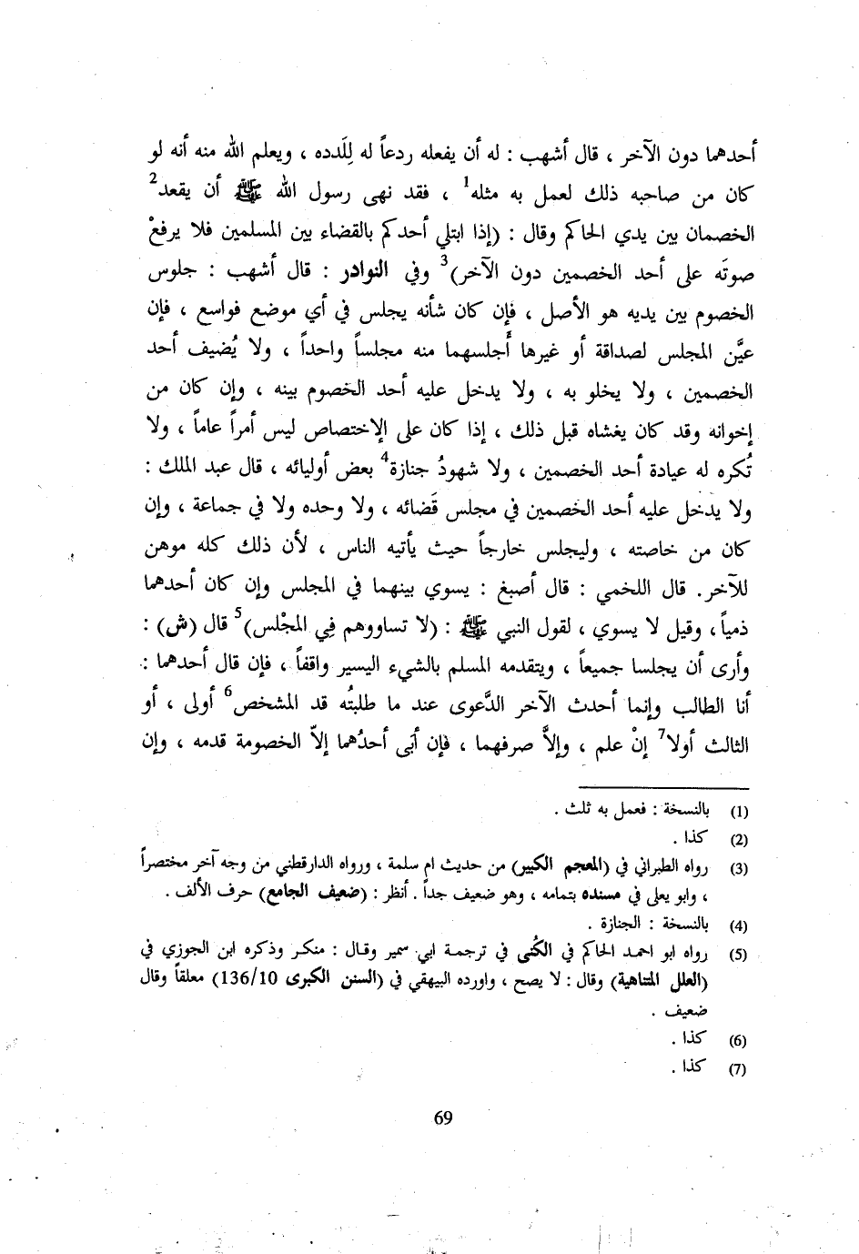 أَحَدِهِمَا دُونَ الْآخَرِ قَالَ أَشْهَبُ لَهُ أَنْ يَفْعَلَهُ رَدْعًا لَهُ لِلَدَدِهِ وَيَعْلَمُ اللَّهُ مِنْهُ أَنَّهُ لَوْ كَانَ مِنْ صَاحِبِهِ ذَلِكَ لَعَمِلَ بِهِ مِثْلَهُ فَقَدْ نَهَى رَسُولُ اللَّهِ - صَلَّى اللَّهُ عَلَيْهِ وَسَلَّم َ - أَنْ يَقْعُدَ الْخَصْمَانِ بَيْنَ يَدَيِ الْحَاكِمِ وَقَالَ إِذَا ابْتُلِيَ أَحَدُكُمْ بِالْقَضَاءِ بَيْنَ الْمُسْلِمِينَ فَلَا يَرْفَعْ صَوْتَهُ عَلَى أَحَدِ الْخَصْمَيْنِ دُونَ الْآخَرِ وَفِي النَّوَادِرِ قَالَ أَشْهَبُ جُلُوسُ الْخُصُومِ بَيْنَ يَدَيْهِ هُوَ الْأَصْلُ فَإِنْ كَانَ شَأْنُهُ يَجْلِسُ فِي أَيِّ مَوْضِعٍ فَوَاسِعٌ فَإِنْ عَيَّنَ الْمَجْلِسَ لِصَدَاقَةٍ أَوْ غَيْرِهَا أَجْلَسَهُمَا مِنْهُ مَجْلِسًا وَاحِدًا وَلَا يُضَيِّفُ أَحَدَ الْخَصْمَيْنِ وَلَا يَخْلُو بِهِ وَلَا يَدْخُلُ عَلَيْهِ أَحَدُ الْخُصُومِ بَيْنَهُ وَإِنْ كَانَ مِنْ إِخْوَانِهِ وَقَدْ كَانَ يَغْشَاهُ قَبْلَ ذَلِكَ إِذَا كَانَ عَلَى الِاخْتِصَاصِ لَيْسَ أَمْرًا عَامًّا وَلَا تُكْرَهُ لَهُ عِيَادَةُ أَحَدِ الْخَصْمَيْنِ وَلَا شُهُودُ جِنَازَةِ بَعْضِ أَوْلِيَائِهِ قَالَ عَبْدُ الْمَلِكِ وَلَا يَدْخُلُ عَلَيْهِ أَحَدُ الْخَصْمَيْنِ فِي مَجْلِسِ قَضَائِهِ وَلَا وَحْدَهُ وَلَا فِي جَمَاعَةٍ وَإِنْ كَانَ مِنْ خَاصَّتِهِ وَلْيَجْلِسْ خَارِجًا حَيْثُ يَأْتِيهِ النَّاسُ لِأَنَّ ذَلِكَ كُلَّهُ مُوهِنٌ لِلْآخَرِ قَالَ اللَّخْمِيُّ قَالَ أَصْبَغُ يُسَوِّي بَيْنَهُمَا فِي الْمجْلس وَإِن كَانَ أَحدهمَا ذَمِيمًا وَقِيلَ لَا يُسَوِّي لِقَوْلِ النَّبِيِّ - صَلَّى اللَّهُ عَلَيْهِ وَسَلَّم َ - لَا تُسَاوُوهُمْ فِي الْمَجْلِسِ قَالَ ش وَأَرَى أَنْ يَجْلِسَا جَمِيعًا وَيَتَقَدَّمَهُ الْمُسْلِمُ بِالشَّيْءِ الْيَسِيرِ وَاقِفًا فَإِنْ قَالَ أَحَدُهُمَا أَنَا الطَّالِبُ وَإِنَّمَا أحدث الآخر الدَّعْوَى عِنْد مَا طلبته قد الْمُشَخِّصِ أَوْلَى أَوِ الثَّالِثُ أَوَّلًا إِنْ عَلِمَ وَإِلَّا صَرَفَهُمَا فَإِنْ أَبَى أَحَدُهُمَا إِلَّا الْخُصُومَةَ قدمه وَإِن