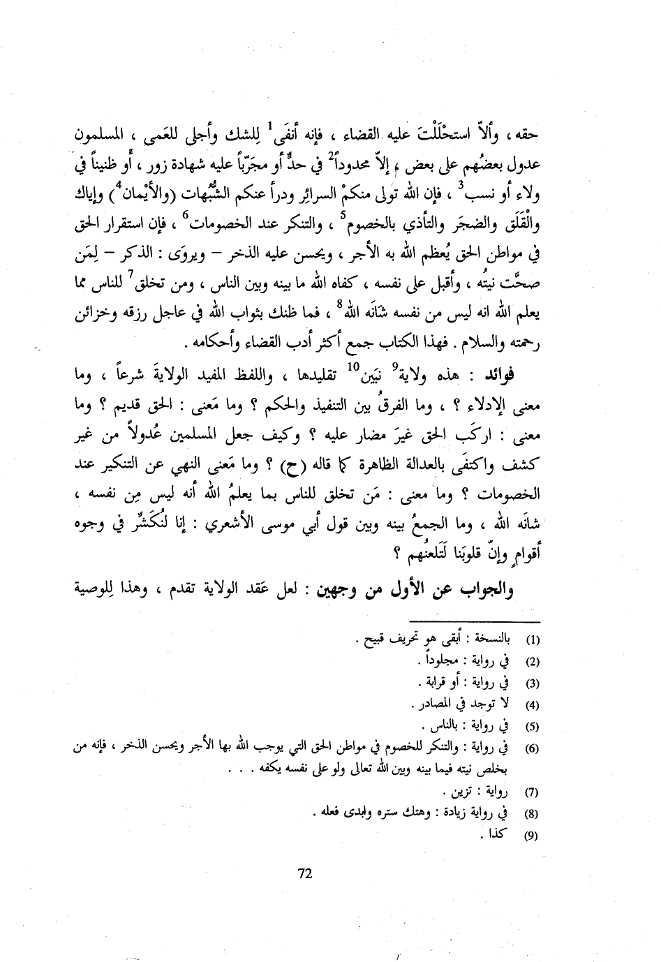 حَقَّهُ وَإِلَّا اسْتَحْلَلْتَ عَلَيْهِ الْقَضَاءَ فَإِنَّهُ أَنْفَى للشَّكّ وَأجل لِلْعَمَى الْمُسْلِمُونَ عُدُولٌ بَعْضُهُمْ عَلَى بَعْضٍ إِلَّا مَحْدُودًا فِي حَدٍّ أَوْ مُجَرَّبًا عَلَيْهِ شَهَادَةُ زُورٍ أَوْ ظَنِينًا فِي وَلَاءٍ أَوْ نَسَبٍ فَإِنَّ اللَّهَ تَوَلَّى مِنْكُمُ السَّرَائِرَ وَدَرَأَ عَنْكُمُ الشُبُهُاتِ وَالْأَيْمَانِ وَإِيَّاكَ وَالَقْلَقَ وَالضَّجَرَ وَالتَّأَذِّيَ بِالْخُصُومِ وَالتَّنَكُّرَ عِنْدَ الْخُصُومَاتِ فَإِنَّ اسْتِقْرَارَ الْحَقِّ فِي مَوَاطِنِ الْحَقِّ يُعَظِّمُ اللَّهُ بِهِ الْأَجْرَ وَيُحْسِنُ عَلَيْهِ الذُّخْرَ وَيُرْوَى الذِّكْرَ لِمَنْ صَحَّتْ نيَّتُهُ وَأَقْبَلَ عَلَى نَفْسِهِ كَفَاهُ اللَّهُ مَا بَيْنَهُ وَبَيْنَ النَّاسِ وَمَنْ تَخَلَّقَ لِلنَّاسِ مِمَّا يَعْلَمُ اللَّهُ أَنَّهُ لَيْسَ مِنْ نَفْسِهِ شَانَهُ اللَّهُ فَمَا ظَنُّكَ بِثَوَابِ اللَّهِ فِي عَاجِلِ رِزْقِهِ وَخَزَائِنِ رَحْمَتِهِ وَالسَّلَامُ فَهَذَا الْكِتَابُ جَمَعَ أَكْثَرَ أَدَبِ الْقَضَاءِ وَأَحْكَامِهِ فَوَائِدُ هَذِهِ وَلِايَةٌ نُبَيِّنُ تَقْلِيدَهَا وَاللَّفْظُ الْمُفِيدُ الْوِلَايَةَ شَرْعًا وَمَا مَعْنَى الْإِدْلَاءِ وَمَا الْفَرْقُ بَيْنَ التَّنْفِيذِ وَالْحُكْمِ وَمَا مَعْنَى الْحَقُّ قَدِيمٌ وَمَا مَعْنَى ارْكَبِ الْحَقَّ غَيْرَ مُضَارٍّ عَلَيْهِ وَكَيْفَ جَعَلَ الْمُسْلِمِينَ عُدُولًا مِنْ غَيْرِ كَشْفٍ وَاكْتَفَى بِالْعَدَالَةِ الظَّاهِرَةِ كَمَا قَالَهُ ح وَمَا مَعْنَى النَّهْيِ عَنِ التَّنْكِيرِ عِنْدَ الْخُصُومَاتِ وَمَا مَعْنَى مَنْ تَخَلَّقَ لِلنَّاسِ بِمَا يَعْلَمُ اللَّهُ أَنَّهُ لَيْسَ مِنْ نَفْسِهِ شَانَهُ اللَّهُ وَمَا الْجَمْعُ بَيْنَهُ وَبَيْنَ قَوْلِ أَبِي مُوسَى الْأَشْعَرِيِّ إِنَّا لَنَكْشِرُ فِي وُجُوهِ أَقْوَامٍ وَإِنَّ قُلُوبَنَا لَتَلْعَنُهُمْ وَالْجَوَابُ عَنِ الْأَوَّلِ من وَجْهَيْن لَعَلَّ عَقْدَ الْوِلَايَةِ تَقَدَّمَ وَهَذَا لِلْوَصِيَّةِ