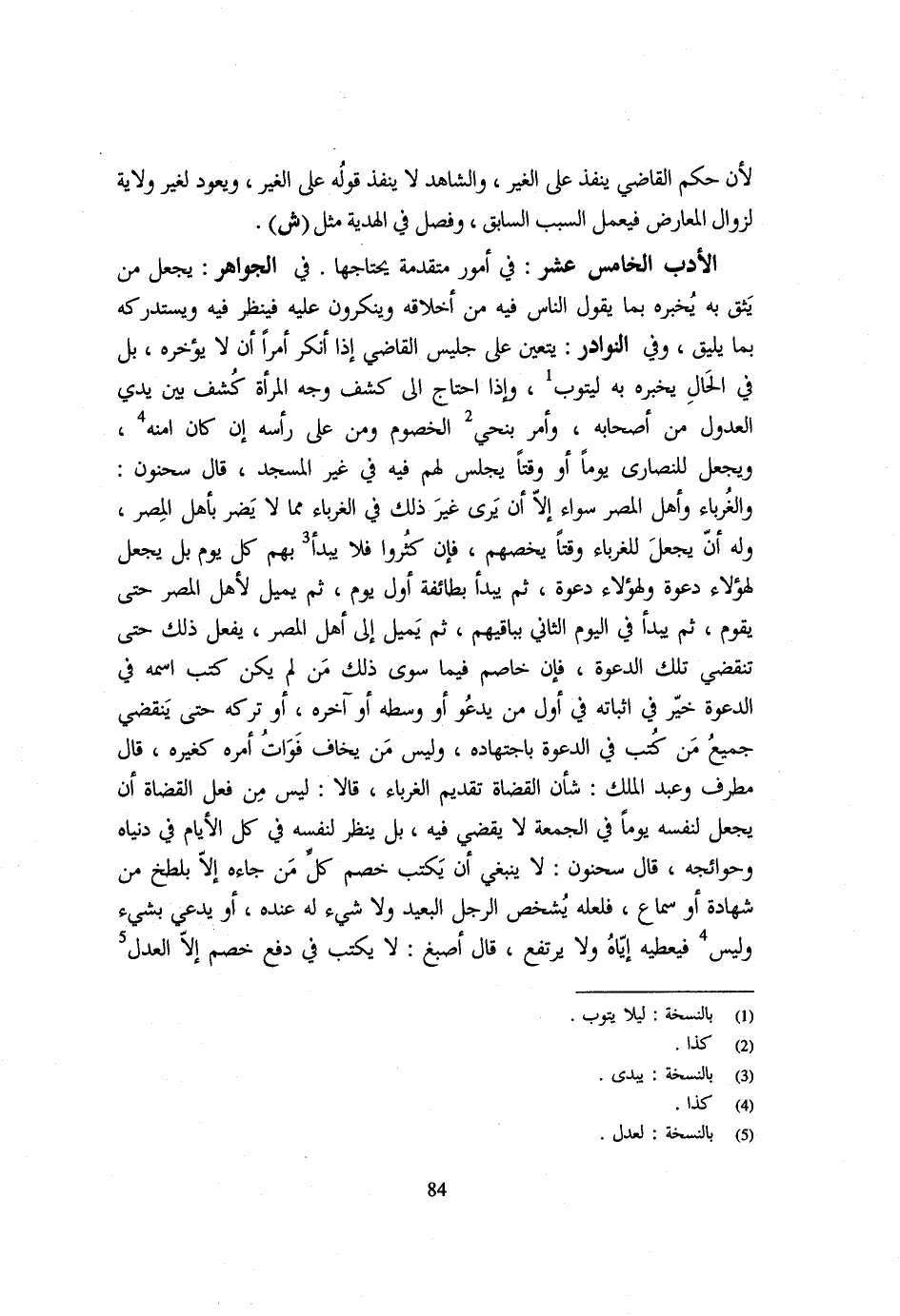 لِأَنَّ حُكْمَ الْقَاضِي يُنَفَّذُ عَلَى الْغَيْرِ وَالشَّاهِدُ لَا يَنْفُذُ قَوْلُهُ عَلَى الْغَيْرِ وَيَعُودُ لِغَيْرِ وِلَايَةٍ لِزَوَالِ الْمُعَارِضِ فَيَعْمَلُ السَّبَبُ السَّابِقُ وَفَصَّلَ فِي الْهَدِيَّةِ مِثْلَ ش الْأَدَبُ الْخَامِسَ عَشَرَ فِي أُمُورٍ مُتَقَدِّمَةٍ يَحْتَاجُهَا فِي الْجَوَاهِرِ يَجْعَلُ مَنْ يَثِقُ بِهِ يُخْبِرُهُ بِمَا يَقُولُ النَّاسُ فِيهِ مِنْ أَخْلَاقِهِ وَيُنْكِرُونَ عَلَيْهِ فَيَنْظُرُ فِيهِ وَيَسْتَدْرِكُهُ بِمَا يَلِيقُ وَفِي النَّوَادِرِ يَتَعَيَّنُ عَلَى جَلِيسِ الْقَاضِي إِذَا أَنْكَرَ أَمْرًا أَنْ لَا يُؤَخِّرَهُ بَلْ فِي الْحَالِ يُخْبِرُهُ بِهِ لِيَتُوبَ وَإِذَا احْتَاجَ إِلَى كَشْفِ وَجْهِ الْمَرْأَةِ كُشِفَ بَين يَدي الْعُدُول من أَصْحَابه وَأمر بنحي الْخُصُوم وَمن على رَأسه إِن كَانَ آمنهُ وَيَجْعَلُ لِلنَّصَارَى يَوْمًا أَوْ وَقْتًا يَجْلِسُ لَهُمْ فِيهِ فِي غَيْرِ الْمَسْجِدِ قَالَ سَحْنُونٌ وَالْغُرَبَاءُ وَأَهْلُ الْمِصْرِ سَوَاءٌ إِلَّا أَنْ يَرَى غَيْرَ ذَلِكَ فِي الْغُرَبَاءِ مِمَّا لَا يَضُرُّ بِأَهْلِ الْمِصْرِ وَلَهُ أَنْ يَجْعَلَ لِلْغُرَبَاءِ وَقْتًا يَخُصُّهُمْ فَإِنْ كَثُرُوا فَلَا يَبْدَأُ بِهِمْ كُلَّ يَوْمٍ بَلْ يَجْعَلُ لِهَؤُلَاءِ دَعْوَةً وَلِهَؤُلَاءِ دَعْوَةً ثُمَّ يَبْدَأُ بِطَائِفَةٍ أَوَّلَ يَوْمٍ ثُمَّ يَمِيلُ لِأَهْلِ الْمِصْرِ حَتَّى يَقُومَ ثُمَّ يَبْدَأُ فِي الْيَوْمِ الثَّانِي بِبَاقِيهِمْ ثُمَّ يَمِيلُ إِلَى أَهْلِ الْمِصْرِ يَفْعَلُ ذَلِكَ حَتَّى تَنْقَضِيَ تِلْكَ الدَّعْوَةُ فَإِنْ خَاصَمَ فِيمَا سِوَى ذَلِكَ مَنْ لَمْ يَكُنْ كُتِبَ اسْمُهُ فِي الدَّعْوَةِ خُيِّرَ فِي إِثْبَاتِهِ فِي أَوَّلِ مَنْ يَدْعُو أَوْ وَسَطِهِ أَوْ آخِرِهِ أَوْ تَرَكَهُ حَتَّى يَنْقَضِيَ جَمِيعُ مَنْ كُتِبَ فِي الدَّعْوَةِ بِاجْتِهَادِهِ وَلَيْسَ مَنْ يَخَافُ فَوَاتَ أَمْرِهِ كَغَيْرِهِ قَالَ مُطَرِّفٌ وَعَبْدُ الْمَلِكِ شَأْنُ الْقُضَاةِ تَقْدِيمُ الْغُرَبَاءِ قَالَا لَيْسَ مِنْ فِعْلِ الْقُضَاةِ أَنْ يَجْعَلَ لِنَفْسِهِ يَوْمًا فِي الْجُمْعَةِ لَا يَقْضِي فِيهِ بَلْ يَنْظُرُ لِنَفْسِهِ فِي كُلِّ الْأَيَّامِ فِي دُنْيَاهُ وَحَوَائِجِهِ قَالَ سَحْنُونٌ لَا يَنْبَغِي أَنْ يَكْتُبَ خَصْمَ كُلِّ مَنْ جَاءَهُ إِلَّا بِلَطْخٍ مِنْ شَهَادَةٍ أَوْ سَمَاعٍ فَلَعَلَّهُ يُشَخِّصُ الرَّجُلَ الْبَعِيدَ وَلَا شَيْءَ لَهُ عِنْده أَو يَدعِي بِشَيْء وَلَيْسَ فَيُعْطِيهِ إِيَّاهُ وَلَا يَرْتَفِعُ قَالَ أَصْبَغُ لَا يكْتب فِي دفع خصم إِلَّا الْعدْل