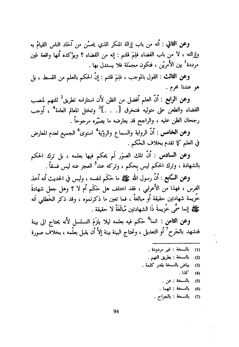وَعَنِ الثَّانِي أَنَّهُ مِنْ بَابِ إِزَالَةِ الْمُنْكَرِ الَّذِي يَحْسُنُ مِنْ آحَادِ النَّاسِ الْقِيَامُ بِهِ وَإِزَالَتُهُ لَا مِنْ بَابِ الْقَضَاءِ فَلِمَ قُلْتُمْ أَنه من الْقَضَاءِ وَيُؤَكِّدُهُ أَنَّهَا وَاقِعَةُ عَيْنٍ مُرَدَّدَةٌ بَيْنَ الْأَمْرَيْنِ فَتَكُونُ مُجْمَلَةً فَلَا يُسْتَدَلُّ بِهَا وَعَنِ الثَّالِثِ الْقَوْلُ بِالْمُوجِبِ فَلِمَ قُلْتُمْ إِنَّ الْحُكْمَ بِالْعلمِ من الْقسْط بل هم عِنْدَنَا مُحَرَّمٌ وَعَنِ الرَّابِعِ أَنَّ الْعِلْمَ أَفْضَلُ من الظَّن لِأَن استلزامه تطريق للتهم لمنصب الْقَضَاء والطعن على متوليه فتنخرق وَتَخْتَلُّ الْمَعَالِمُ الْعَامَّةُ أَوْجَبَ رُجْحَانَ الظَّنِّ عَلَيْهِ وَالرَّاجِحُ قَدْ يُعَارِضُهُ مَا يُصَيِّرُهُ مَرْجُوحًا وَعَنِ الْخَامِسِ أَنَّ الرِّوَايَةَ وَالسَّمَاعَ وَالرُّؤْيَةَ اسْتَوَى الْجَمِيعُ لِعَدَمِ الْمُعَارِضِ فِي الْعِلْمِ كَمَا تَقَدَّمَ بِخِلَافِ الْحُكْمِ وَعَنِ السَّادِسِ أَنَّ تِلْكَ الصُّوَرَ لَمْ يَحْكُمْ فِيهَا بِعِلْمِهِ بَلْ تَرَكَ الْحُكْمَ بِالشَّهَادَةِ وَتَرْكُ الْحُكْمِ لَيْسَ بِحُكْمٍ وَتَرْكُهُ عِنْدَ الْعَجْزِ عَنْهُ لَيْسَ فِسْقًا وَعَنِ السَّابِعِ أَنَّ رَسُولَ اللَّهِ - صَلَّى اللَّهُ عَلَيْهِ وَسَلَّم َ - مَا حَكَمَ لِنَفْسِهِ وَلَيْسَ فِي الْحَدِيثِ أَنَّهُ أَخذ الْفرس فَهَذَا مِنَ الْأَعْرَابِيِّ فَقَدِ اخْتُلِفَ هَلْ حَكَمَ أَمْ لَا وَهَلْ جَعَلَ شَهَادَةَ خُزَيْمَةَ شَهَادَتَيْنِ حَقِيقَةً أَوْ مُبَالَغَةً فَمَا تَعَيَّنَ مَا ذَكَرْتُمُوهُ وَقَدْ ذَكَرَ الْخَطَّابِيُّ أَنَّهُ - صَلَّى اللَّهُ عَلَيْهِ وَسَلَّم َ - إِنَّمَا سَمَّى خُزَيْمَةَ ذَا الشَّهَادَتَيْنِ مُبَالَغَةً لَا حَقِيقَةً وَعَنِ الثَّامِنِ إِنَّمَا حَكَمَ فِيهِ بِعِلْمِهِ لَيْلًا يَلْزَمَ التَّسَلْسُلُ لِأَنَّهُ يَحْتَاجُ إِلَى بَيِّنَةٍ فَتَشْهَدُ بِالْجَرْحِ أَوِ التَّعْدِيلِ وَتَحْتَاجُ الْبَيِّنَةُ بَيِّنَةً إِلَّا أَنْ يَقْبَلَ بِعِلْمِهِ بِخِلَافِ صُورَةِ