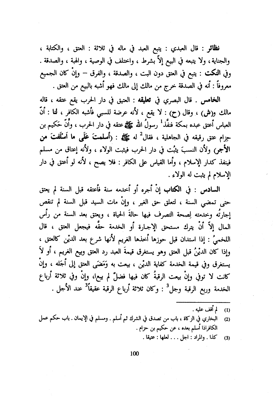 نَظَائِرُ قَالَ الْعَبْدِيُّ يُتْبَعُ الْعَبْدُ فِي مَالِهِ فِي ثَلَاثَةٍ الْعِتْقُ وَالْكِتَابَةُ وَالْجِنَايَةُ وَلَا يَتْبَعُهُ فِي الْبَيْعِ إِلَّا بِشَرْطٍ وَاخْتُلِفَ فِي الْوَصِيَّةِ وَالْهِبَةِ وَالصَّدَقَةِ وَفِي النُّكَتِ يَتْبَعُ فِي الْعِتْقِ دون الْبَتّ وَالصَّدَقَةِ وَالْفَرْقُ وَإِنْ كَانَ الْجَمِيعُ مَعْرُوفًا أَنَّهُ فِي الصَّدَقَةِ خَرَجَ مِنْ مَالِكٍ إِلَى مَالِكٍ فَهُوَ أَشْبَهُ بِالْبَيْعِ مِنَ الْعِتْقِ الْخَامِسُ قَالَ الْبَصْرِيُّ فِي تَعْلِيقِهِ الْعَتِيقُ فِي دَارِ الْحَرْبِ يَقع عتقه قَالَه مَالك وش وَقَالَ ح لَا يَقَعُ لِأَنَّهُ عُرْضَةٌ لِلسَّبْيِ فَأَشْبَهَ الْكَافِرَ لَنَا أَنَّ الْعَبَّاسَ أَعْتَقَ عَبْدَهُ بِمَكَّةَ فَنَفَّذَ رَسُولُ اللَّهِ - صَلَّى اللَّهُ عَلَيْهِ وَسَلَّم َ - عِتْقَهُ فِي دَارِ الْحَرْبِ وَأَنَّ حَكِيمَ بْنَ حِزَامٍ عَتَقَ رَقِيقَهُ فِي الْجَاهِلِيَّةِ فَقَالَ لَهُ - صَلَّى اللَّهُ عَلَيْهِ وَسَلَّم َ - أَسْلَمْتَ عَلَى مَا أَسْلَفْتَ مِنَ الْأَجْرِ وَلِأَنَّ النَّسَبَ يَثْبُتُ فِي دَارِ الْحَرْبِ فَيَثْبُتُ الْوَلَاءُ وَلِأَنَّهُ إِعْتَاقٌ مِنْ مُسْلِمٍ فَيُنَفَّذُ كَدَارِ الْإِسْلَامِ وَأَمَّا الْقِيَاسُ عَلَى الْكَافِرِ فَلَا يَصِحُّ لِأَنَّهُ لَوْ أُعْتِقَ فِي دَارِ الْإِسْلَامِ لَمْ يَثْبُتْ لَهُ الْوَلَاءُ السَّادِسُ فِي الْكِتَابِ إِنْ أَجَّرَهُ أَوْ أَخْدَمَهُ سَنَةً فَأَعْتَقَهُ قَبْلَ السَّنَةِ لَمْ يَعْتِقْ حَتَّى تَمْضِيَ السَّنَةُ لِتَعَلُّقِ حَقِّ الْغَيْرِ وَإِن مَاتَ السَّيِّد قبل السّنة لم تنقص إِجَارَتُهُ وَخِدْمَتُهُ لِصِحَّةِ التَّصَرُّفِ فِيهَا حَالَةَ الْحَيَاةِ وَيَعْتِقُ بَعْدَ السَّنَةِ مِنْ رَأْسِ الْمَالِ إِلَّا أَنْ يَتْرُكَ مُسْتَحِقُّ الْإِجَارَةِ أَوِ الْخِدْمَةِ حَقَّهُ فَيجْعَل الْعِتْقُ قَالَ اللَّخْمِيُّ إِذَا اسْتَدَانَ قَبْلَ حَوْزِهَا أَخَذَهَا الْغَرِيمُ لِأَنَّهَا شَرْعٌ بَعْدَ الدَّيْنِ كَالْعِتْقِ وَإِذَا كَانَ الدَّيْنُ قَبْلَ الْعِتْقِ وَهُوَ يَسْتَغْرِقُ قيمَة العَبْد رد الْعتْق وَبيع الْغَرِيم أَوْ لَا يَسْتَغْرِقُ وَفِي قِيمَةِ الْخِدْمَةِ كِفَايَةُ الدَّيْنِ بِيعَتْ بِهِ وَمَضَى الْعِتْقُ إِلَى أَجَلِهِ وَإِنْ كَانَتْ لَا تُوَفِّي وَإِنْ بِيعَتِ الرَّقَبَةُ كَانَ فِيهَا فضل لم بيع وَإِنْ وَفَّى ثَلَاثَةَ أَرْبَاعِ الْخِدْمَةِ وَرُبُعَ الرَّقَبَةِ وَجل وَكَانَ ثَلَاثَة أَربَاع الرَّقَبَة عقيقاً عِنْد الْأَجَل
