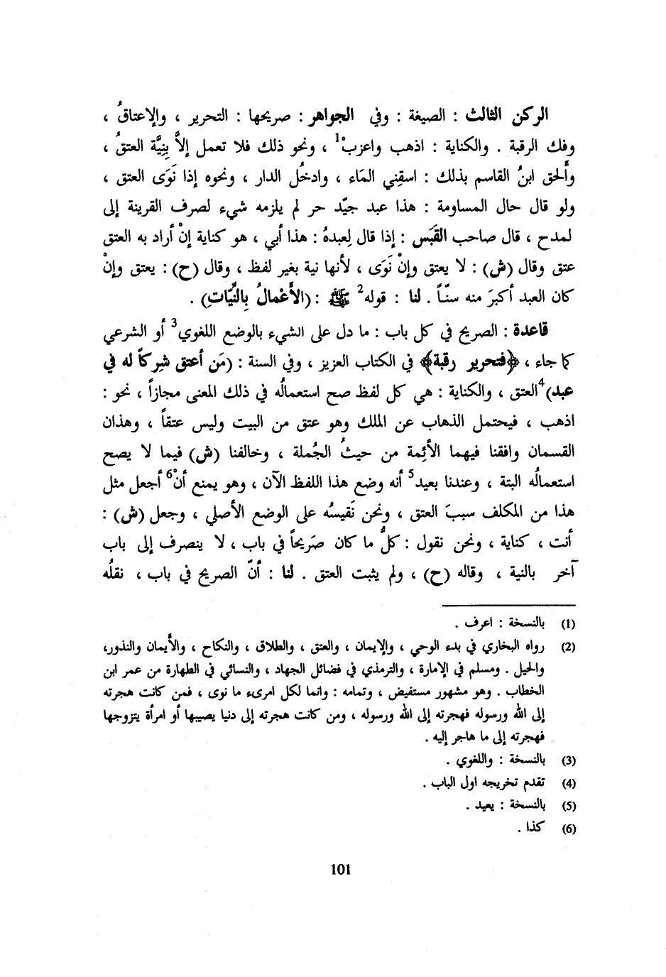الرُّكْن الثَّالِث الصِّيغَة وَفِي الْجَوَاهِرِ صَرِيحُهَا التَّحْرِيرُ وَالْإِعْتَاقُ وَفَكُّ الرَّقَبَةِ وَالْكِنَايَةُ اذْهَبْ وَاعْزُبْ وَنَحْوُ ذَلِكَ فَلَا تُعْمَلُ إِلَّا بَيِّنَة الْعِتْقِ وَأَلْحَقَ ابْنُ الْقَاسِمِ بِذَلِكَ اسْقِنِي الْمَاءَ وَادْخُلِ الدَّارَ وَنَحْوَهُ إِذَا نَوَى الْعِتْقَ وَلَوْ قَالَ حَالَ الْمُسَاوَمَةِ هَذَا عَبْدٌ جَيِّدٌ حُرٌّ لم يلْزمه شَيْء لصرف الْقَرِينَة إِلَى لمدح قَالَ صَاحِبُ الْقَبَسِ إِذَا قَالَ لِعَبْدِهِ هَذَا أَبِي هُوَ كِنَايَةٌ إِنْ أَرَادَ بِهِ الْعِتْقَ عَتَقَ وَقَالَ ش لَا يَعْتِقُ وَإِنْ نَوَى لِأَنَّهَا نِيَّةٌ بِغَيْرِ لَفْظٍ وَقَالَ ح يَعْتِقُ وَإِنْ كَانَ الْعَبْدُ أَكْبَرَ مِنْهُ سِنًّا لَنَا قَوْله - صَلَّى اللَّهُ عَلَيْهِ وَسَلَّم َ - الْأَعْمَالُ بِالنِّيَّاتِ قَاعِدَةٌ الصَّرِيحُ فِي كُلِّ بَابٍ مَا دَلَّ عَلَى الشَّيْءِ بِالْوَضْعِ اللُّغَوِيِّ أَوِ الشَّرْعِيّ كَمَا جَاءَ {فَتَحْرِير رَقَبَة} فِي الْكِتَابِ الْعَزِيزِ وَفِي السُّنَّةِ مَنْ أَعْتَقَ شِرْكًا لَهُ فِي عَبْدٍ الْعِتْقُ وَالْكِنَايَةُ هِيَ كُلُّ لَفْظٍ صَحَّ اسْتِعْمَالُهُ فِي ذَلِكَ الْمَعْنَى مَجَازًا نَحْوَ اذْهَبْ فَيَحْتَمِلُ الذَّهَابَ عَنِ الْمِلْكِ وَهُوَ عِتْقٌ مِنَ الْبَيْتِ وَلَيْسَ عِتْقًا وَهَذَانِ الْقِسْمَانِ وَافَقَنَا فِيهِمَا الْأَئِمَّةُ مِنْ حَيْثُ الْجُمْلَةُ وَخَالَفَنَا ش فِيمَا لَا يَصِحُّ اسْتِعْمَالُهُ أَلْبَتَّةَ وَعِنْدنَا بعيد أَنَّهُ وَضْعُ هَذَا اللَّفْظِ الْآنَ وَهُوَ يَمْنَعُ أَن أجعَل مِثْلَ هَذَا مِنَ الْمُكَلَّفِ سَبَبَ الْعِتْقِ وَنَحْنُ نَقِيسُهُ عَلَى الْوَضْعِ الْأَصْلِىِّ وَجَعَلَ ش أَنْتَ كِنَايَةً وَنَحْنُ نَقُولُ كُلُّ مَا كَانَ صَرِيحًا فِي بَابٍ لَا يَنْصَرِفُ إِلَى بَابٍ آخَرَ بِالنِّيَّةِ وَقَالَهُ ح وَلَمْ يُثْبِتِ الْعِتْقَ لَنَا أَنَّ الصَّرِيحَ فِي بَابٍ نَقْلُهُ