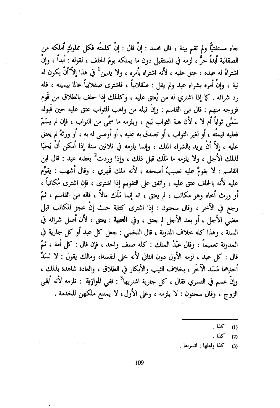 جَاءَ مُسْتَفْتِيًا وَلَمْ تَقُمْ بَيِّنَةٌ قَالَ مُحَمَّدٌ إِنْ قَالَ إِنْ كَلَّمْتُهُ فَكُلُّ مَمْلُوكٍ أَمْلِكُهُ مِنَ الصَّقَالِبَةِ أَبَدًا حُرٌّ لَزِمَهُ فِي الْمُسْتَقْبَلِ دون مَا يملكهُ يَوْم الْحلف لقَوْله أبداو إِن اشْتَرَاهُ لَهُ عَبْدُهُ عَتَقَ عَلَيْهِ لِأَنَّهُ اشْتَرَاهُ بِأَمْرِهِ وَلَا يَدِينُ فِي هَذَا إِلَّا أَنْ يَكُونَ لَهُ نِيَّةٌ وَإِنْ أَمَرَهُ بِشِرَاءِ عَبْدٍ وَلم يقل صقلابيا فَاشْتَرَى صَقْلَابِيًّا عَالِمًا بِيَمِينِهِ فَلَهُ رَدُّ شِرَائِهِ كَمَا إِذَا اشْتُرِيَ لَهُ مَنْ يَعْتِقُ عَلَيْهِ وَكَذَلِكَ إِذا حلف بِالطَّلَاق من قوم فَزَوجهُ مِنْهُمْ قَالَ ابْنُ الْقَاسِمِ وَإِنْ قَبِلَهُ مِنْ وَاهِبٍ لِلثَّوَابِ عَتَقَ عَلَيْهِ حِينَ قَبُولِهِ سَمَّى ثَوَابًا أَمْ لَا لِأَنَّ هِبَةَ الثَّوَابِ بَيْعٌ وَيَلْزَمُهُ مَا سَمَّى مِنَ الثَّوَابِ فَإِنْ لَمْ يُسَمِّ فَعَلَيْهِ قِيمَتُهُ أَوْ لِغَيْرِ الثَّوَابِ أَوْ تُصُدِّقَ بِهِ عَلَيْهِ أَوْ أَوْصَى لَهُ بِهِ أَوْ وَرِثَهُ لَمْ يَعْتِقْ عَلَيْهِ إِلَّا أَنْ يُرِيدَ بِالشِّرَاءِ الْمِلْكَ وَإِنَّمَا يَلْزَمُهُ فِي ثَلَاثِينَ سَنَةً إِذَا أَمْكَنَ أَنْ يَحْيَا لِذَلِكَ الْأَجَلِ وَلَا يَلْزَمُهُ مَا مَلَكَ قَبْلَ ذَلِكَ وَإِذَا وَردت بَعْضَهُ عَبْدٌ قَالَ ابْنُ الْقَاسِمِ لَا يُقَوَّمُ عَلَيْهِ نَصِيبُ أَصْحَابِهِ لِأَنَّهُ مِلْكٌ قَهْرِيٌّ وَقَالَ أَشْهَبُ يُقَوَّمُ عَلَيْهِ لِأَنَّهُ بِالْحَلِفِ عَتَقَ عَلَيْهِ وَاتَّفَقَ عَلَى التَّقْوِيمِ إِذَا اشْتَرَى فَإِنِ اشْتَرَى مُكَاتَبًا أَوْ وَرِثَ أَخَاهُ وَهُوَ مَكَاتَبٌ لَمْ يعْتق انه إِنَّمَا مَلَكَ مَالًا قَالَهُ ابْنُ الْقَاسِمِ ثُمَّ رَجَعَ فِي الْآخَرِ وَقَالَ سَحْنُونٌ إِذَا اشْتَرَى كِتَابَةً حَنِثَ إِنْ عَجَزَ الْمُكَاتَبُ قَبْلَ مُضِيِّ الْأَجَلِ أَوْ بَعْدَ الْأَجَلِ لَمْ يَعْتِقْ وَفِي الْعُتْبِيَّةِ يَعْتِقُ لِأَنَّ أَصْلَ شِرَائِهِ فِي السُّنَّةِ وَهَذَا كُلُّهُ خِلَافُ الْمُدَوَّنَةِ قَالَ اللَّخْمِيُّ جَعَلَ كُلَّ عَبْدٍ أَوْ كُلَّ جَارِيَةٍ فِي الْمُدَوَّنَةِ تَعْمِيمًا وَقَالَ عَبْدُ الْمَلِكِ كُلُّهُ صِنْفٌ وَاحِدٌ فَإِنْ قَالَ كُلُّ أَمَةٍ ثُمَّ قَالَ كُلُّ عَبْدٍ لَزِمَهُ الْأَوَّلُ دُونَ الثَّانِي لِأَنَّهُ خَلَّى لنَفسِهِ وَمَالك يَقُول لَا لسد أَحَدُهُمَا مَسَدَّ الْآخَرِ بِخِلَافِ الثَّيِّبِ وَالْأَبْكَارِ فِي الطَّلَاق وَالْعَادَة شاهدة بذلك وَإِن عَمَّمَ فِي التَّسَرِّي فَقَالَ كُلُّ جَارِيَةٍ أَشْتَرِيهَا فَفِي الْمَوَّازِيَّةِ تَلْزَمُهُ لِأَنَّهُ أَبْقَى الزَّوْجَ وَقَالَ سَحْنُونٌ لَا يَلْزَمُهُ وَعَلَى الْأَوَّلِ لَا يَمْتَنِعُ ملكهن للْخدمَة