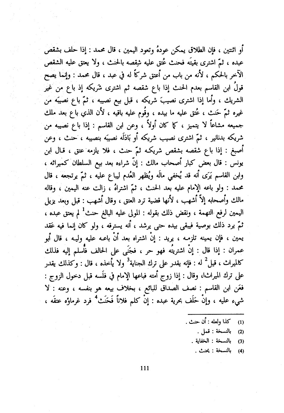 أَوِ اثْنَتَيْنِ فَإِنَّ الطَّلَاقَ يُمْكِنُ عَوْدُهُ وَتَعُودُ الْيَمِينُ قَالَ مُحَمَّدٌ إِذَا حَلَفَ بِشِقْصِ عَبْدِهِ ثُمَّ اشْتَرَى بَقِيَّتَهُ فَحَنِثَ عَتَقَ عَلَيْهِ شِقْصُهُ بِالْحِنْثِ وَلَا يَعْتِقُ عَلَيْهِ الشِّقْصُ الْآخَرُ بِالْحُكْمِ لِأَنَّهُ مِنْ بَابِ مَنْ أَعْتَقَ شِرْكًا لَهُ فِي عَبْدٍ قَالَ مُحَمَّدٌ وَإِنَّمَا يَصِحُّ قَوْلُ ابْنِ الْقَاسِمِ بِعَدَمِ الْحِنْثِ إِذَا بَاعَ شِقْصَهُ ثمَّ اشْترى شَرِيكه إِذا بَاعَ مِنْ غَيْرِ الشَّرِيكِ وَأَمَّا إِذَا اشْتَرَى نَصِيبَ شَرِيكِهِ قَبْلَ بَيْعِ نَصِيبِهِ ثُمَّ بَاعَ نَصِيبَهُ مِنْ غَيْرِهِ ثُمَّ حَنِثَ عَتَقَ عَلَيْهِ مَا بِيَدِهِ وَقُوِّمَ عَلَيْهِ بَاقِيهِ لِأَنَّ الَّذِي بَاعَ بعد ملك جَمِيعه مشَاعا لَا يَتَمَيَّزُ كَمَا كَانَ أَوَّلًا وَعَنِ ابْنِ الْقَاسِمِ إِذَا بَاعَ نَصِيبَهُ مِنْ شَرِيكِهِ بِدَنَانِيرَ ثُمَّ اشْتَرَى نَصِيبَ شَرِيكِهِ أَوْ بَادَلَهُ نَصِيبَهُ بِنَصِيبِهِ حَنِثَ وَعَنْ أَصْبَغَ إِذَا بَاعَ شِقْصَهُ بِشِقْصِ شَرِيكِهِ ثُمَّ حَنِثَ فَلَا يَلْزَمُهُ عِتْقٌ قَالَ ابْنُ يُونُسَ قَالَ بَعْضُ كِبَارِ أَصْحَابِ مَالك إِن شِرَاؤُهُ بَعْدَ بَيْعِ السُّلْطَانِ كَمِيرَاثِهِ وَابْنُ الْقَاسِمِ يَرَى أَنَّهُ قَدْ يُخْفِي مَالَهُ وَيُظْهِرُ الْعَدَمَ لِيُبَاعَ عَلَيْهِ ثُمَّ يَرْتَجِعُهُ قَالَ مُحَمَّدٌ وَلَوْ بَاعَهُ الْإِمَامُ عَلَيْهِ بَعْدَ الْحِنْثِ ثُمَّ اشْتَرَاهُ زَالَتْ عَنْهُ الْيَمِينُ وَقَالَهُ مَالِكٌ وَأَصْحَابُهُ إِلَّا أَشْهَبَ لِأَنَّهَا قَضِيَّةٌ تَرُدُّ الْعِتْقَ وَقَالَ أَشْهَبُ قَبْلُ وَبَعْدُ يُزِيلُ الْيَمِينَ لِرَفْعِ التُّهْمَةِ وَنُقِضَ ذَلِكَ بِقَوْلِهِ الْمُوَلَّى عَلَيْهِ الْبَالِغُ حَنِثَ لَمْ يَعْتِقْ عَبْدُهُ ثُمَّ يَرُدُّ ذَلِكَ بِوَصِيَّةٍ فَيَبْقَى بِيَدِهِ حَتَّى يَرْشَدَ أَنَّهُ يَسْتَرِقُّهُ وَلَوْ كَانَ إِنَّمَا فِيهِ عَقْدُ يَمِينٍ فَإِنَّ يَمِينَهُ تَلْزَمُهُ يُرِيدُ إِنِ اشْتَرَاهُ بَعْدَ أَنْ بَاعَهُ عَلَيْهِ وَلَيُّهُ قَالَ أَبُو عِمْرَانَ إِذَا قَالَ إِنِ اشْتَرَيْتُهُ فَهُوَ حُرٌّ فَجَنَى عَلَى الْحَالِفِ فَأَسْلَمَ إِلَيْهِ فَذَلِكَ كَالْمِيرَاثِ قِيلَ لَهُ فَإِنَّهُ يَقْدِرُ عَلَى تَرْكِ الْجِنَايَةِ وَلَا يَأْخُذُهُ قَالَ وَكَذَلِكَ يَقْدِرُ عَلَى تَرْكِ الْمِيرَاثِ وَقَالَ إِذَا زَوَّجَ أَمَتَهُ فَبَاعَهَا الْإِمَامُ فِي فَلَسِهِ قَبْلَ دُخُولِ الزَّوْجِ فَعَنِ ابْنِ الْقَاسِمِ نِصْفُ الصَّدَاقِ لِلْبَائِعِ بِخِلَافِ بَيْعه هُوَ بِنَفسِهِ وَعَنْهُ لَا شَيْءَ عَلَيْهِ وَإِنْ حَلَفَ بِحُرِّيَّةِ عَبْدِهِ إِنْ كَلَّمَ فُلَانًا فَحَنِثَ فَرَدَّ غُرَمَاؤُهُ عتقه