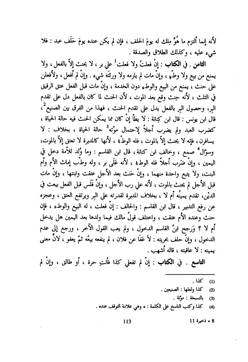 لِأَنَّهُ إِنَّمَا الْتَزَمَ مَا هُوَ مِلْكٌ لَهُ يَوْمَ الْحَلِفِ فَإِنْ لَمْ يَكُنْ عِنْدَهُ يَوْمَ حَلَفَ عَبْدٌ فَلَا شَيْءَ عَلَيْهِ وَكَذَلِكَ الطَّلَاقُ وَالصَّدَقَةُ الثَّامِنُ فِي الْكِتَابِ إِنْ فَعَلْتُ وَلَا فَعَلْتُ عَلَيَّ بِرٌّ لَا يَحْنَثُ إِلَّا بِالْفِعْلِ وَلَا يَمْنَعُ مِنْ بَيْعٍ وَلَا وَطْءٍ وَإِنْ مَاتَ لَمْ يَلْزَمْهُ وَلَا وَرَثَتَهُ شَيْءٌ وَإِنْ لَمْ أَفْعَلْ وَلَأَفْعَلَنَّ عَلَى حِنْثٍ يُمْنَعُ مِنَ الْبَيْعِ وَالْوَطْءِ دُونَ الْخِدْمَةِ وَإِنْ مَاتَ قَبْلَ الْفِعْلِ عَتَقَ الرَّقِيقُ فِي الثُّلُثِ لِأَنَّهُ حِنْثٌ وَقد بقع الْمَوْتِ لِأَنَّ الْحِنْثَ لَمَّا كَانَ بِالْفِعْلِ دَلَّ عَلَى تَقَدُّمِ الْبِرِّ وَحُصُولُ الْبِرِّ بِالْفِعْلِ يَدُلُّ عَلَى تَقَدُّمِ الْحِنْثِ فَهَذَا مِنَ الْفَرْقِ بَيْنَ الصَّنِيع قَالَ ابْنُ يُونُسَ قَالَ ابْنُ كِنَانَةَ لَا يَطَأُ إِنْ كَانَ مِمَّا يُمْكِنُ الْحِنْثُ فِيهِ حَالَةَ الْحَيَاةِ كَضَرْبِ الْعَبْدِ وَلَمْ يَضْرِبْ أَجَلًا لِاحْتِمَالِ مَوْتِهِ حَالَةَ الْحَيَاةِ بِخِلَافِ لَا يُسَافِرْنَ فَإِنَّهُ لَا يَحْنَثُ إِلَّا بِالْمَوْتِ فَلَهُ الْوَطْءُ لِأَنَّهَا كَالْمُدَبَّرَةِ لَا تَعْتِقُ إِلَّا بِالْمَوْتِ وَسُؤَالُ صمع وَخَالَفَ ابْنُ كِنَانَةَ قَالَ ابْنُ الْقَاسِمِ وَمَا وُلِدَ لِلْأَمَةِ دَخَلَ فِي الْيَمِينِ وَإِنْ ضَرَبَ أَجَلًا فَلَهُ الْوَطْءُ لِأَنَّهُ عَلَى بِرٍّ وَلَهُ وط ب إماث الْأُمِّ وَأُمِّ الْبِنْتِ وَلَا يَتْبَعُ وَاحِدَةً مِنْهُمَا وَإِنْ حَنِثَ بَعْدَ الْأَجَلِ عَتَقَتْ وَابْنَتَهَا وَإِنْ مَاتَ قَبْلَ الْأَجَلِ لَمْ يَحْنَثْ بِالْمَوْتِ لِأَنَّهُ عَلَى رَبِّ الْأَجَلِ وَإِنْ فَلَّسَ قَبْلَ الْفِعْلِ بِيعَتْ فِي الدَّيْنِ تَقَدَّمَ يَمِينُهُ أَمْ لَا بِخِلَافِ الْمُدَبَّرَةِ لِقُدْرَتِهِ عَلَى الْبِرِّ وَيَرْتَفِعُ الْعِتْقُ وَعَجْزُهُ عَنْ رَفْعِ التَّدْبِيرِ قَالَ ابْنُ الْقَاسِمِ وَالْحَالِفُ إِنْ فَعَلْتُ لَهُ الْبَيْعُ وَالْوَطْءُ فَإِنْ حَنِثَ وَعِنْدَهُ الْأُمُّ عَتَقَتْ وَاخْتَلَفَ قَوْلُ مَالِكٍ فِيمَا وَلَدَهَا بَعْدَ الْيَمِينِ هَلْ يَدْخُلُ أَمْ لَا وَرَجَّحَ ابْنُ الْقَاسِمِ الدُّخُولَ وَلَمْ يَعِبِ الْقَوْلَ الْآخَرَ وَرَجَعَ إِلَى عَدَمِ الدُّخُولِ وَإِنْ حَلَفَ بِحُرِّيَّتِهِ لَا عَفَا عَنْ فُلَانٍ لَمْ يَنْفَعْهُ بَيْعُهُ ثُمَّ يَعْفُو لِأَنَّ مَعْنَى يَمِينِهِ لَا عَاقَبْتُهُ قَالَهُ أَشْهَبُ التَّاسِعُ فِي الْكِتَابِ إِنْ لَمْ تَفْعَلِي كَذَا فَأَنْتِ حُرَّةٌ أَوْ طَالِقٌ وَإِنْ لَمْ