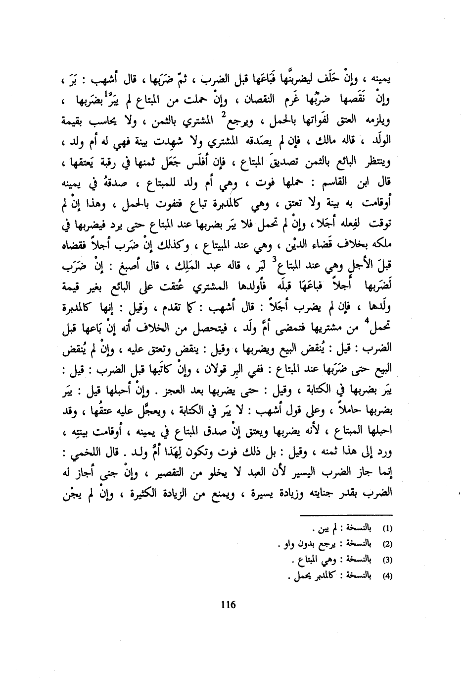 يَمِينِهِ وَإِنْ حَلَفَ لَيَضْرِبَنَّهَا فَبَاعَهَا قَبْلَ الضَّرْبِ ثُمَّ ضَرَبَهَا قَالَ أَشْهَبُ بَرَّ وَإِنْ نَقَصَهَا ضَرْبَهَا غَرِمَ النُّقْصَانَ وَإِنْ حَمَلَتْ مِنَ الْمُبْتَاعِ لَمْ يَبِرَّ بِضَرْبِهَا وَيَلْزَمُهُ الْعِتْقُ لِفَوَاتِهَا بِالْحَمْلِ وَيَرْجِعُ الْمُشْتَرِي بِالثَّمَنِ وَلَا يُحَاسَبْ بِقِيمَةِ الْوَلَدِ قَالَهُ مَالِكٌ فَإِنْ لَمْ يُصَدِّقْهُ الْمُشْتَرِي وَلَا شَهِدَتْ بَيِّنَةٌ فَهِيَ لَهُ أُمُّ وَلَدٍ وَيَنْتَظِرُ الْبَائِعُ بِالثَّمَنِ تَصْدِيقَ الْمُبْتَاعِ فَإِنْ أَفْلَسَ جَعَلَ ثَمَنَهَا فِي رَقَبَةٍ يُعْتِقُهَا قَالَ ابْنُ الْقَاسِمِ حَمْلُهَا فَوْتٌ وَهِيَ أُمُّ وَلَدٍ لِلْمُبْتَاعِ صَدَّقَهُ فِي يَمِينِهِ أَوَ قَامَتْ بِهِ بَيِّنَةٌ وَلَا تَعْتِقُ وَهِيَ كَالْمُدَبَّرَةِ تُبَاعُ فَتَفُوتُ بِالْحَمْلِ وَهَذَا إِنْ لَمْ تُوَقِّتْ لِفِعْلِهِ أَجَلًا وَإِنْ لَمْ تَحْمِلْ فَلَا يَبِرُّ بِضَرْبِهَا عِنْدَ الْمُبْتَاعِ حَتَّى يرد فَيَضْرِبُهَا فِي مِلْكِهِ بِخِلَافِ قَضَاءِ الدَّيْنِ وَهِيَ عِنْد المبيتاع وَكَذَلِكَ إِنْ ضَرَبَ أَجَلًا فَقَضَاهُ قَبْلَ الْأَجَلِ وَهِيَ عِنْدَ الْمُبْتَاعِ لَبَرَّ قَالَهُ عَبْدُ الْمَلِكِ قَالَ أَصْبَغُ إِنْ ضَرَبَ لِضَرْبِهَا أَجَلًا فَبَاعَهَا قَبْلَهُ فَأَوْلَدَهَا الْمُشْتَرِي عَتَقَتْ عَلَى الْبَائِعِ بِغَيْرِ قِيمَةِ وَلَدِهَا فَإِنْ لَمْ يَضْرِبْ أَجَلًا قَالَ أَشْهَبُ كَمَا تَقَدَّمَ وَقِيلَ إِنَّهَا كَالْمُدَبَّرَةِ تَحْمِلُ مِنْ مُشْتَرِيهَا فَتَمْضِي أُمَّ وَلَدٍ فَيَتَحَصَّلُ مِنَ الْخِلَافِ أَنَّهُ إِنْ بَاعَهَا قَبْلَ الضَّرْبِ قِيلَ يَنْقُضُ الْبَيْعَ وَيَضْرِبُهَا وَقِيلَ يَنْقُضُ وَتَعْتِقُ عَلَيْهِ وَإِنْ لَمْ يَنْقُضِ الْبَيْعَ حَتَّى ضَرَبَهَا عِنْدَ الْمُبْتَاعِ فَفِي الْبِرِّ قَوْلَانِ وَإِنْ كَاتَبَهَا قَبْلَ الضَّرْبِ قِيلَ يَبِرُّ بِضَرْبِهَا فِي الْكِتَابَةِ وَقِيلَ حَتَّى يَضْرِبَهَا بَعْدَ الْعَجْزِ وَإِنْ أَحْبَلَهَا قِيلَ يَبِرُّ بِضَرْبِهَا حَامِلًا وَعَلَى قَوْلِ أَشْهَبَ لَا يَبِرُّ فِي الْكِتَابَةِ وَيُعَجَّلُ عَلَيْهِ عِتْقُهَا وَقَدْ أَحْبَلَهَا الْمُبْتَاعُ لِأَنَّهُ يَضْرِبُهَا وَيُعْتِقُ إِنْ صَدَقَ الْمُبْتَاعُ فِي يَمِينِهِ أَوْ قَامَتْ بَيِّنَتُهُ وَرَدَّ إِلَى هَذَا ثَمَنَهُ وَقِيلَ بَلْ ذَلِكَ فَوْتٌ وَتَكُونُ لِهَذَا أُمَّ وَلَدٍ قَالَ اللَّخْمِيُّ إِنَّمَا جَازَ الضَّرْبُ الْيَسِيرُ لِأَنَّ الْعَبْدَ لَا يَخْلُو مِنَ التَّقْصِيرِ وَإِنْ جَنَى أَجَازَ لَهُ الضَّرْبَ بِقَدْرِ جِنَايَتِهِ وَزِيَادَةٍ يَسِيرَةٍ وَيُمْنَعُ مِنَ الزِّيَادَةِ الْكَثِيرَة وَإِن لم يجن