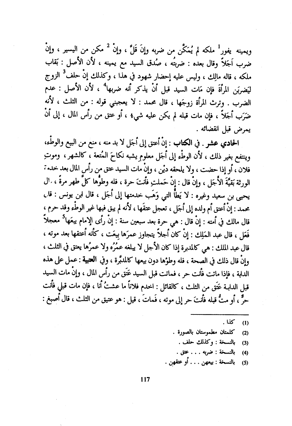 وَيَمِينه يفور مِلْكَهُ لَمْ يُمَكَّنْ مِنْ ضَرْبِهِ وَإِنْ قَلَّ وَإِنْ مُكِّنَ مِنَ الْيَسِيرِ وَإِنْ ضَرَبَ أَجَلًا وَقَالَ بَعْدَهُ ضَرَبْتُهُ صُدِّقَ السَّيِّدُ مَعَ يَمِينِهِ لِأَن الأَصْل بقاب مِلْكِهِ قَالَهُ مَالِكٌ وَلَيْسَ عَلَيْهِ إِحْضَارُ شُهُودٍ فِي هَذَا وَكَذَلِكَ إِنْ حَلَفَ الزَّوْجُ لَيَضْرِبَنَّ الْمَرْأَةَ فَإِنْ مَاتَ السَّيِّدُ قَبْلَ أَنْ يَذْكُرَ أَنه ضربهَا لِأَن الأَصْل عدم الضَّرْب وترث الْمَرْأَةُ زَوْجَهَا قَالَ مُحَمَّدٌ لَا يُعْجِبُنِي قَوْلَهُ مِنَ الثُّلُثِ لِأَنَّهُ ضَرَبَ أَجَلًا فَإِنْ مَاتَ قَبْلَهُ لَمْ يَكُنْ عَلَيْهِ شَيْءٌ أَوْ عَتَقَ مِنْ رَأْسِ الْمَالِ إِلَى أَنْ يَمْرَضَ قَبْلَ انْقِضَائِهِ الْحَادِي عَشَرَ فِي الْكِتَابِ إِنْ أَعْتَقَ إِلَى أجل لابد مِنْهُ مَنَعَ مِنَ الْبَيْعِ والْوَطْءِ وَيَنْتَفِعُ بِغَيْرِ ذَلِكَ لِأَنَّ الْوَطْءَ إِلَى أَجَلٍ مَعْلُومٍ يُشْبِهُ نِكَاحَ الْمُتْعَةِ كَالشَّهْرِ وَمَوْتِ فُلَانٍ أَوْ إِذَا حِضْتِ وَلَا يَلْحَقُهُ دَيْنٌ وَإِنْ مَاتَ السَّيِّدُ عَتَقَ مِنْ رَأْسِ الْمَالِ بَعْدَ خِدْمَةِ الْوَرَثَةِ بَقِيَّةَ الْأَجَلِ وَإِنْ قَالَ إِنْ حَمَلْتِ فَأَنْتِ حُرَّةٌ فَلَهُ وَطْؤُهَا كُلَّ طُهْرٍ مَرَّةً قَالَ يَحْيَى بْنُ سَعِيدٍ وَغَيْرُهُ لَا يَطَأُ الَّتِي وَهَبَ خِدْمَتَهَا إِلَى أَجَلٍ قَالَ ابْنُ يُونُسَ قَالَ مُحَمَّدٌ إِنْ أَعْتَقَ أُمَّ وَلَدِهِ إِلَى أَجَلٍ تَعَجَّلَ عِتْقَهَا لِأَنَّهُ لَمْ يَبْقَ فِيهَا غَيْرُ الْوَطْءِ وَقَدْ حَرُمَ قَالَ مَالِكٌ فِي أَمَتِهِ إِنْ قَالَ هِيَ حُرَّةٌ بَعْدَ سَبْعِينَ سَنَةً إِنْ رَأَى الْإِمَامُ بَيْعَهَا مُعَجِّلًا فَعَلَ قَالَ عَبْدُ الْمَلِكِ إِنْ كَانَ أَجَلًا يَتَجَاوَزُ عُمُرَهَا بِيعَتْ كَأَنَّهُ أَعْتَقَهَا بَعْدَ مَوْتِهِ قَالَ عَبْدُ الْمَلِكِ هِيَ كَالْمُدَبَّرَةِ إِذَا كَانَ الْأَجَلُ لَا يبلغهُ عمره وَلَا عمرها يعْتق فِي الثُّلُثِ وَإِنْ قَالَ ذَلِكَ فِي الصِّحَّةِ فَلَهُ وَطْؤُهَا دون بيعهَا كالمدبرة وَفِي الْعُتْبِيَّة عمل عَلَى هَذِهِ الدَّابَّةِ فَإِذَا مَاتَتْ فَأَنْتَ حُرٌّ فَمَاتَتْ قَبْلَ السَّيِّدِ عَتَقَ مِنْ رَأْسِ الْمَالِ وَإِنْ مَاتَ السَّيِّدُ قَبْلَ الدَّابَّةِ عَتَقَ مِنَ الثُّلُثِ كَالْقَائِلِ اخْدِمْ فُلَانًا مَا عِشْتُ أَنَا فَإِنْ مَاتَ قَبْلِي فَأَنْتَ حُرٌّ أَوْ مُتُّ قَبْلَهُ فَأَنْتَ حُرٌّ إِلَى مَوْتِهِ فَمَاتَ قِيلَ هُوَ عَتِيقٌ مِنَ الثُّلُثِ قَالَ أَصْبَغُ