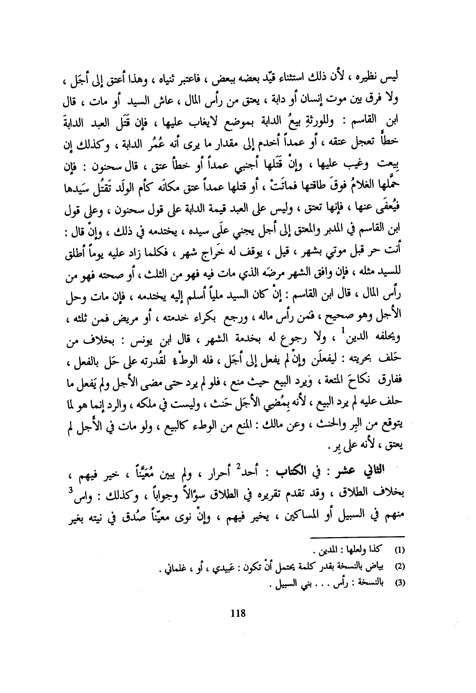 لَيْسَ نَظِيرَهُ لِأَنَّ ذَلِكَ اسْتِثْنَاءٌ قُيِّدَ بَعْضُهُ بِبَعْضٍ فَاعْتُبِرَ ثِنْيَاهُ وَهَذَا أَعْتَقَ إِلَى أَجَلٍ وَلَا فَرْقَ بَيْنَ مَوْتِ إِنْسَانٍ أَوْ دَابَّةٍ يَعْتِقُ مِنْ رَأْسِ الْمَالِ عَاشَ السَّيِّدُ أَوْ مَاتَ قَالَ ابْنُ الْقَاسِمِ وَلِلْوَرَثَةِ بِيعُ الدَّابَّةِ بِمَوْضِعٍ لَا يُغَابُ عَلَيْهَا فَإِنْ قَتَلَ الْعَبْدُ الدَّابَّةَ خَطَأً تُعُجِّلَ عِتْقُهُ أَوْ عَمْدًا أَخْدَمَ إِلَى مِقْدَارِ مَا يُرَى أَنَّهُ عُمْرُ الدَّابَّةِ وَكَذَلِكَ إِنْ بِيعَتْ وَغِيبَ عَلَيْهَا وَإِنْ قَتَلَهَا أَجْنَبِيٌّ عَمْدًا أَوْ خَطَأً عَتَقَ قَالَ سَحْنُونٌ فَإِنْ حَمَّلَهَا الْغُلَامُ فَوْقَ طَاقَتِهَا فَمَاتَتْ أَوْ قَتَلَهَا عَمْدًا عَتَقَ مَكَانَهُ كَأُمِّ الْوَلَدِ تَقْتُلُ سَيِّدَهَا فَيُعْفَى عَنْهَا فَإِنَّهَا تَعْتِقُ وَلَيْسَ عَلَى الْعَبْدِ قِيمَةُ الدَّابَّةِ عَلَى قَوْلِ سَحْنُونٍ وَعَلَى قَوْلِ ابْنِ الْقَاسِمِ فِي الْمُدَبَّرِ وَالْمُعْتَقِ إِلَى أَجَلٍ يَجْنِي عَلَى سَيِّدِهِ يَخْتَدِمُهُ فِي ذَلِكَ وَإِنْ قَالَ أَنْتَ حُرٌّ قَبْلَ مَوْتِي بِشَهْرٍ قِيلَ يُوقَفُ لَهُ خَرَاجُ شَهْرٍ فَكُلَّمَا زَادَ عَلَيْهِ يَوْمًا أُطْلِقَ لِلسَّيِّدِ مِثْلُهُ فَإِنْ وَافَقَ الشَّهْرَ مَرَضُهُ الَّذِي مَاتَ فِيهِ فَهُوَ مِنَ الثُّلُثِ أَوْ صِحَّتُهُ فَهُوَ مِنْ رَأْسِ الْمَالِ قَالَ ابْنُ الْقَاسِمِ إِنْ كَانَ السَّيِّدُ مَلِيًّا أسلم إِلَيْهِ يختدمه فَإِنْ مَاتَ وَحَلَّ الْأَجَلُ وَهُوَ صَحِيحٌ فَمِنْ رَأْسِ مَالِهِ وَرَجَعَ بِكِرَاءِ خِدْمَتِهِ أَوْ مَرِيضٍ فَمِنْ ثُلُثِهِ وَيُحَلِّفُهُ الدَّيْنَ وَلَا رُجُوعَ لَهُ بِخِدْمَةِ الشَّهْرِ قَالَ ابْنُ يُونُسَ بِخِلَافِ مَنْ حَلَفَ بِحُرِّيَّتِهِ لِيَفْعَلَنَّ وَإِنْ لَمْ يَفْعَلْ إِلَى أجل فَلهُ الْوَطْء لقدرته على حل بِالْفِعْلِ فَفَارَقَ نِكَاحَ الْمُتْعَةِ وَيُرَدُّ الْبَيْعُ حَيْثُ مَنَعَ فَلَوْ لَمْ يُرَدَّ حَتَّى مَضَى الْأَجَلُ وَلَمْ يَفْعَلْ مَا حَلَفَ عَلَيْهِ لَمْ يُرَدَّ الْبَيْعُ لِأَنَّهُ بِمُضِيِّ الْأَجَلِ حَنِثَ وَلَيْسَتْ فِي مِلْكِهِ وَالرَّدُّ إِنَّمَا هُوَ لِمَا يُتَوَقَّعُ مِنَ الْبِرِّ وَالْحِنْثِ وَعَنْ مَالِكٍ الْمَنْعُ مِنَ الْوَطْءِ كَالْبَيْعِ وَلَوْ مَاتَ فِي الْأَجَلِ لَمْ يَعْتِقْ لِأَنَّهُ عَلَى بِرٍّ الثَّانِي عَشَرَ فِي الْكِتَابِ أحد أَحْرَار وَلَمْ يُبَيِّنْ مُعَيَّنًا خُيِّرَ فِيهِمْ بِخِلَافِ الطَّلَاقِ وَقَدْ تَقَدَّمَ تَقْرِيرُهُ فِي الطَّلَاقِ سُؤَالًا وَجَوَابًا وَكَذَلِكَ واس مِنْهُمْ فِي السَّبِيلِ أَوِ الْمَسَاكِينِ يُخَيَّرُ فِيهِمْ وَإِنْ نَوَى مُعَيَّنًا صُدِّقَ فِي نِيَّتِهِ بِغَيْرِ
